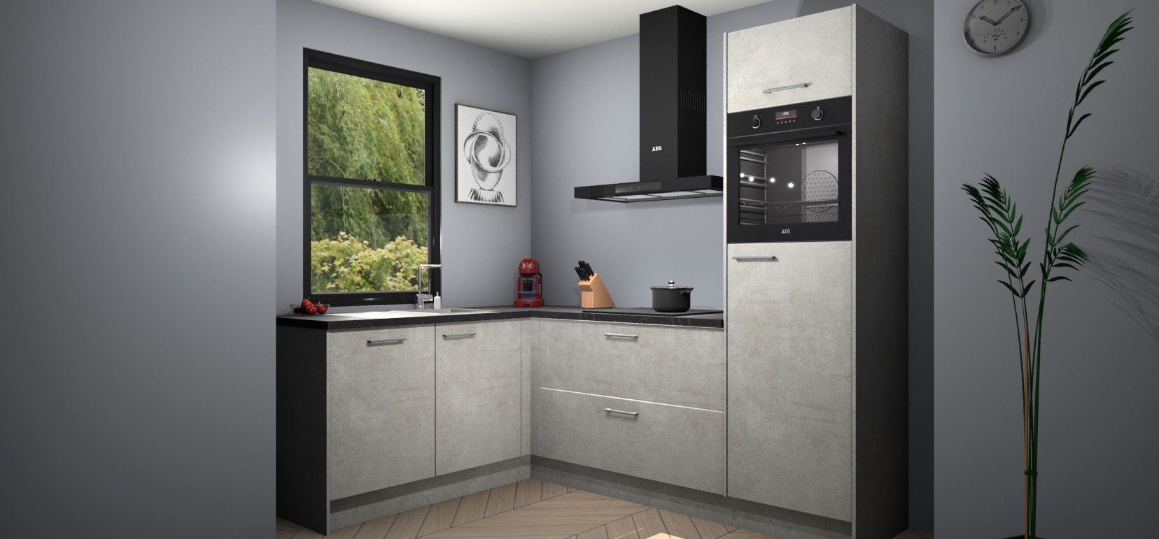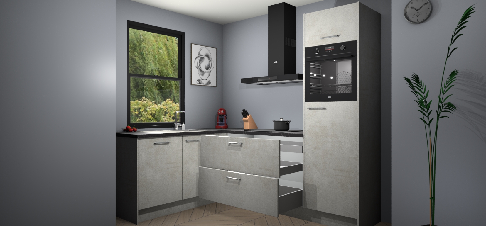Deze prachtige hoekkeuken heeft alle benodigdheden om uw droomkook- en eetruimte compleet te maken. De Beton Opaal kasten bieden een echo van raffinement, terwijl de 5 inbouwapparaten genoeg opties bieden voor het bereiden van heerlijke maaltijden. De oven, inductiekookplaat, afzuigkap, vaatwasser en koelkast zorgen ervoor dat u tijd in de keuken zo efficiënt mogelijk verloopt, terwijl ze ook dat extra vleugje luxe bieden.