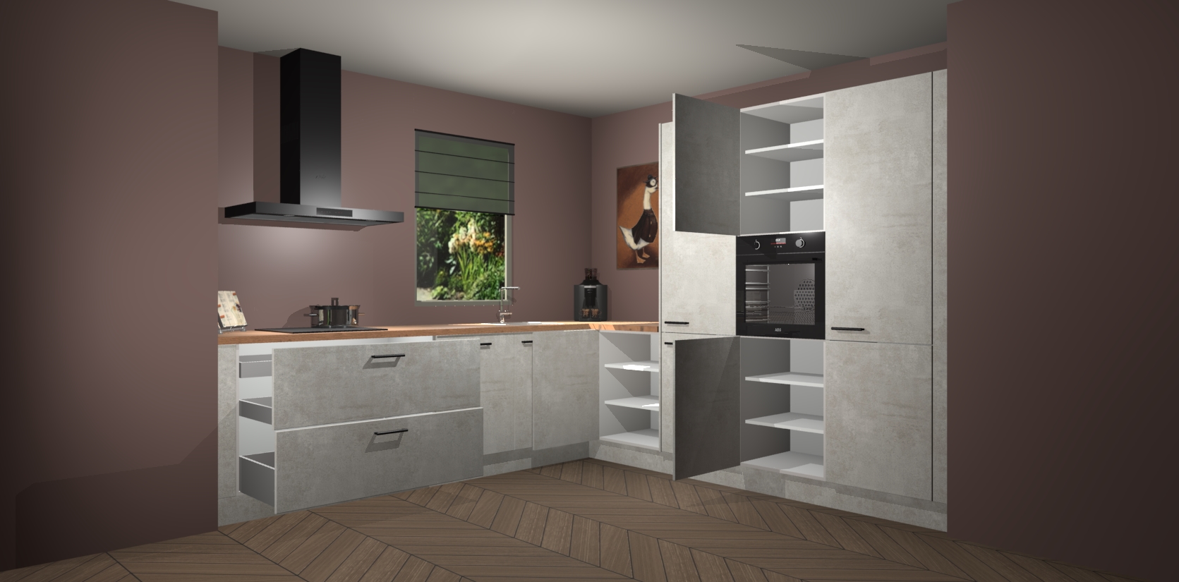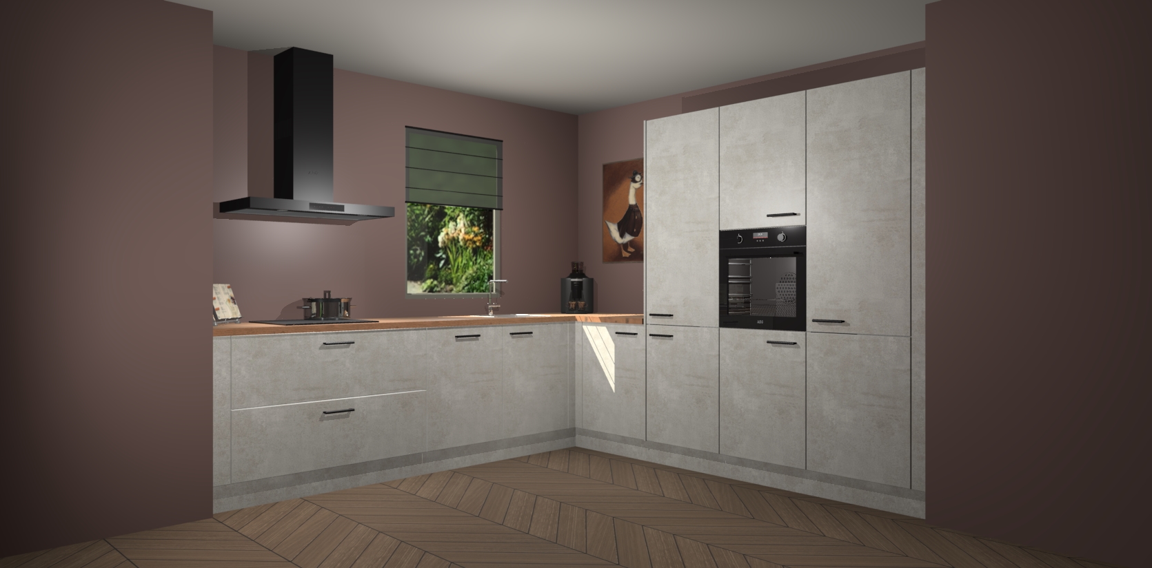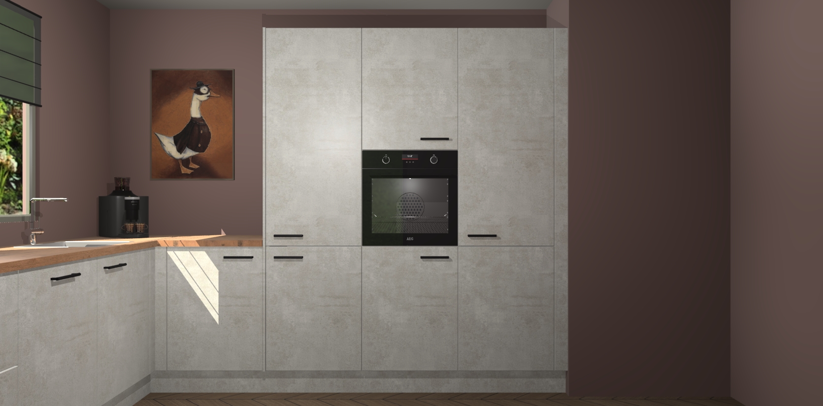 Welkom bij de Beton Opaal keuken Laos. Deze prachtige keuken zal de komende jaren het middelpunt van de belangstelling in uw huis zijn. Uitgerust met vijf inbouwapparaten komt u nooit kookgereedschap tekort. Bovendien geeft de warme houtlook elke ruimte een uitnodigende en tijdloze uitstraling.