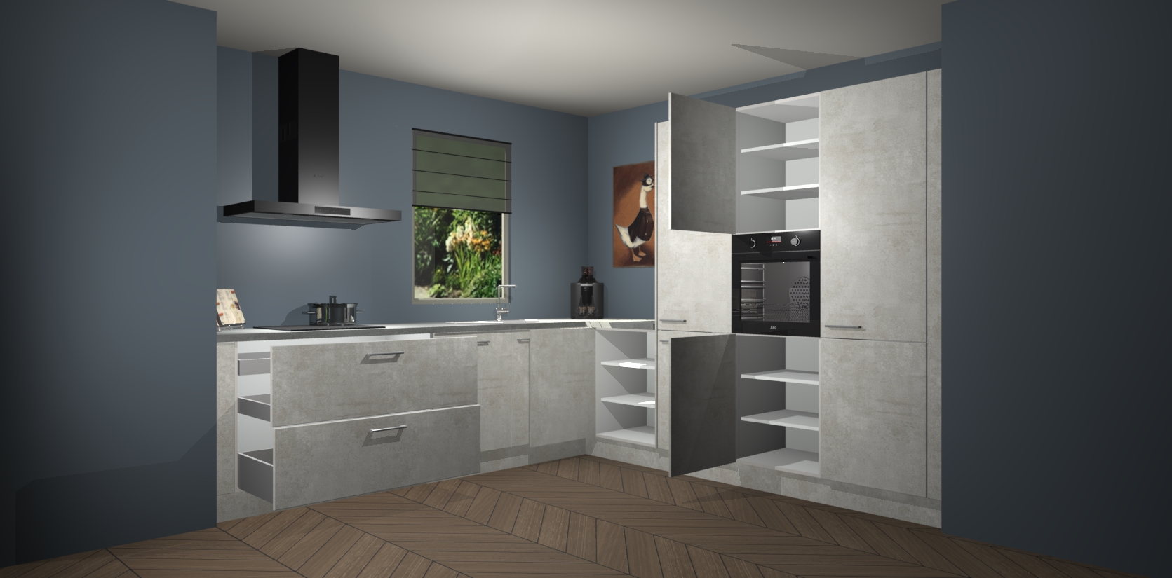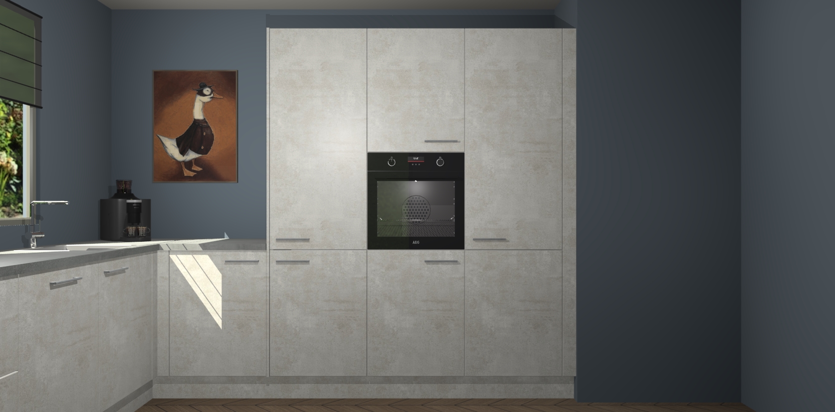 Welkom bij de Beton Opaal keuken Laos. Deze prachtige keuken zal de komende jaren het middelpunt van de belangstelling in uw huis zijn. Uitgerust met vijf inbouwapparaten komt u nooit kookgereedschap tekort. Bovendien geeft de warme houtlook elke ruimte een uitnodigende en tijdloze uitstraling.