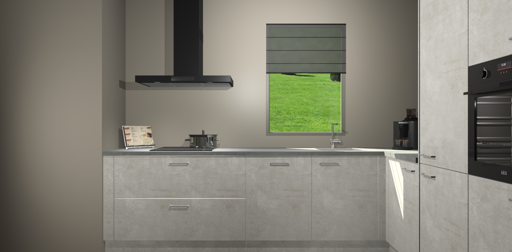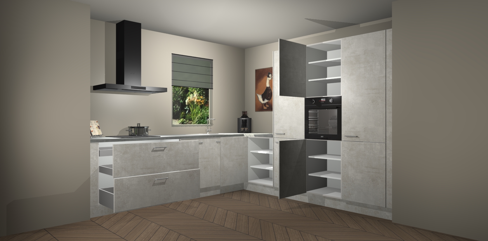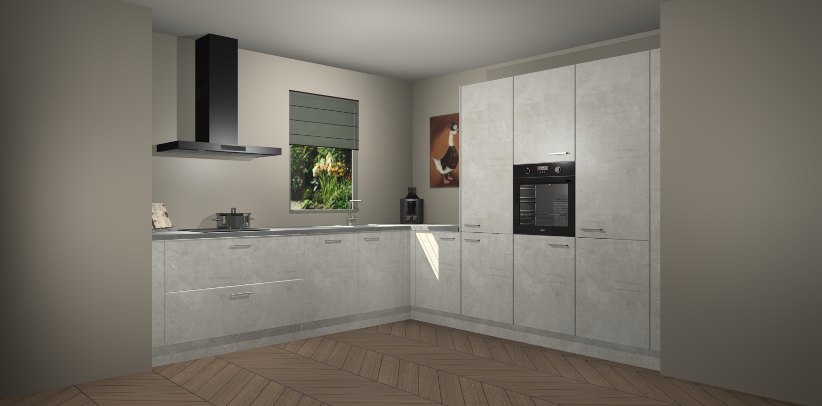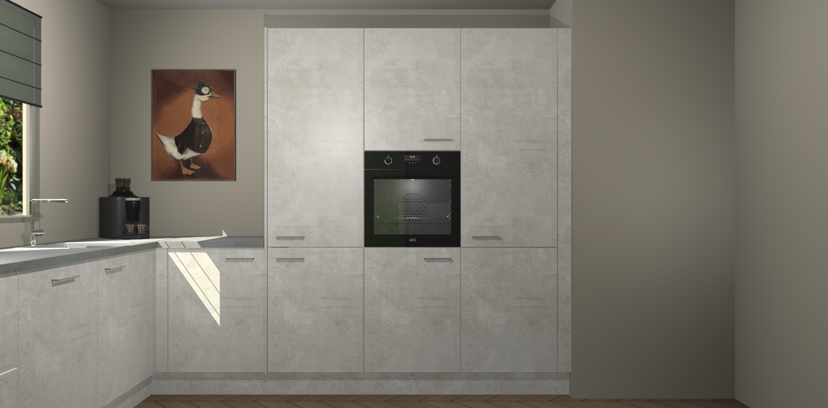 Welkom bij de Beton Opaal keuken Laos. Deze prachtige keuken zal de komende jaren het middelpunt van de belangstelling in uw huis zijn. Uitgerust met vijf inbouwapparaten komt u nooit kookgereedschap tekort. Bovendien geeft de warme houtlook elke ruimte een uitnodigende en tijdloze uitstraling.