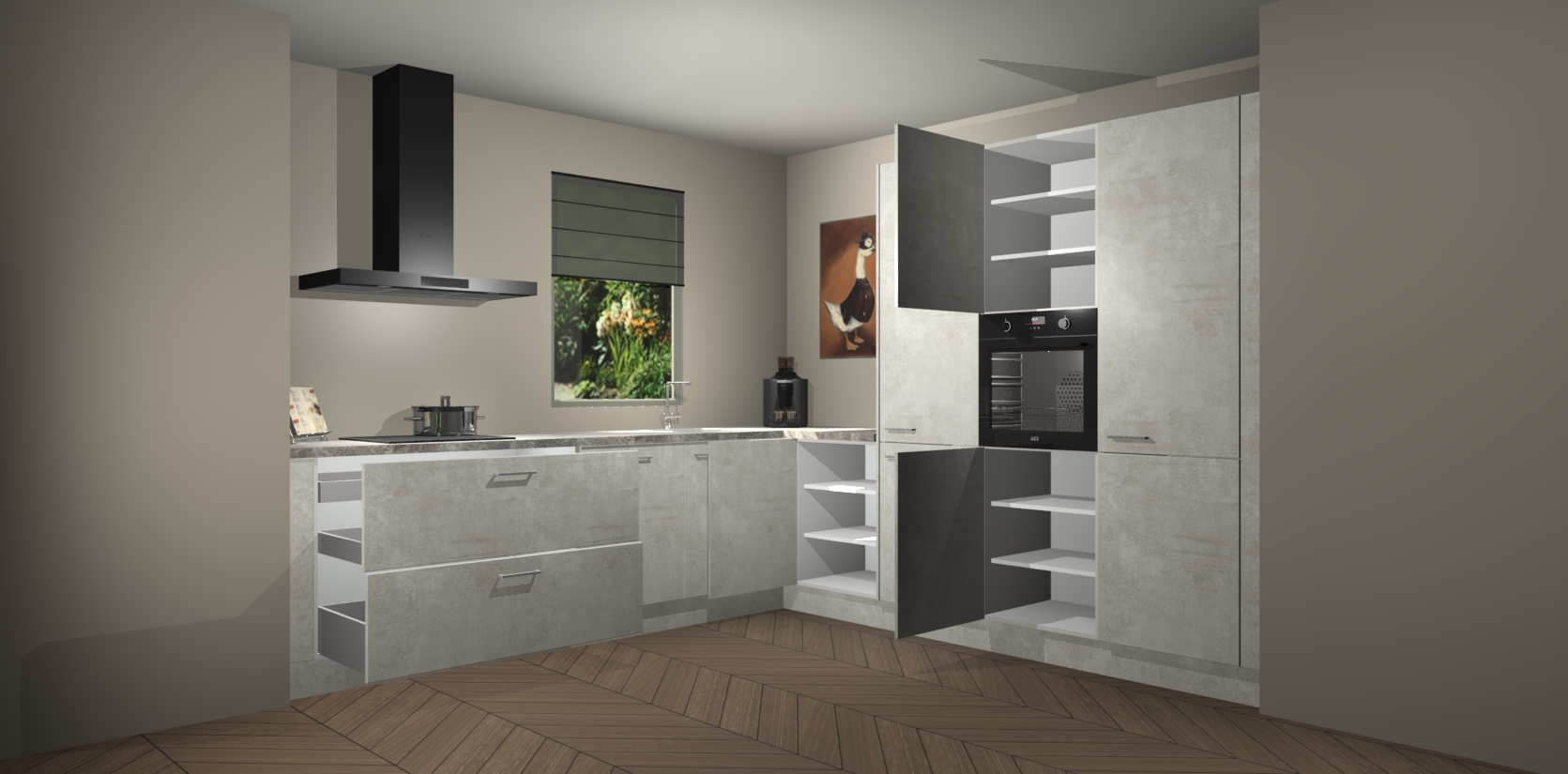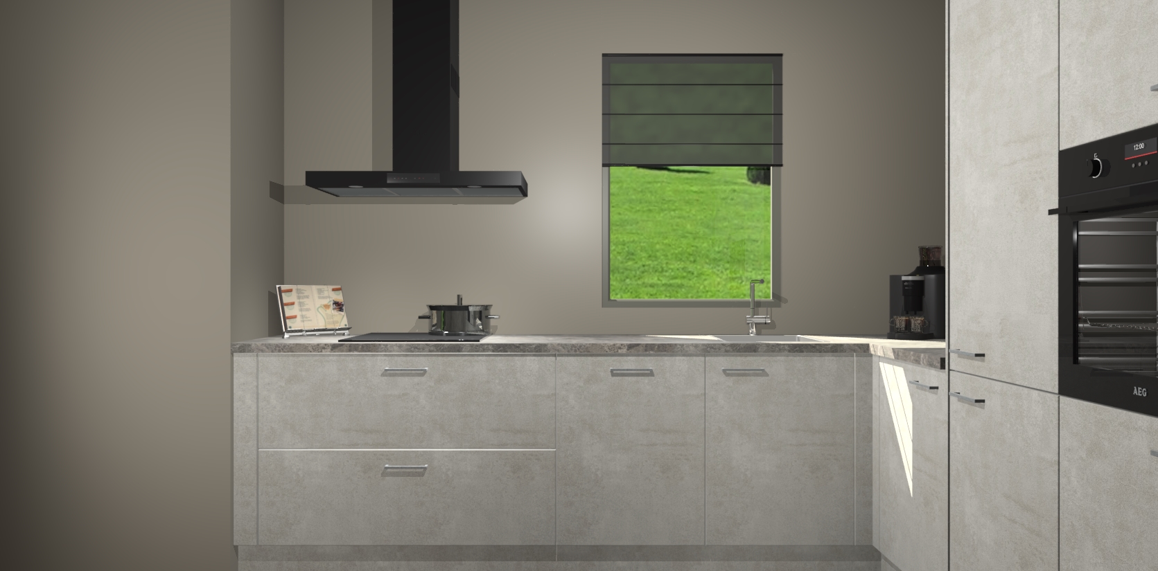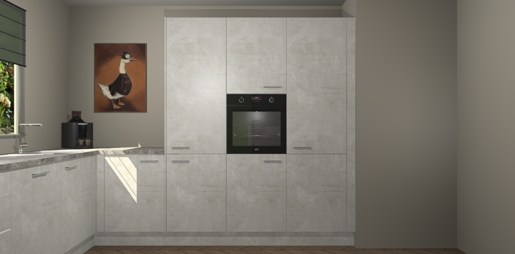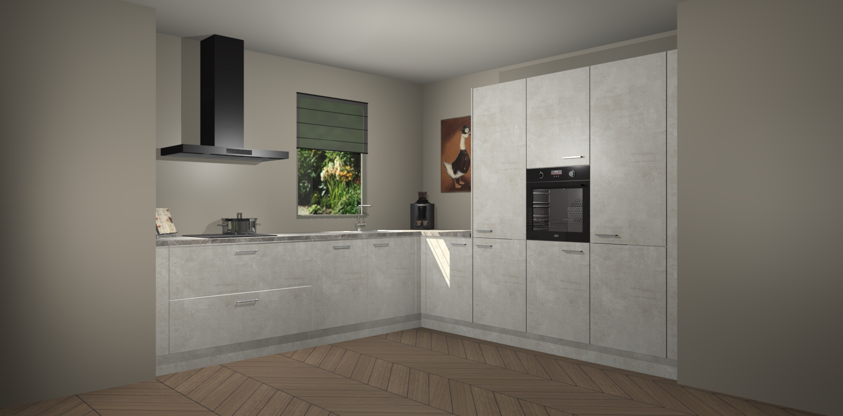 Welkom bij de Beton Opaal keuken Laos. Deze prachtige keuken zal de komende jaren het middelpunt van de belangstelling in uw huis zijn. Uitgerust met vijf inbouwapparaten komt u nooit kookgereedschap tekort. Bovendien geeft de warme houtlook elke ruimte een uitnodigende en tijdloze uitstraling.