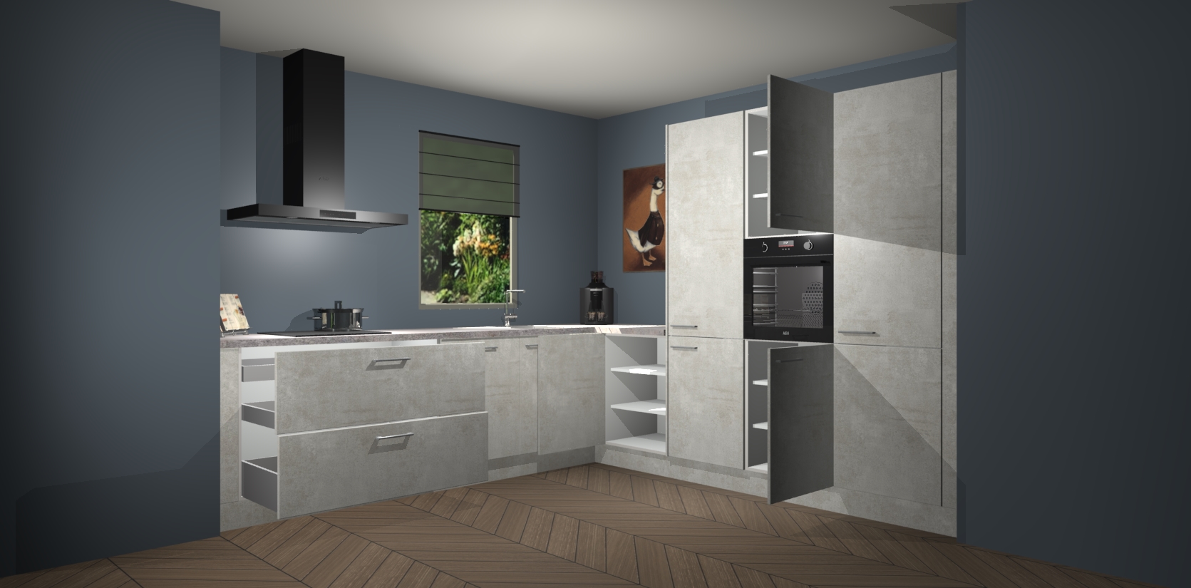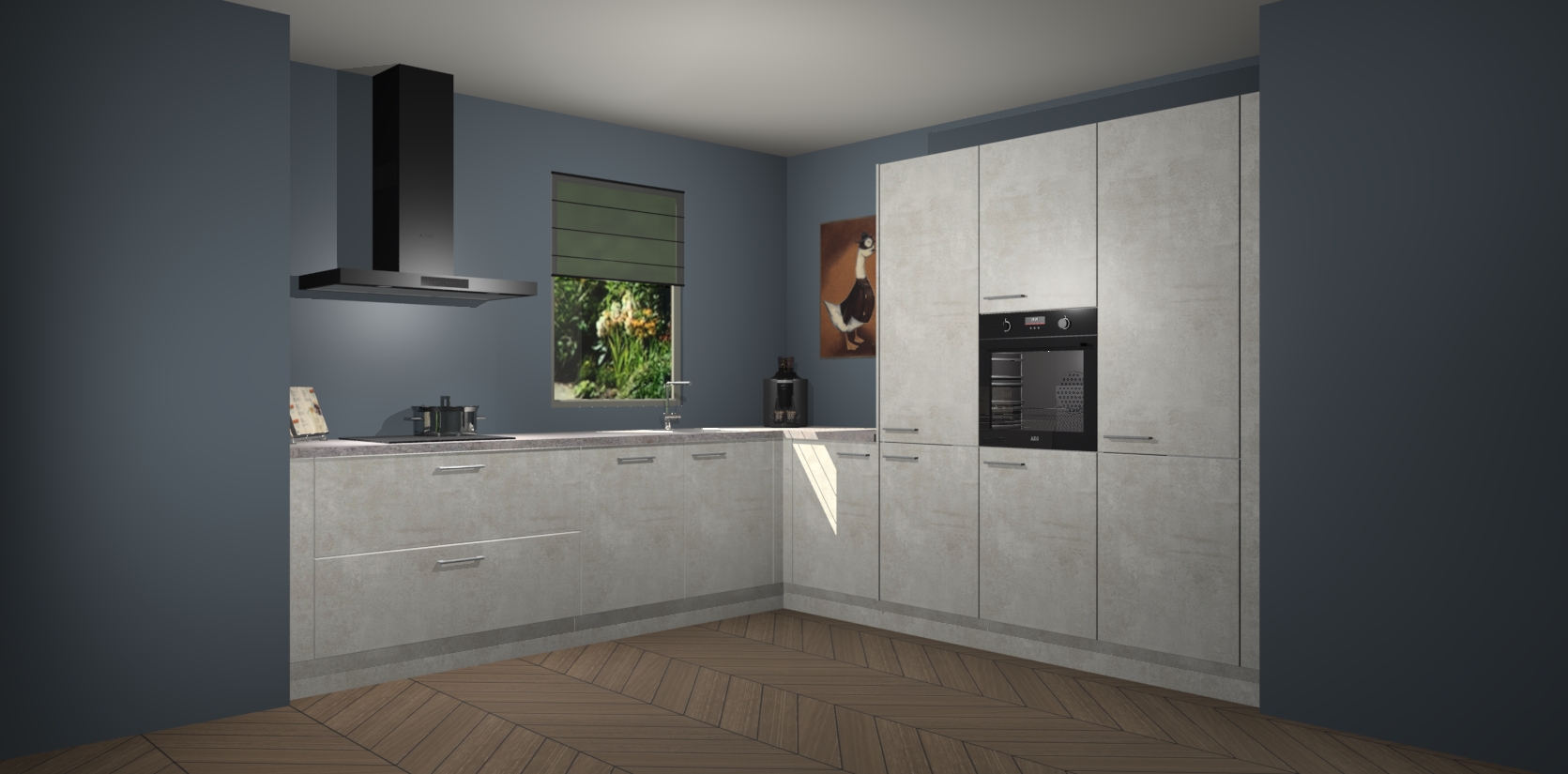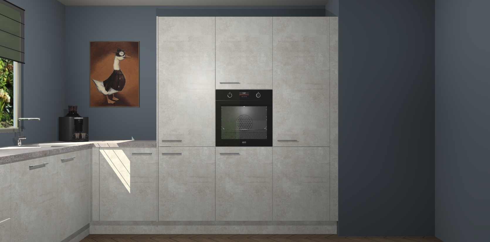 Welkom bij de Beton Opaal keuken Laos. Deze prachtige keuken zal de komende jaren het middelpunt van de belangstelling in uw huis zijn. Uitgerust met vijf inbouwapparaten komt u nooit kookgereedschap tekort. Bovendien geeft de warme houtlook elke ruimte een uitnodigende en tijdloze uitstraling.