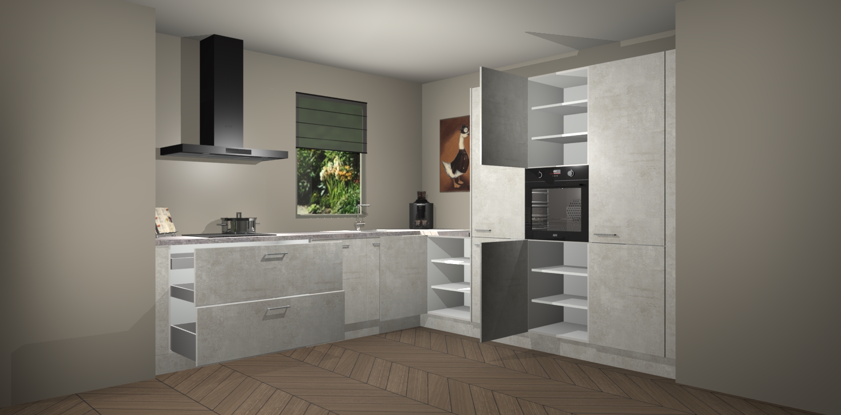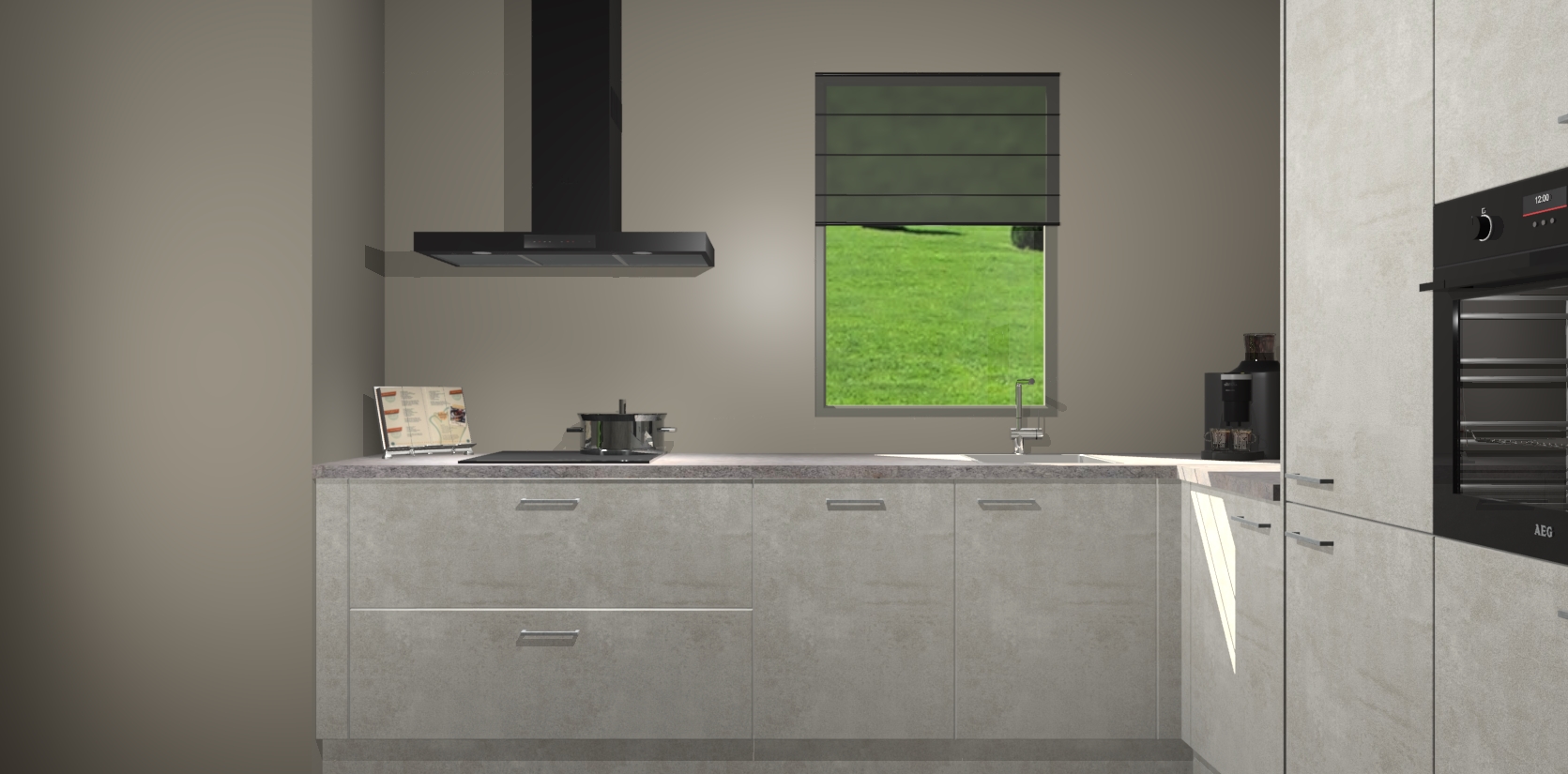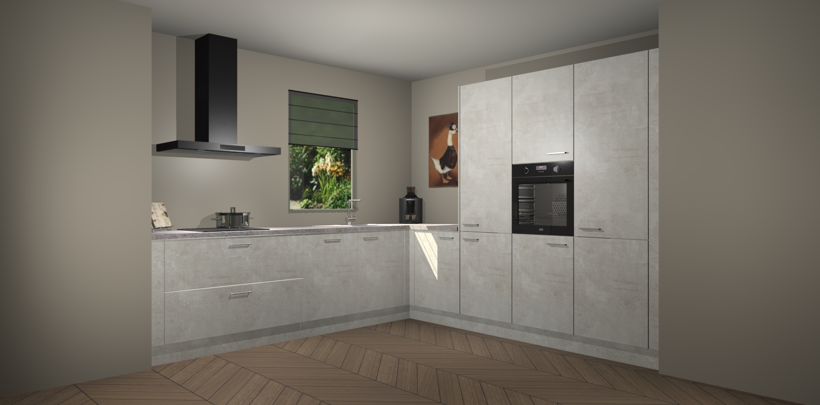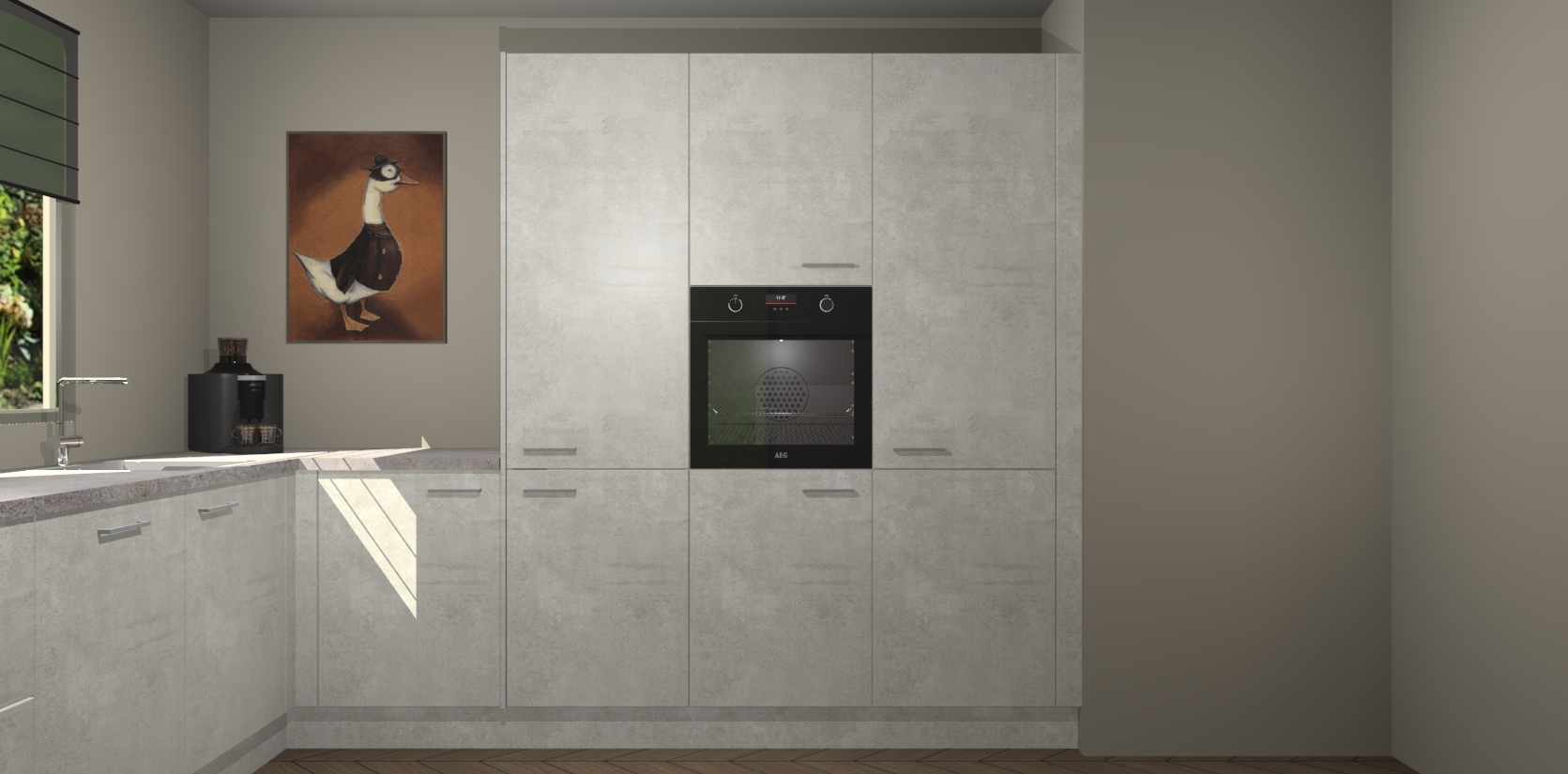 Welkom bij de Beton Opaal keuken Laos. Deze prachtige keuken zal de komende jaren het middelpunt van de belangstelling in uw huis zijn. Uitgerust met vijf inbouwapparaten komt u nooit kookgereedschap tekort. Bovendien geeft de warme houtlook elke ruimte een uitnodigende en tijdloze uitstraling.