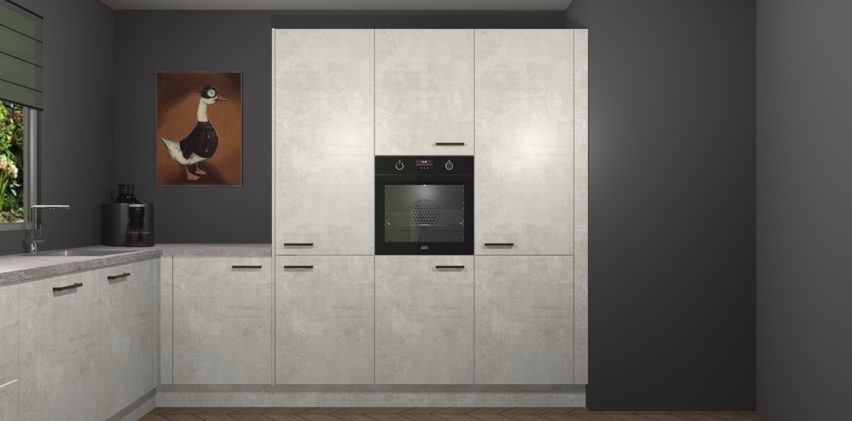Welkom bij de Beton Opaal keuken Laos. Deze prachtige keuken zal de komende jaren het middelpunt van de belangstelling in uw huis zijn. Uitgerust met vijf inbouwapparaten komt u nooit kookgereedschap tekort. Bovendien geeft de warme houtlook elke ruimte een uitnodigende en tijdloze uitstraling.