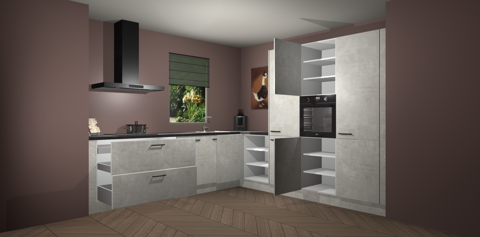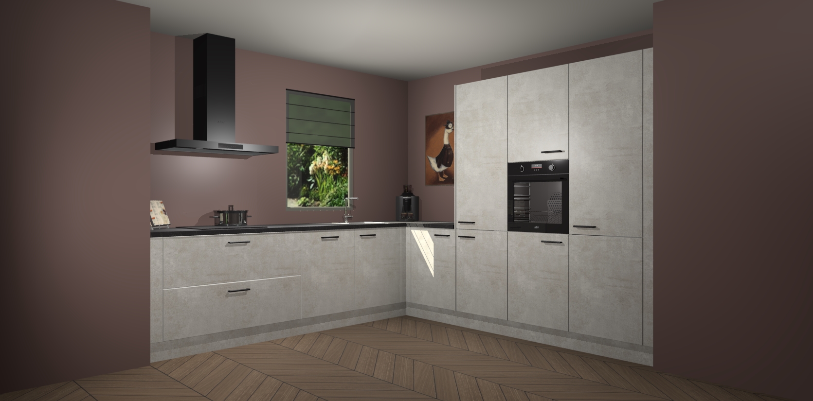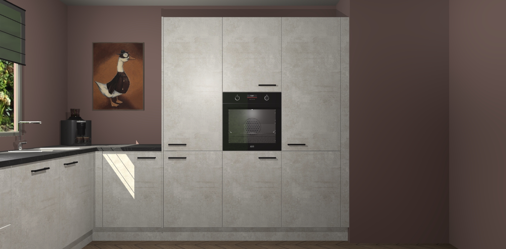 Welkom bij de Beton Opaal keuken Laos. Deze prachtige keuken zal de komende jaren het middelpunt van de belangstelling in uw huis zijn. Uitgerust met vijf inbouwapparaten komt u nooit kookgereedschap tekort. Bovendien geeft de warme houtlook elke ruimte een uitnodigende en tijdloze uitstraling.