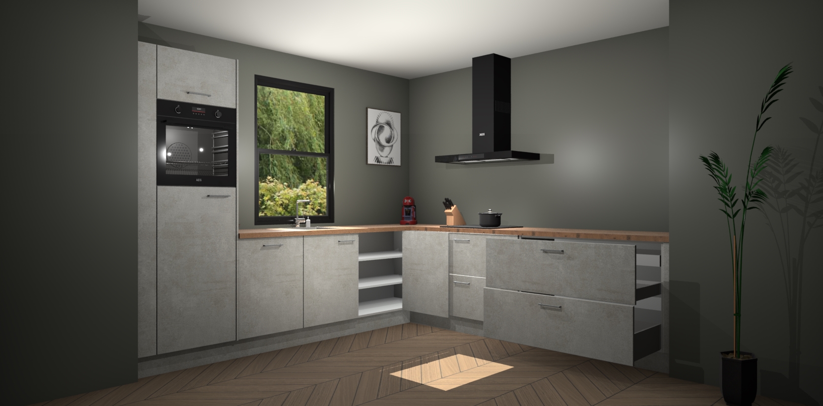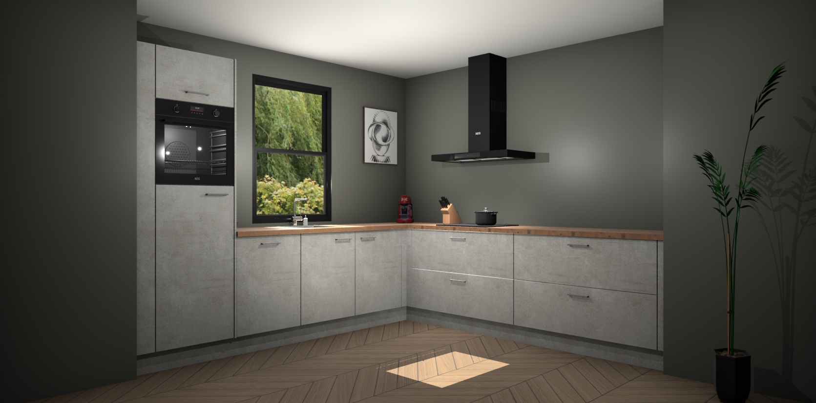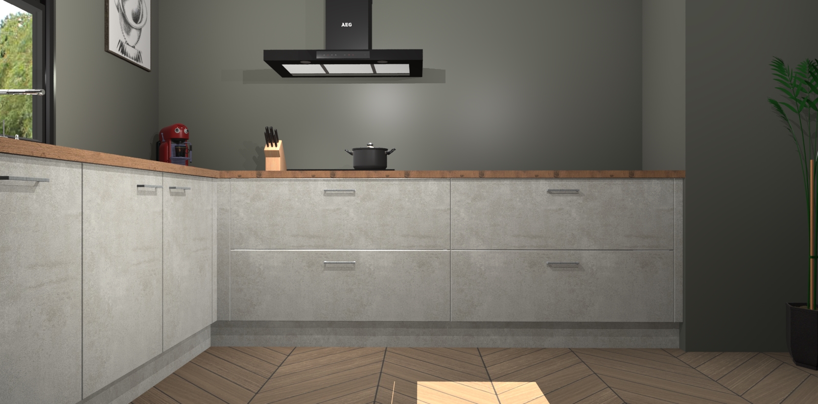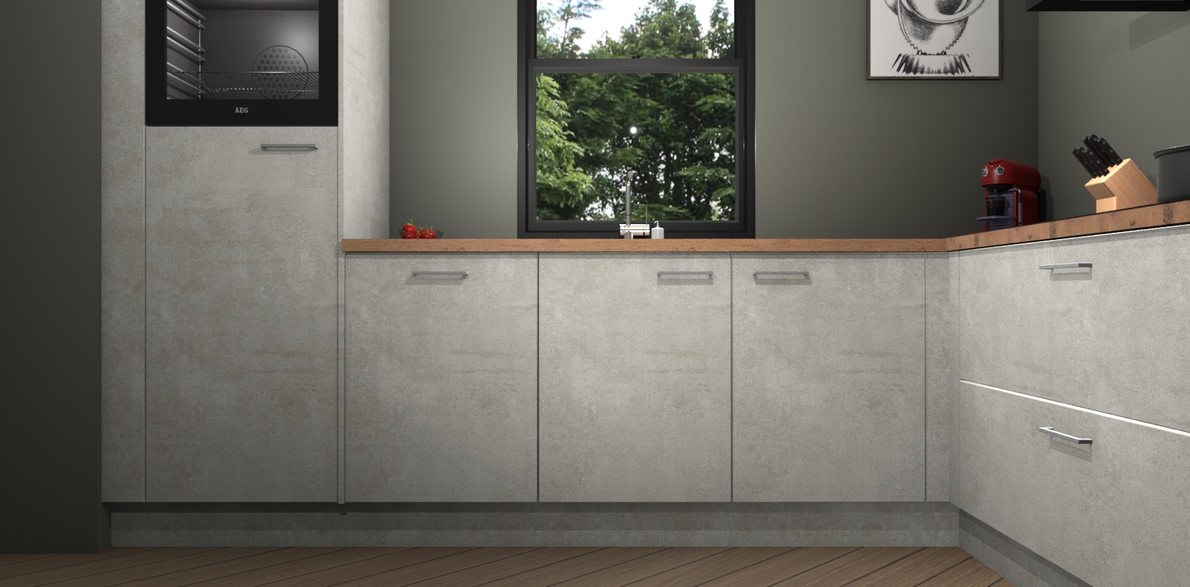 Welkom bij de Beton opaal keuken Lublin. Deze prachtige keuken zal de komende jaren het middelpunt van de belangstelling in uw huis zijn. Uitgerust met vijf inbouwapparaten komt u nooit kookgereedschap tekort. Bovendien geeft de warme houtlook elke ruimte een uitnodigende en tijdloze uitstraling.