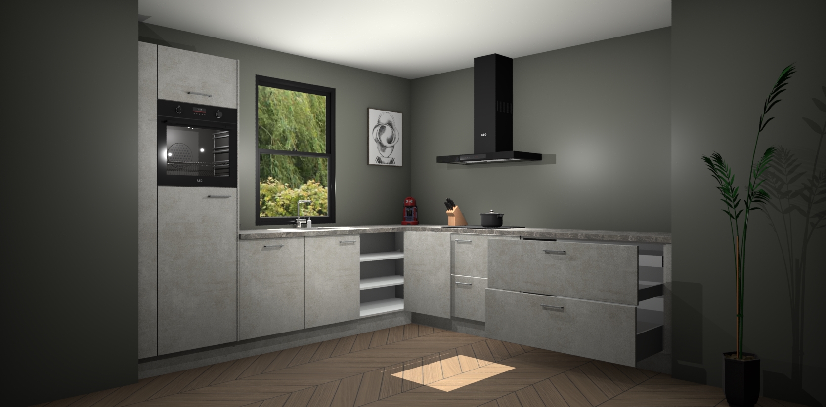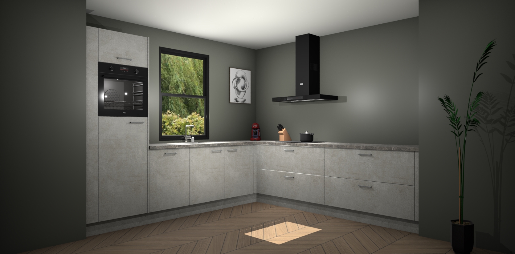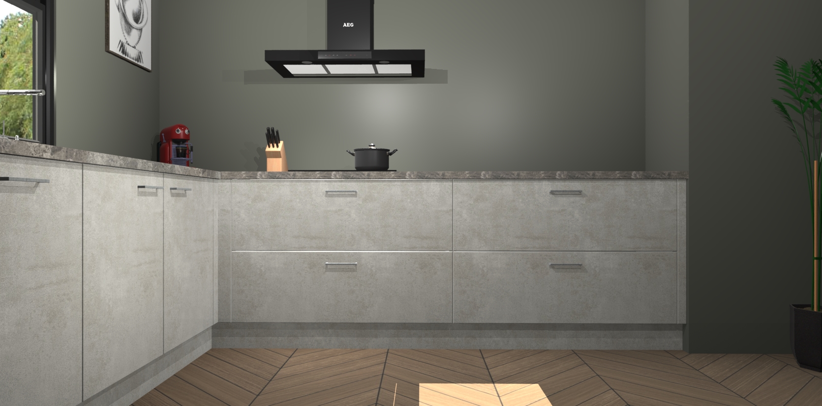 Welkom bij de Beton opaal keuken Lublin. Deze prachtige keuken zal de komende jaren het middelpunt van de belangstelling in uw huis zijn. Uitgerust met vijf inbouwapparaten komt u nooit kookgereedschap tekort. Bovendien geeft de warme houtlook elke ruimte een uitnodigende en tijdloze uitstraling.