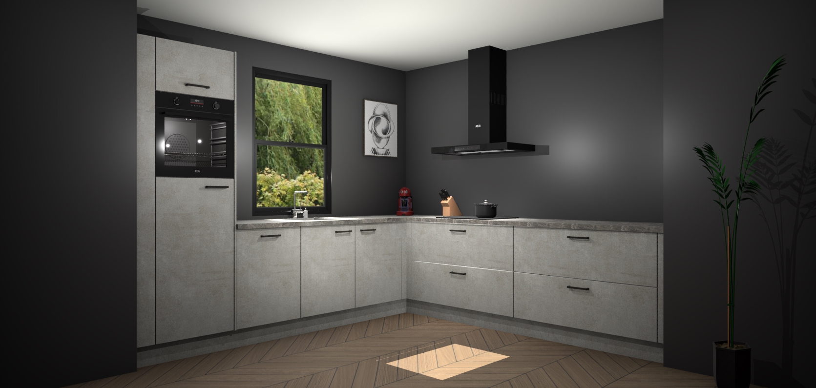 Welkom bij de Beton opaal keuken Lublin. Deze prachtige keuken zal de komende jaren het middelpunt van de belangstelling in uw huis zijn. Uitgerust met vijf inbouwapparaten komt u nooit kookgereedschap tekort. Bovendien geeft de warme houtlook elke ruimte een uitnodigende en tijdloze uitstraling.