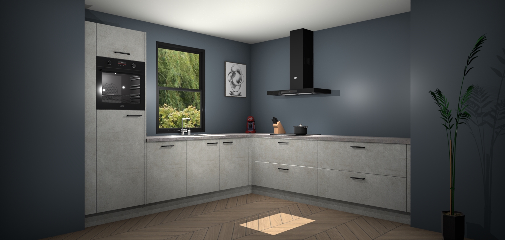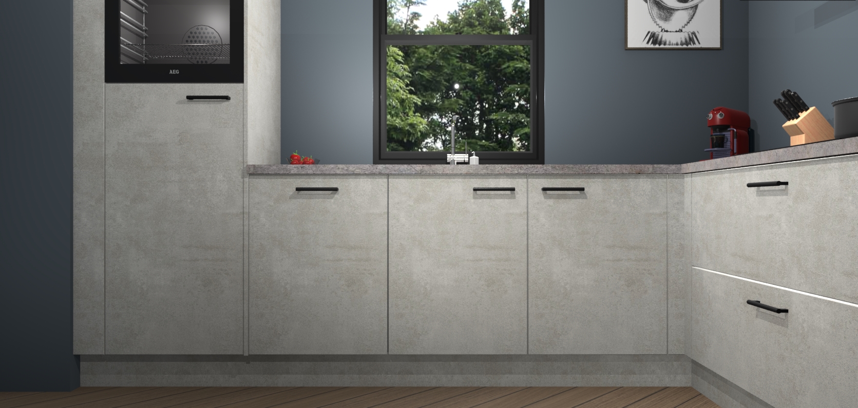 Welkom bij de Beton opaal keuken Lublin. Deze prachtige keuken zal de komende jaren het middelpunt van de belangstelling in uw huis zijn. Uitgerust met vijf inbouwapparaten komt u nooit kookgereedschap tekort. Bovendien geeft de warme houtlook elke ruimte een uitnodigende en tijdloze uitstraling.