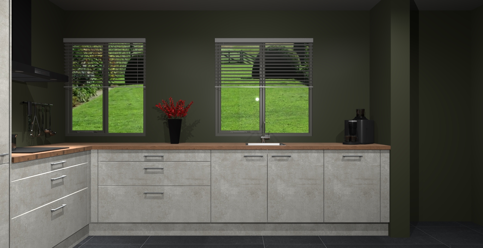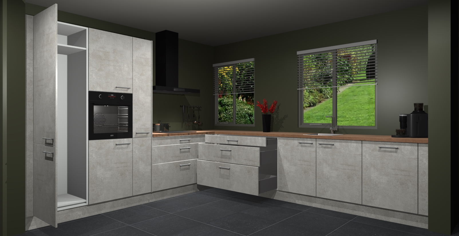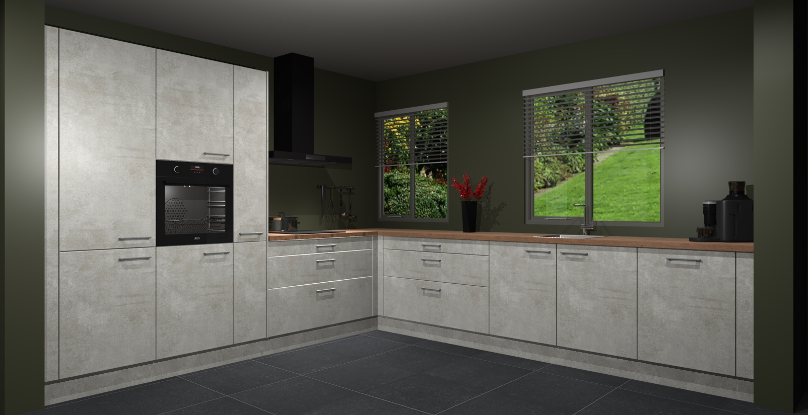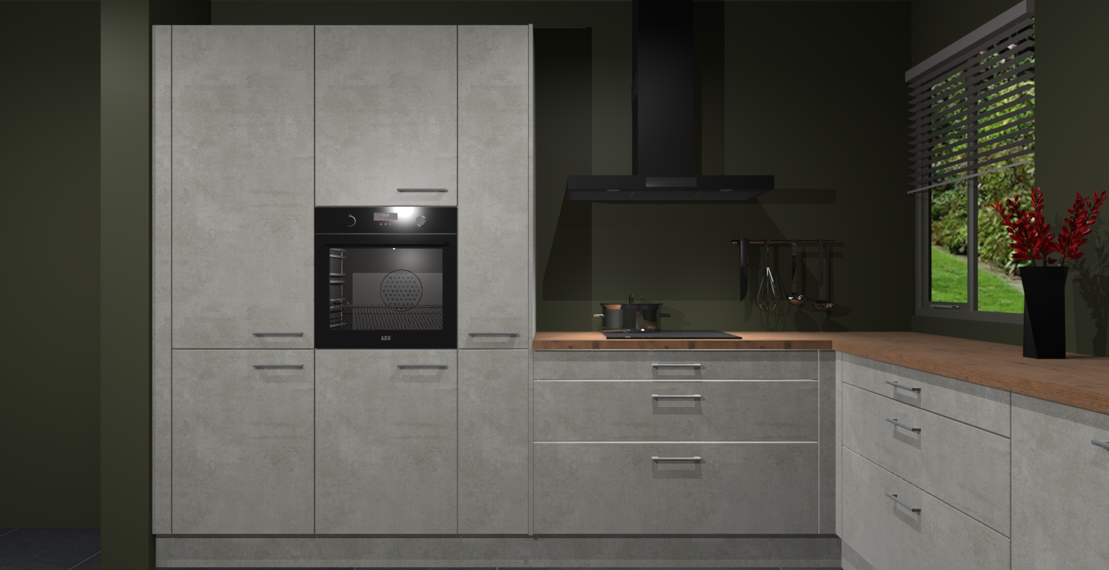 Welkom bij de Beton Opaal keuken Palermo. Deze prachtige keuken zal de komende jaren het middelpunt van de belangstelling in uw huis zijn. Uitgerust met vijf inbouwapparaten komt u nooit kookgereedschap tekort. Bovendien geeft de warme houtlook elke ruimte een uitnodigende en tijdloze uitstraling.