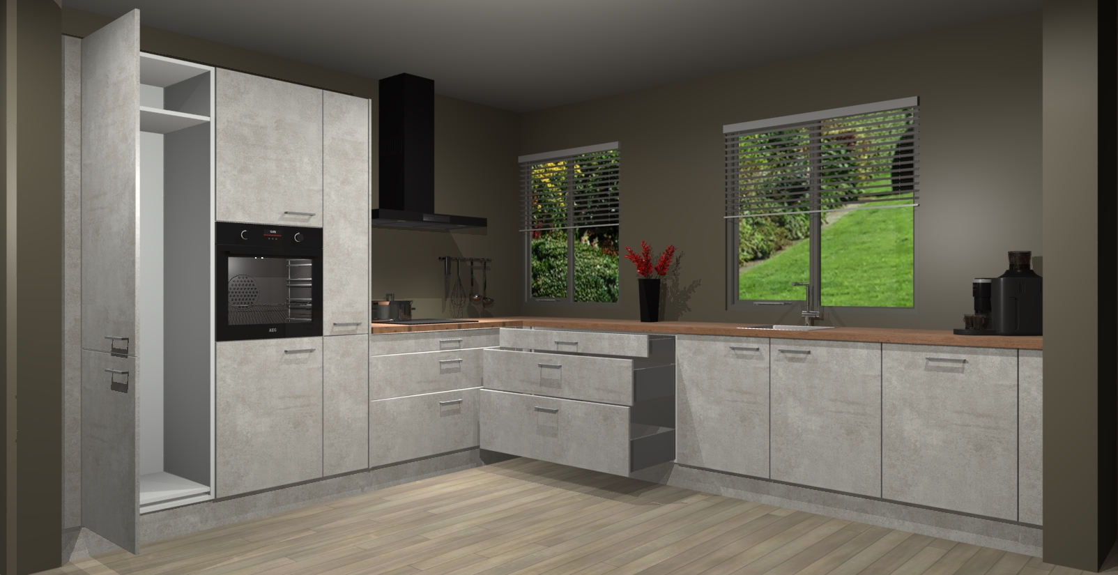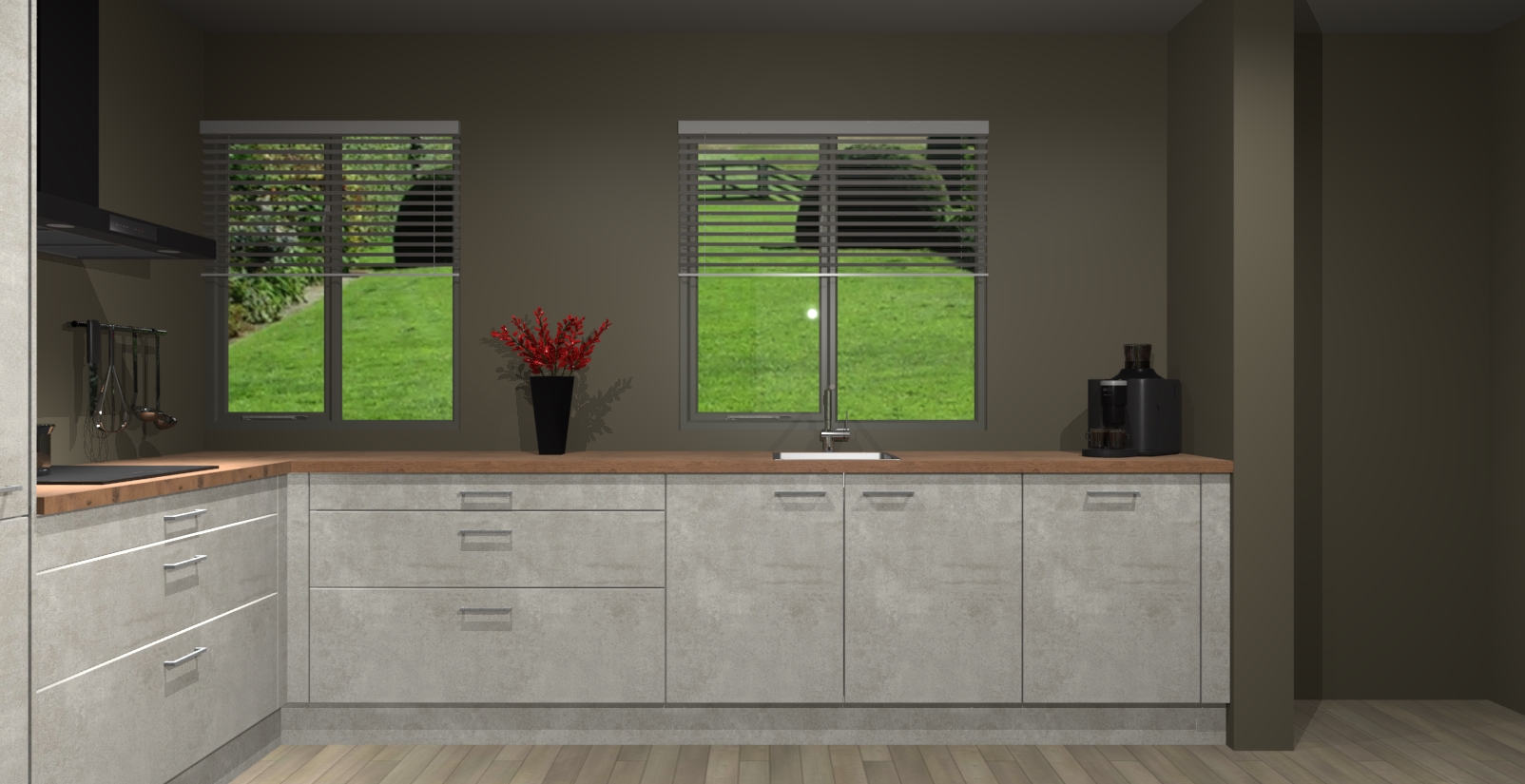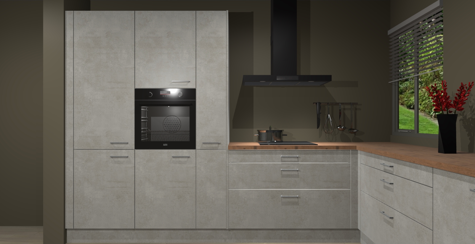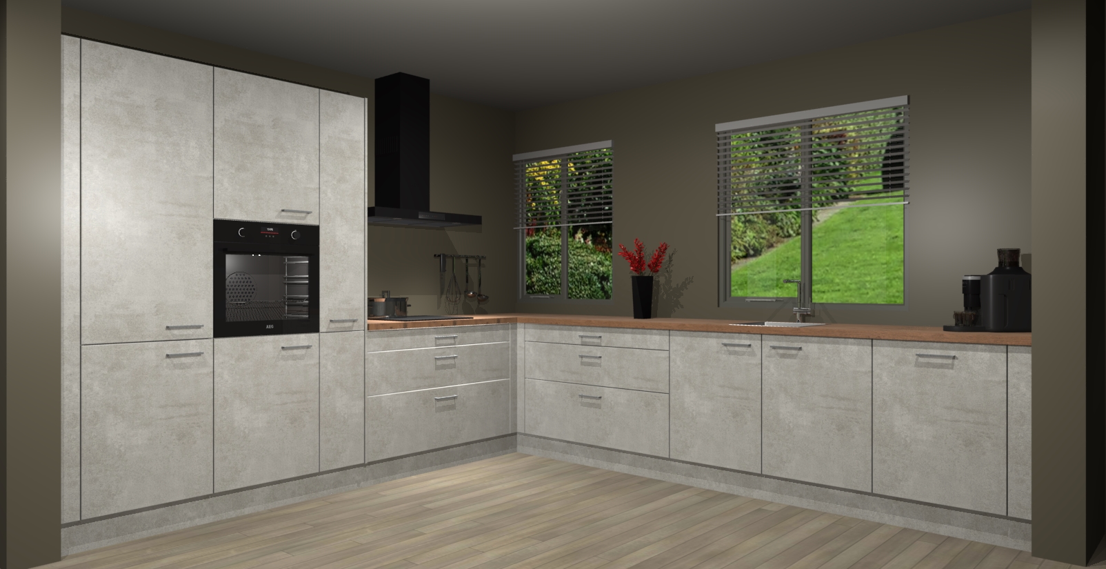Welkom bij de Beton Opaal keuken Palermo. Deze prachtige keuken zal de komende jaren het middelpunt van de belangstelling in uw huis zijn. Uitgerust met vijf inbouwapparaten komt u nooit kookgereedschap tekort. Bovendien geeft de warme houtlook elke ruimte een uitnodigende en tijdloze uitstraling.