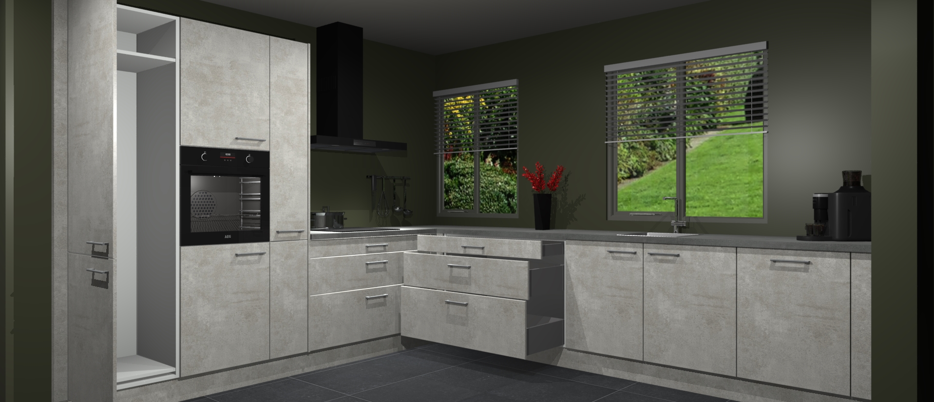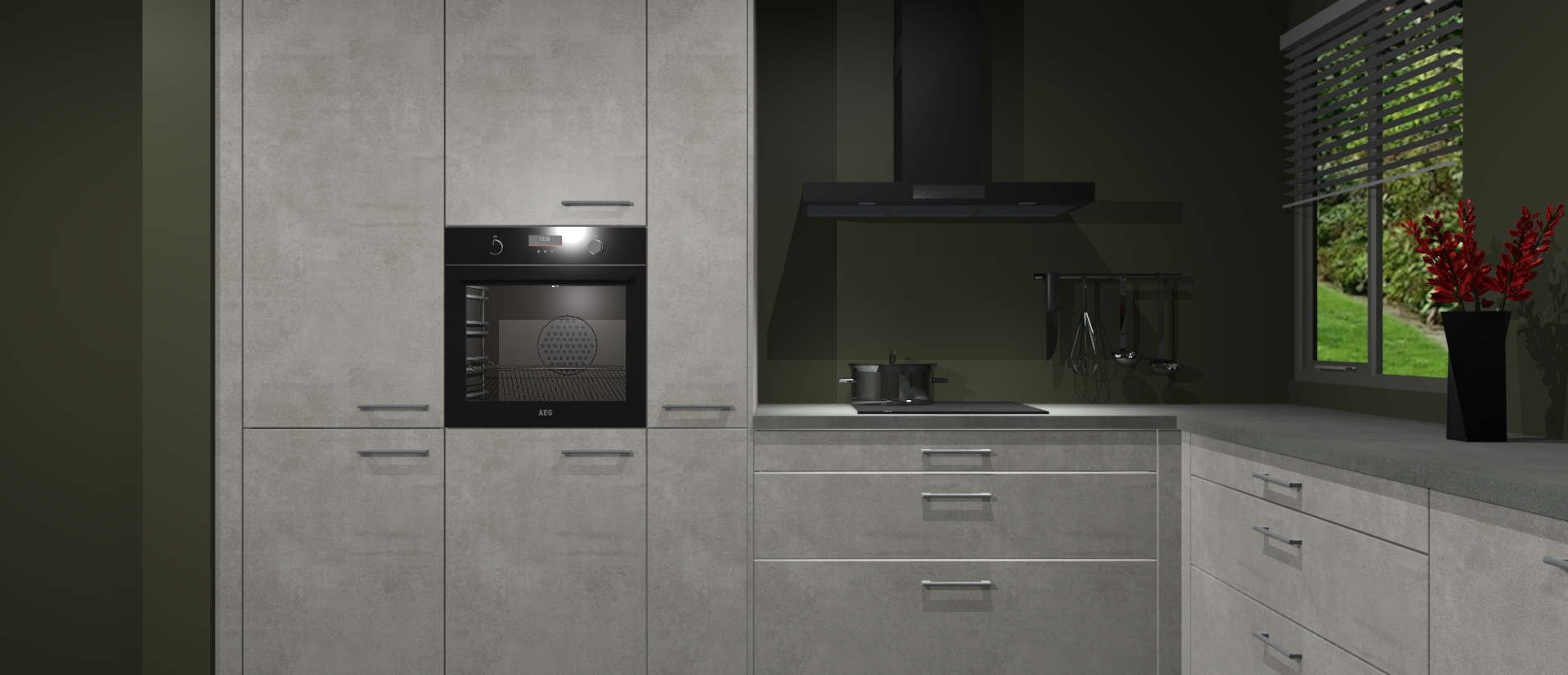 Welkom bij de Beton Opaal keuken Palermo. Deze prachtige keuken zal de komende jaren het middelpunt van de belangstelling in uw huis zijn. Uitgerust met vijf inbouwapparaten komt u nooit kookgereedschap tekort. Bovendien geeft de warme houtlook elke ruimte een uitnodigende en tijdloze uitstraling.