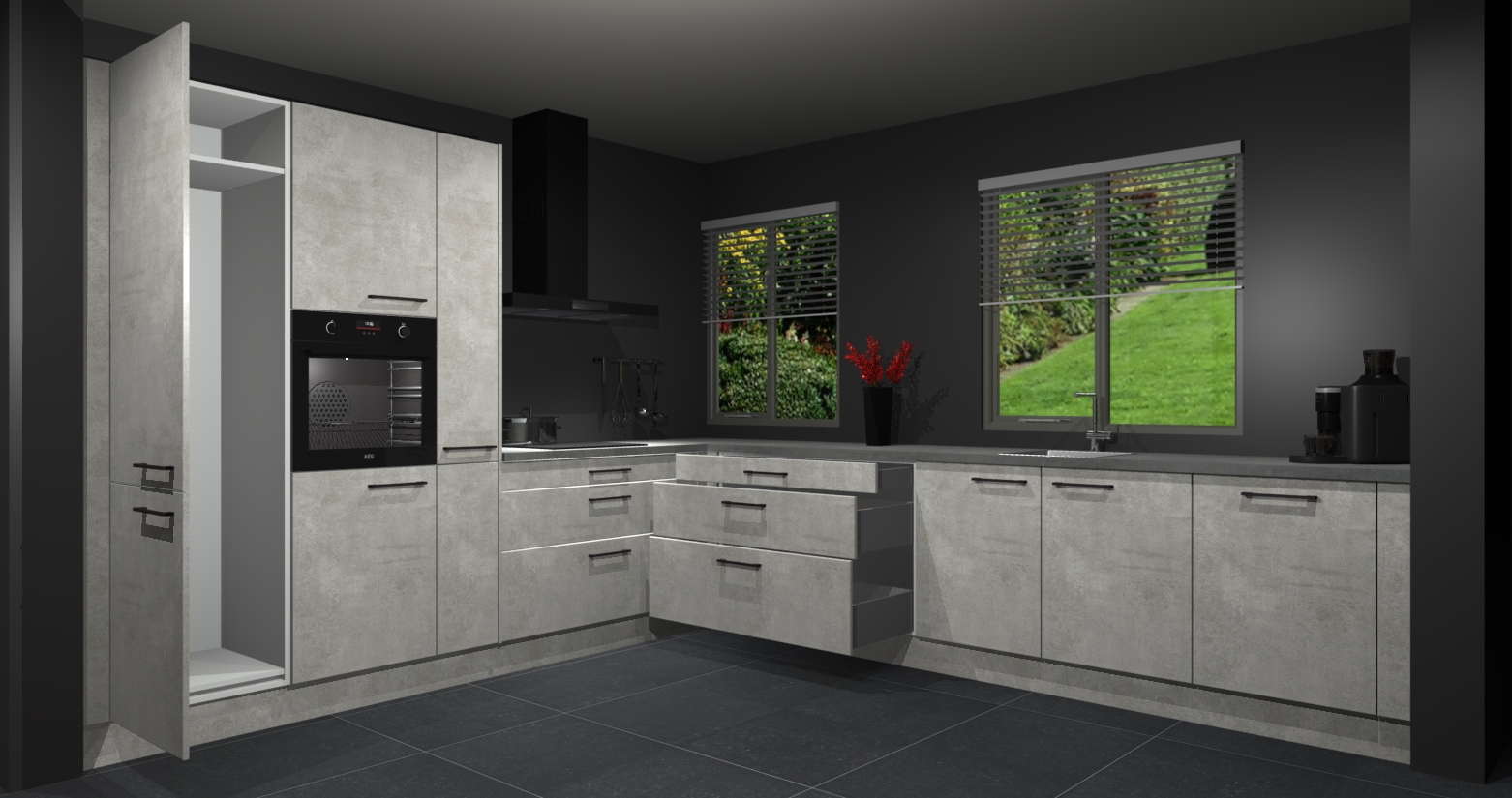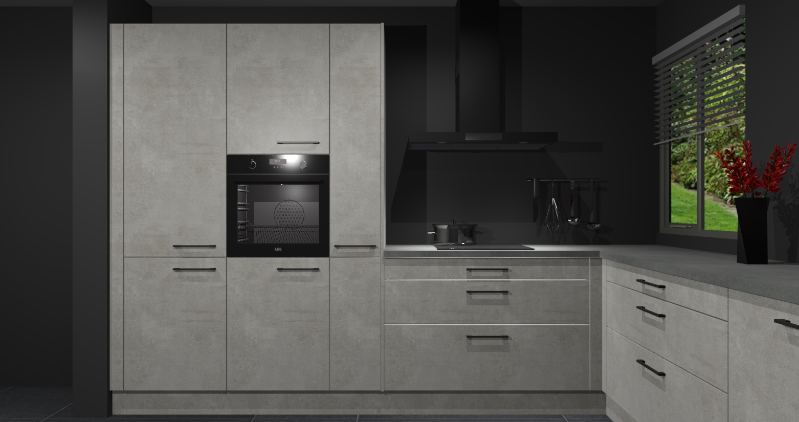 Welkom bij de Beton Opaal keuken Palermo. Deze prachtige keuken zal de komende jaren het middelpunt van de belangstelling in uw huis zijn. Uitgerust met vijf inbouwapparaten komt u nooit kookgereedschap tekort. Bovendien geeft de warme houtlook elke ruimte een uitnodigende en tijdloze uitstraling.