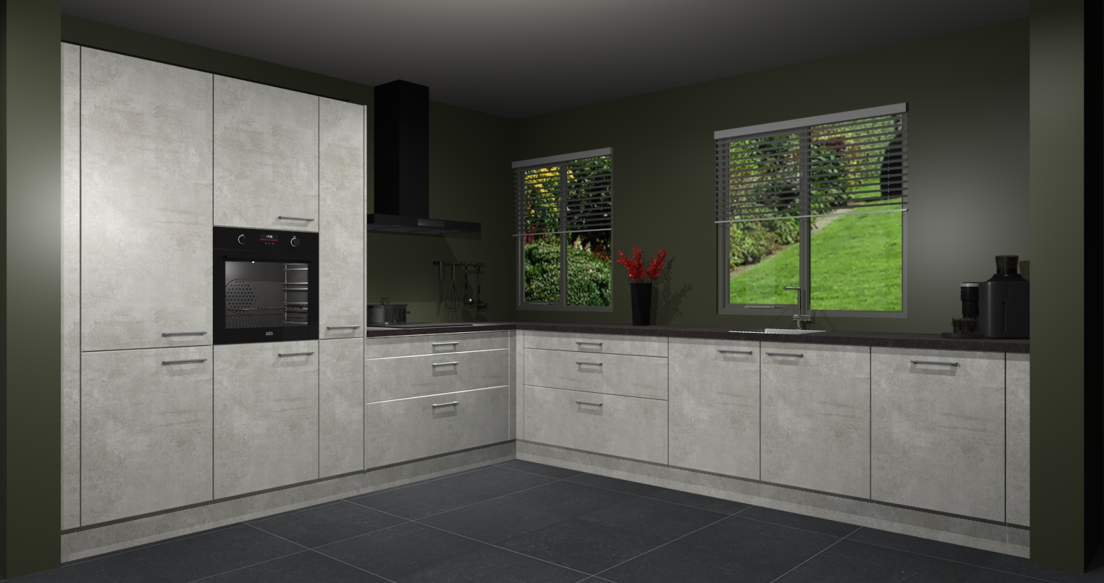 Welkom bij de Beton Opaal keuken Palermo. Deze prachtige keuken zal de komende jaren het middelpunt van de belangstelling in uw huis zijn. Uitgerust met vijf inbouwapparaten komt u nooit kookgereedschap tekort. Bovendien geeft de warme houtlook elke ruimte een uitnodigende en tijdloze uitstraling.