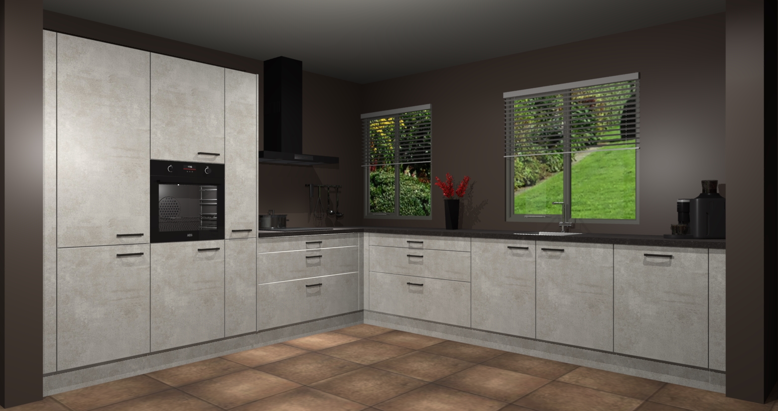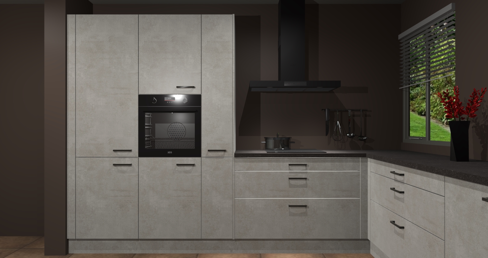 Welkom bij de Beton Opaal keuken Palermo. Deze prachtige keuken zal de komende jaren het middelpunt van de belangstelling in uw huis zijn. Uitgerust met vijf inbouwapparaten komt u nooit kookgereedschap tekort. Bovendien geeft de warme houtlook elke ruimte een uitnodigende en tijdloze uitstraling.