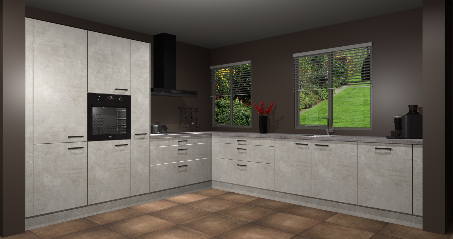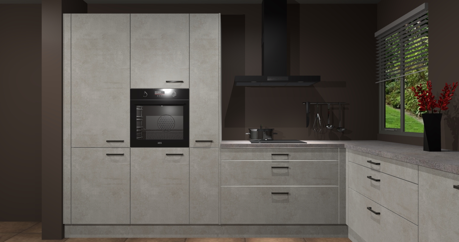 Welkom bij de Beton Opaal keuken Palermo. Deze prachtige keuken zal de komende jaren het middelpunt van de belangstelling in uw huis zijn. Uitgerust met vijf inbouwapparaten komt u nooit kookgereedschap tekort. Bovendien geeft de warme houtlook elke ruimte een uitnodigende en tijdloze uitstraling.