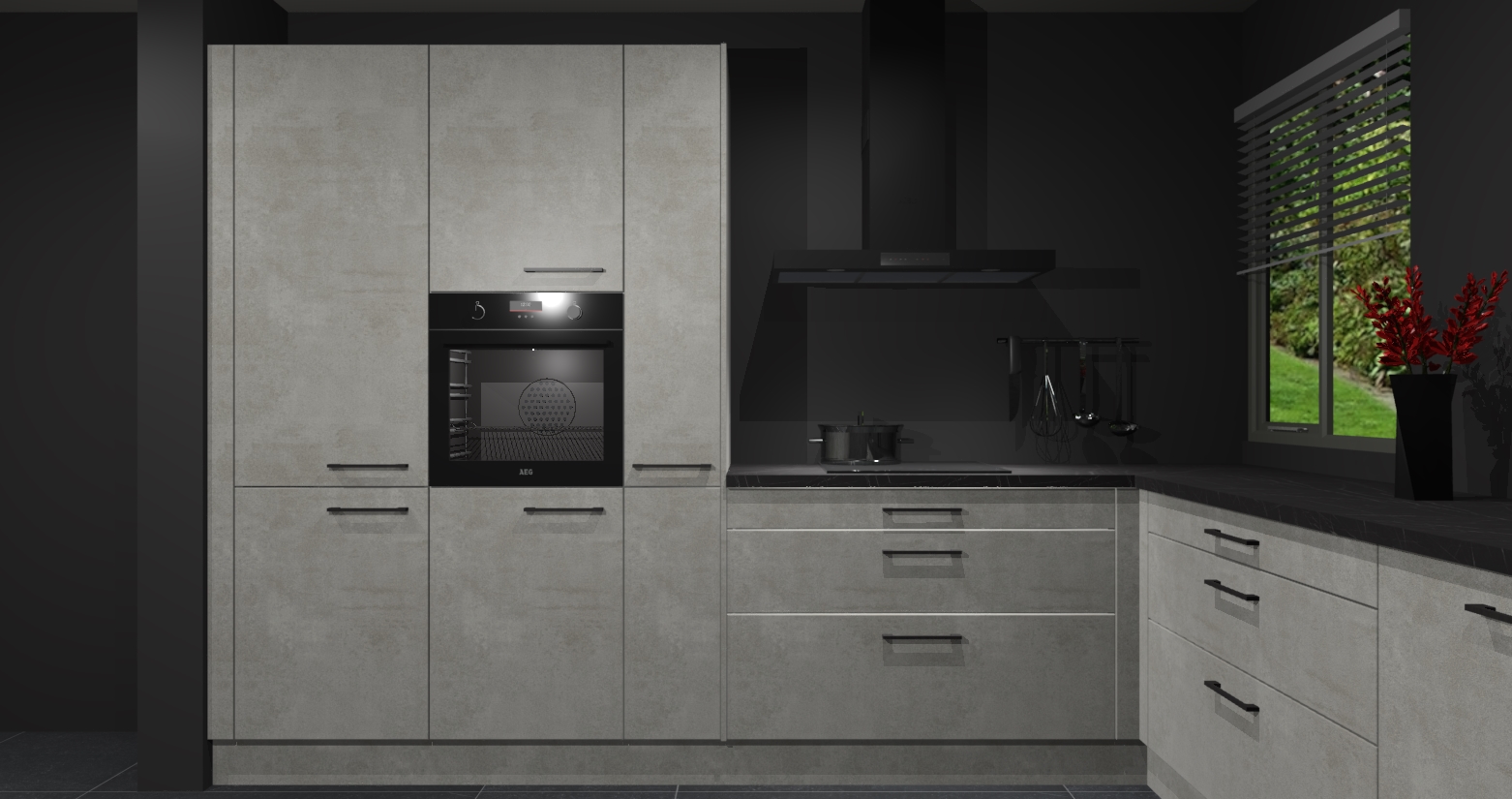 Welkom bij de Beton Opaal keuken Palermo. Deze prachtige keuken zal de komende jaren het middelpunt van de belangstelling in uw huis zijn. Uitgerust met vijf inbouwapparaten komt u nooit kookgereedschap tekort. Bovendien geeft de warme houtlook elke ruimte een uitnodigende en tijdloze uitstraling.