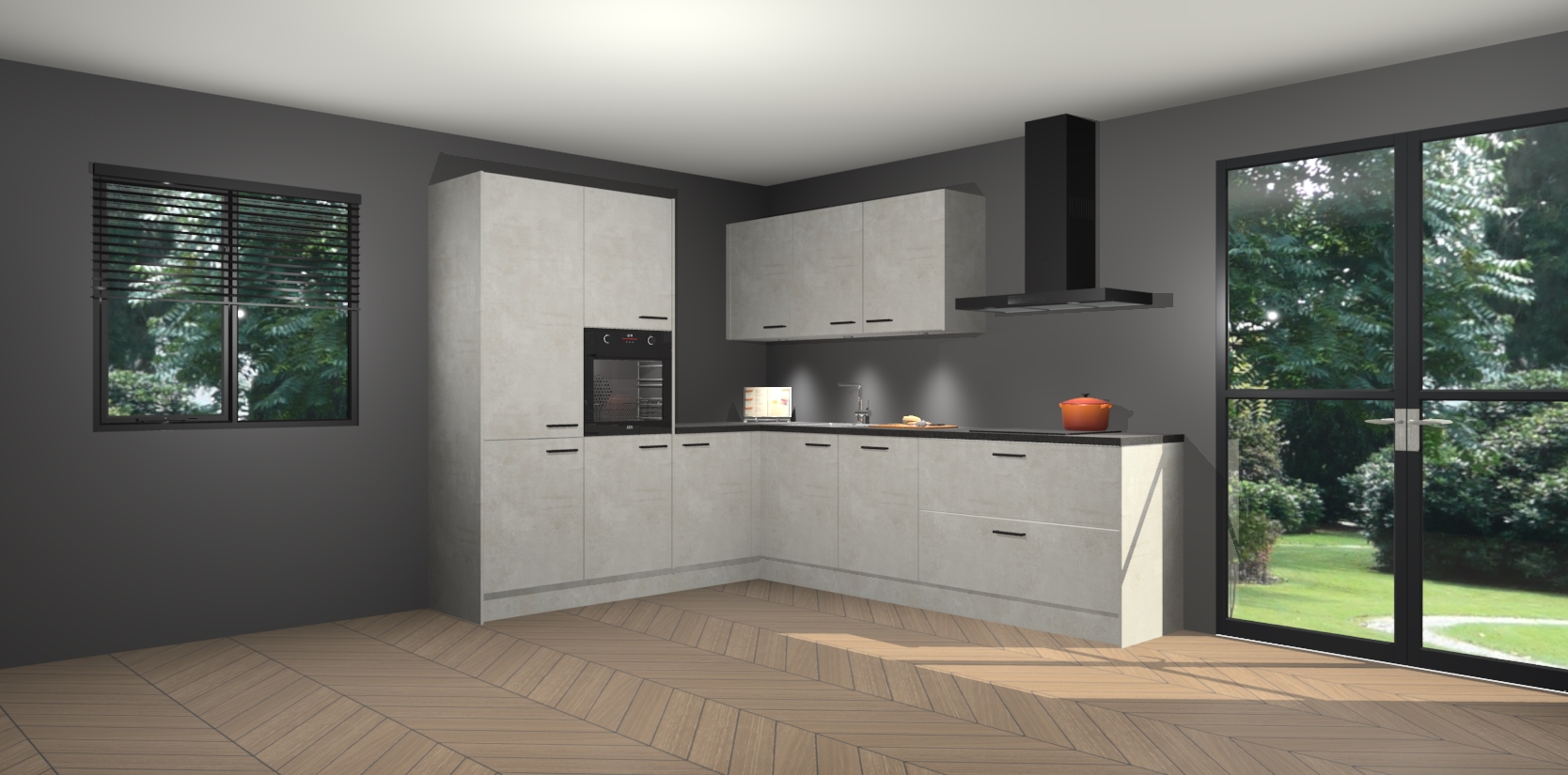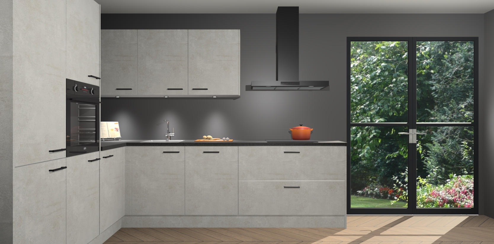 Maak kennis met de beton opaal keuken Parla - de perfecte aanvulling voor uw moderne keuken! Ervaar tijdloos design, elegantie en een chique uitstraling met onze zwarte handgrepen, soft-close deuren en veel opbergruimte. Dit alles wordt aangeboden tegen een vaste lage prijs voor ongeëvenaarde Duitse keukenkwaliteit!