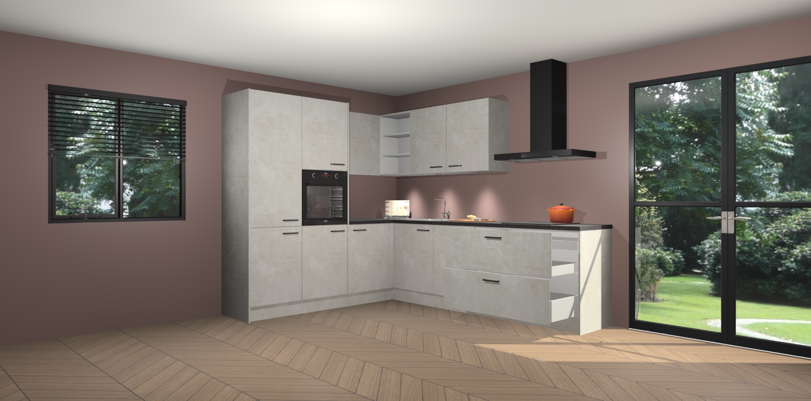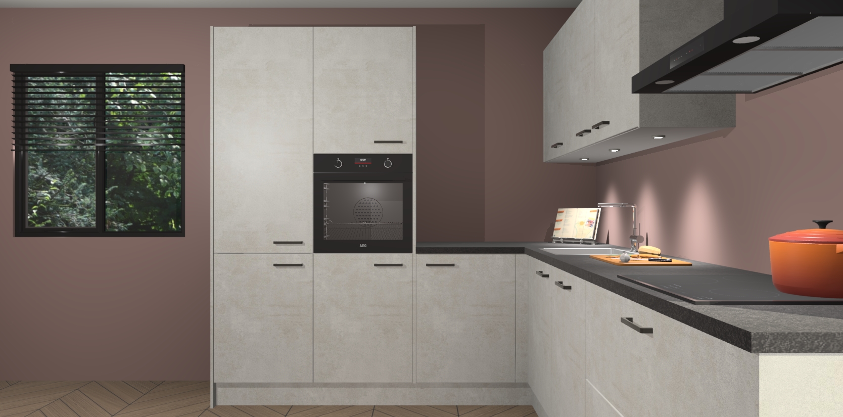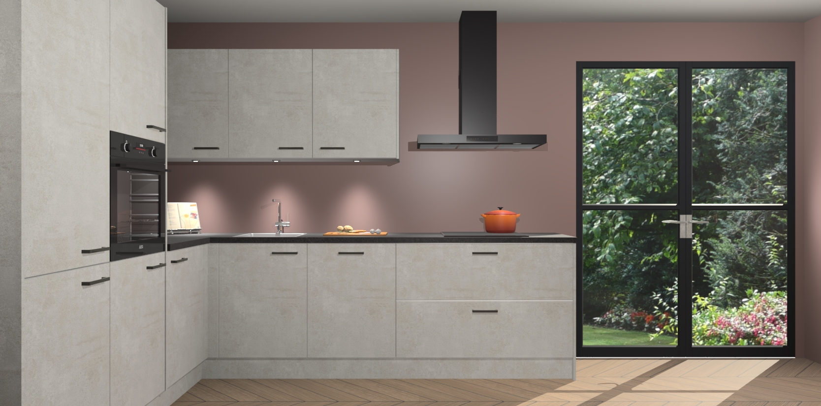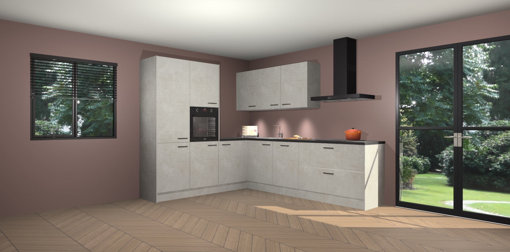 Maak kennis met de beton opaal keuken Parla - de perfecte aanvulling voor uw moderne keuken! Ervaar tijdloos design, elegantie en een chique uitstraling met onze zwarte handgrepen, soft-close deuren en veel opbergruimte. Dit alles wordt aangeboden tegen een vaste lage prijs voor ongeëvenaarde Duitse keukenkwaliteit!