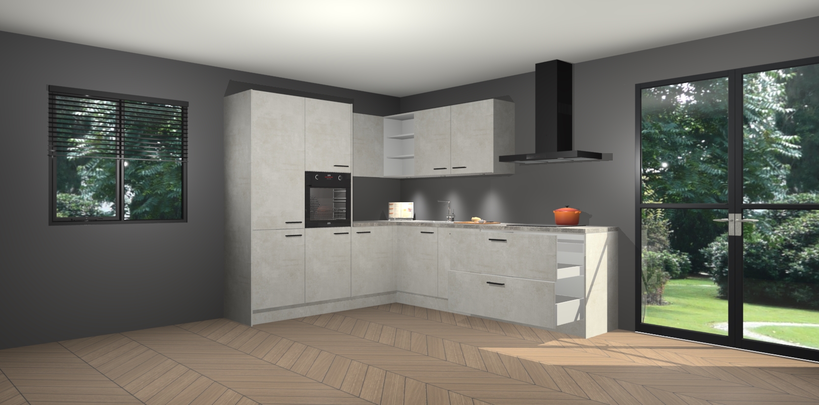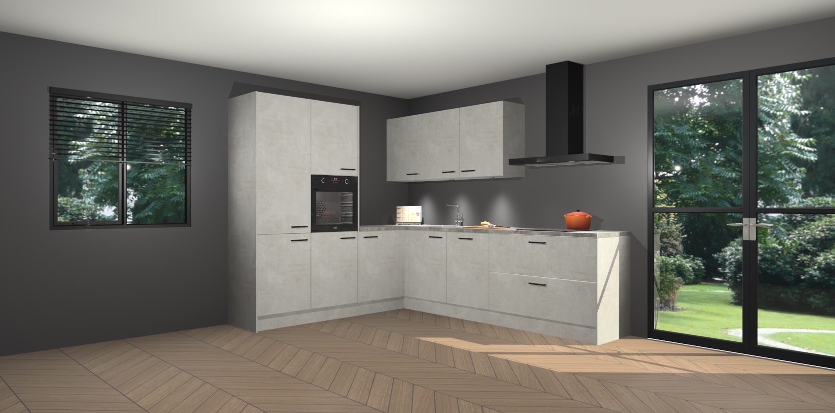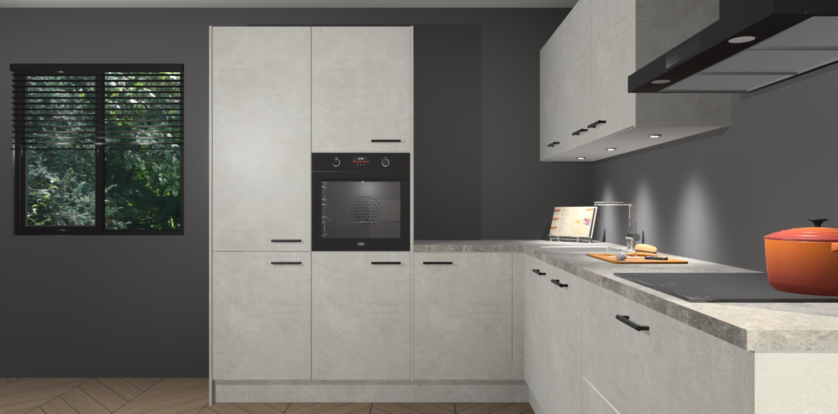 Maak kennis met de beton opaal keuken Parla - de perfecte aanvulling voor uw moderne keuken! Ervaar tijdloos design, elegantie en een chique uitstraling met onze zwarte handgrepen, soft-close deuren en veel opbergruimte. Dit alles wordt aangeboden tegen een vaste lage prijs voor ongeëvenaarde Duitse keukenkwaliteit!