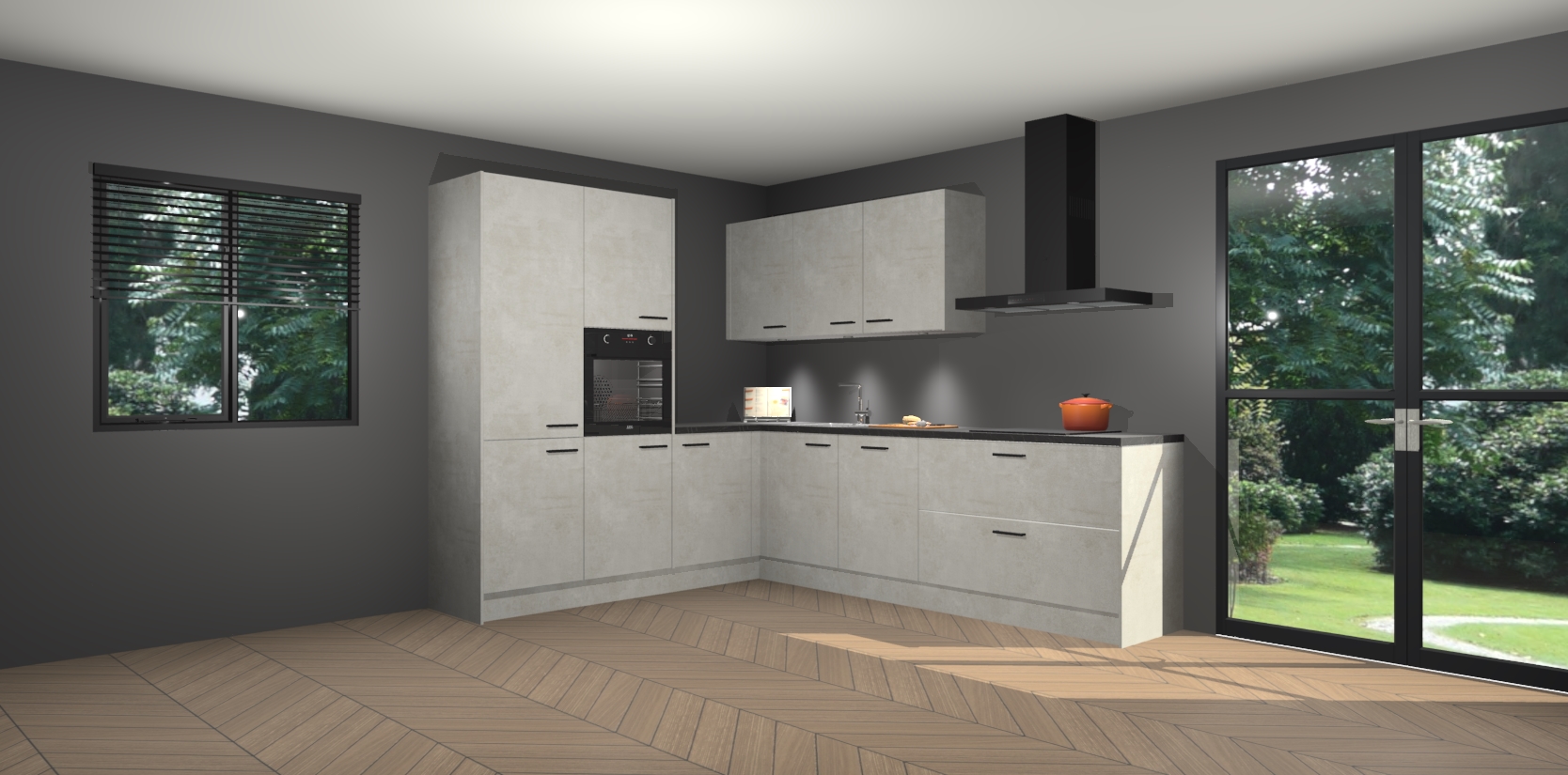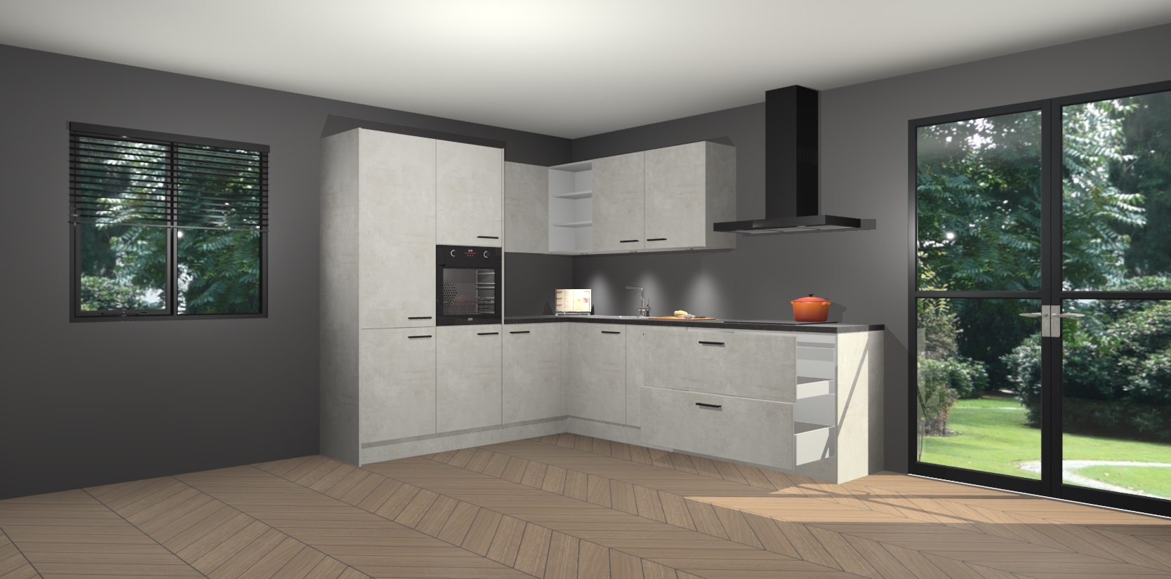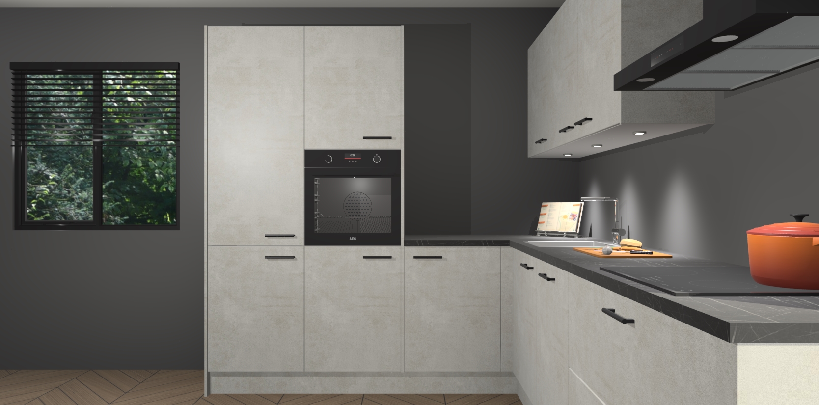 Maak kennis met de beton opaal keuken Parla - de perfecte aanvulling voor uw moderne keuken! Ervaar tijdloos design, elegantie en een chique uitstraling met onze zwarte handgrepen, soft-close deuren en veel opbergruimte. Dit alles wordt aangeboden tegen een vaste lage prijs voor ongeëvenaarde Duitse keukenkwaliteit!