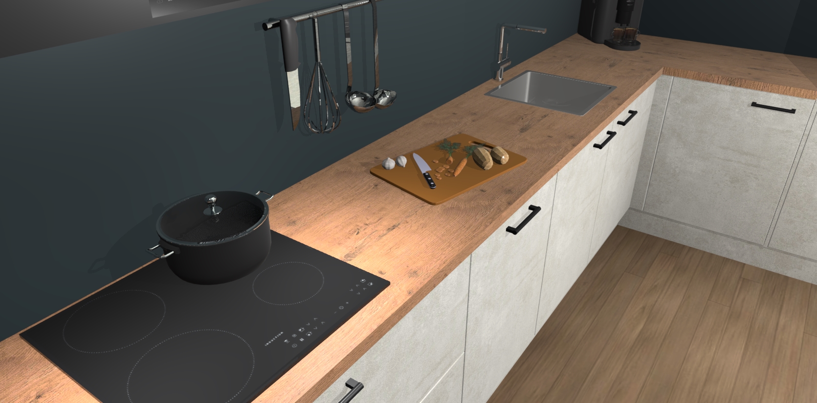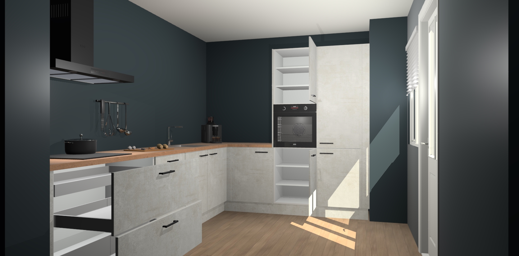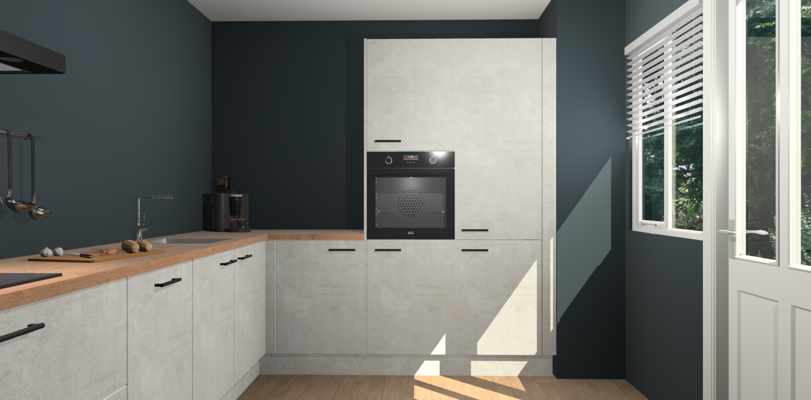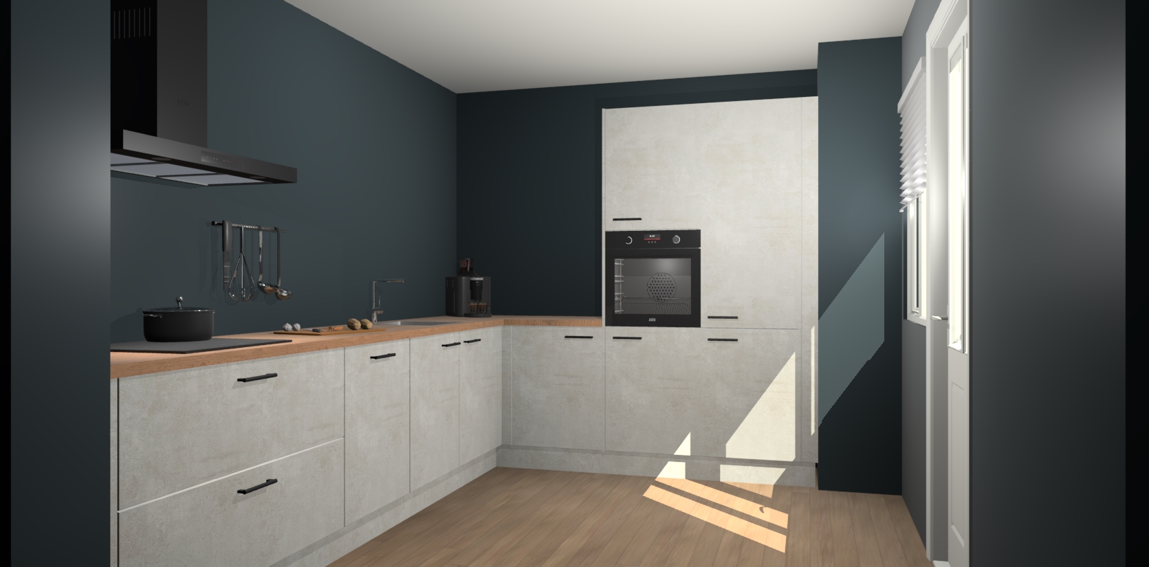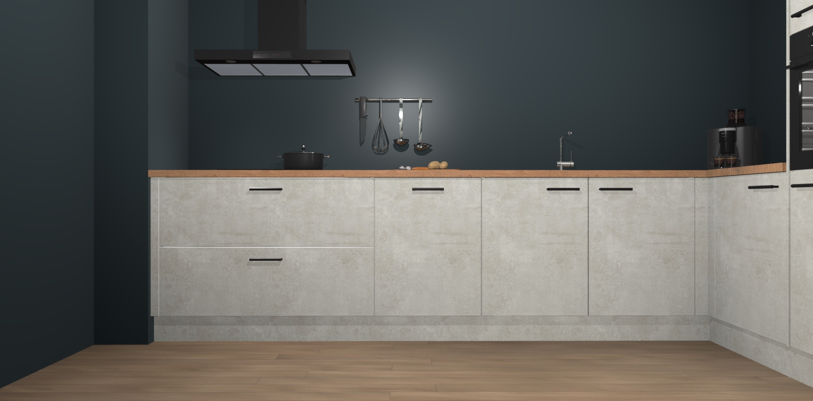 Welkom bij de Beton Opaal keuken Portland. Deze prachtige keuken zal de komende jaren het middelpunt van de belangstelling in uw huis zijn. Uitgerust met vijf inbouwapparaten komt u nooit kookgereedschap tekort. Bovendien geeft de warme houtlook elke ruimte een uitnodigende en tijdloze uitstraling.