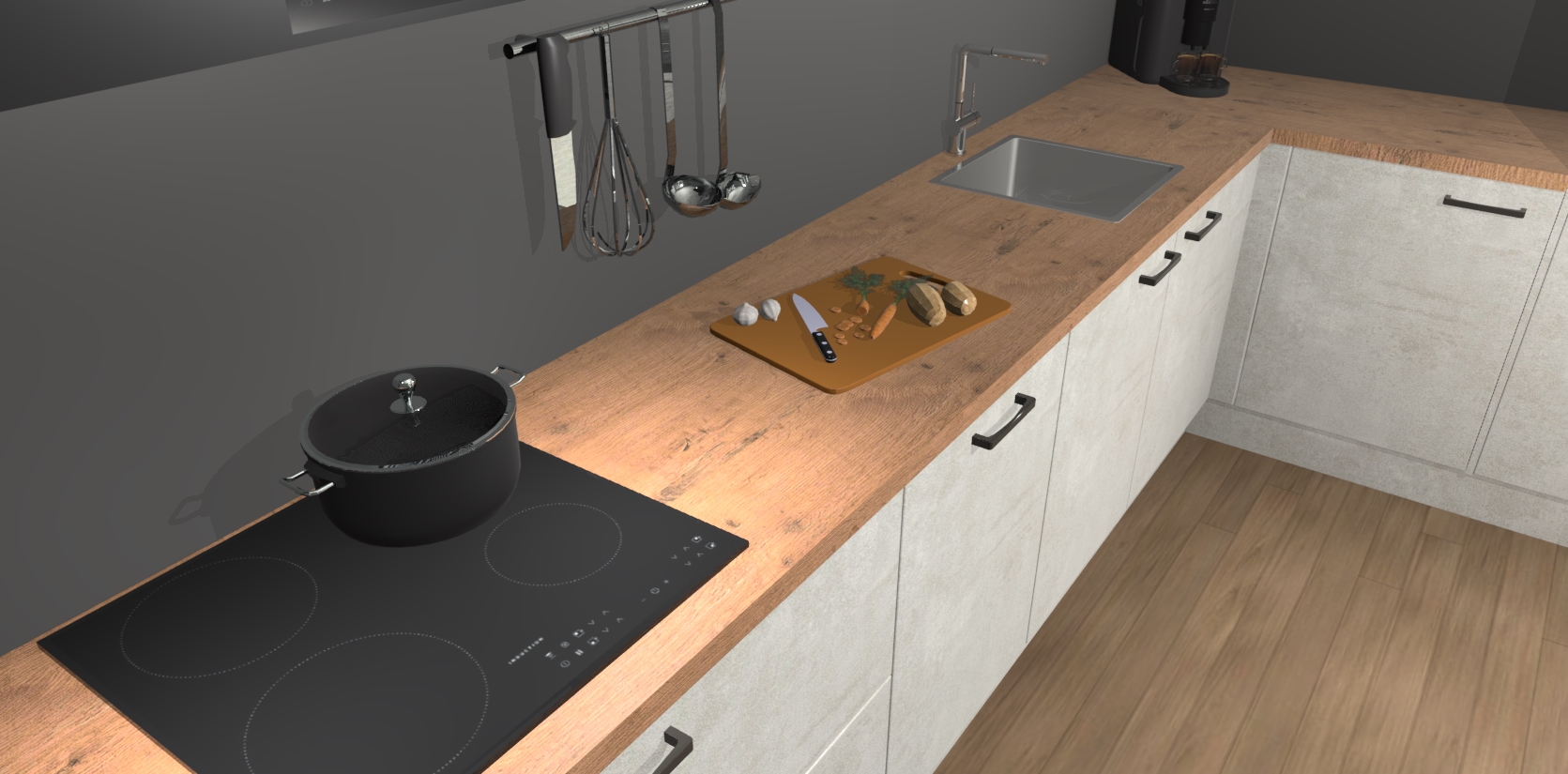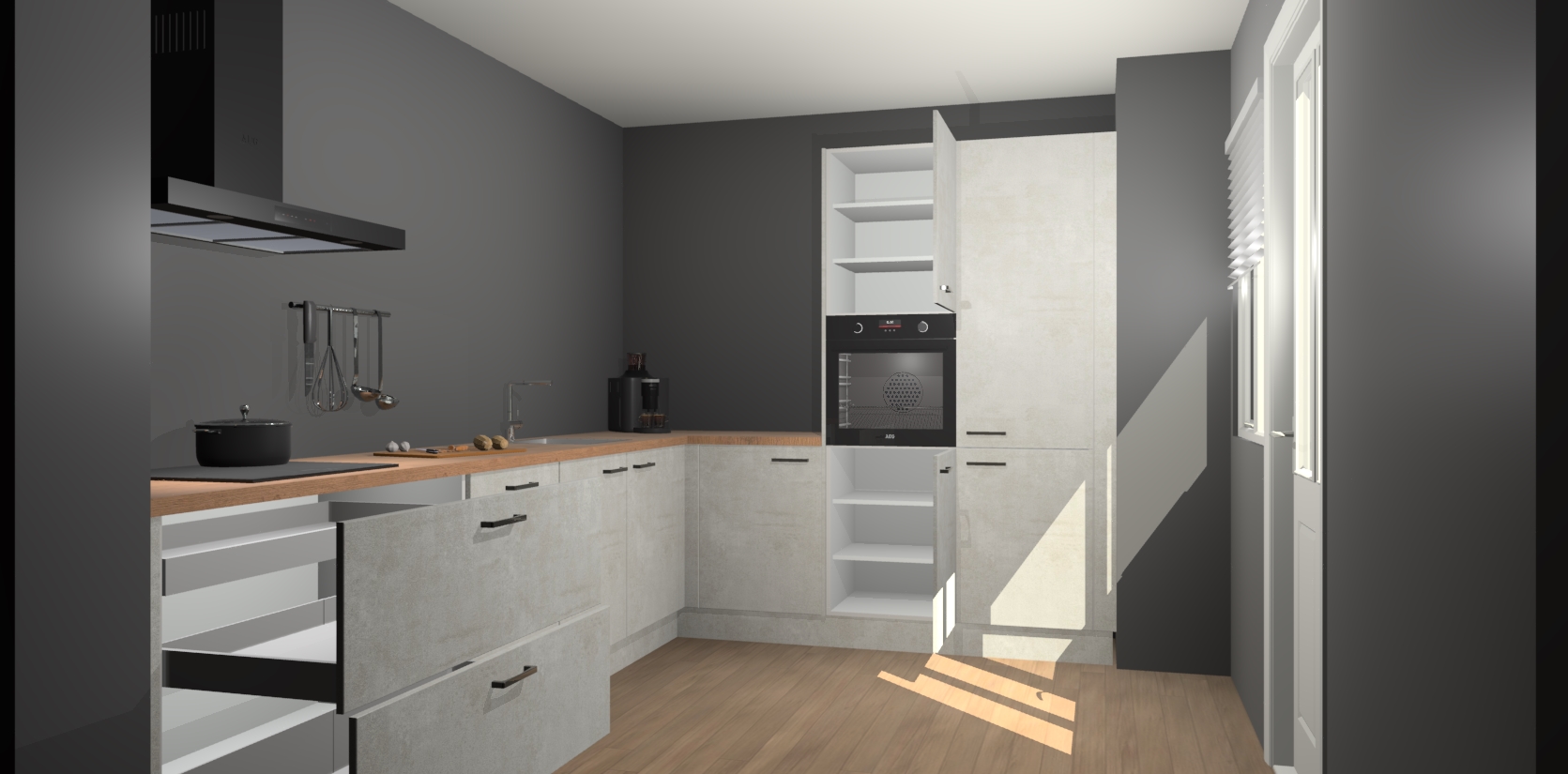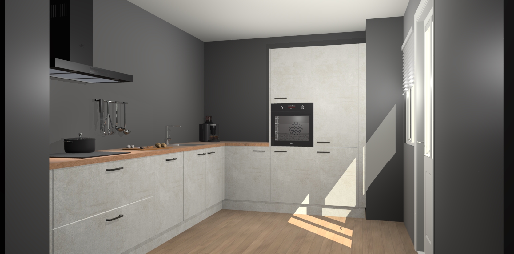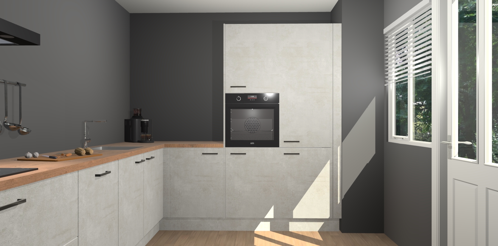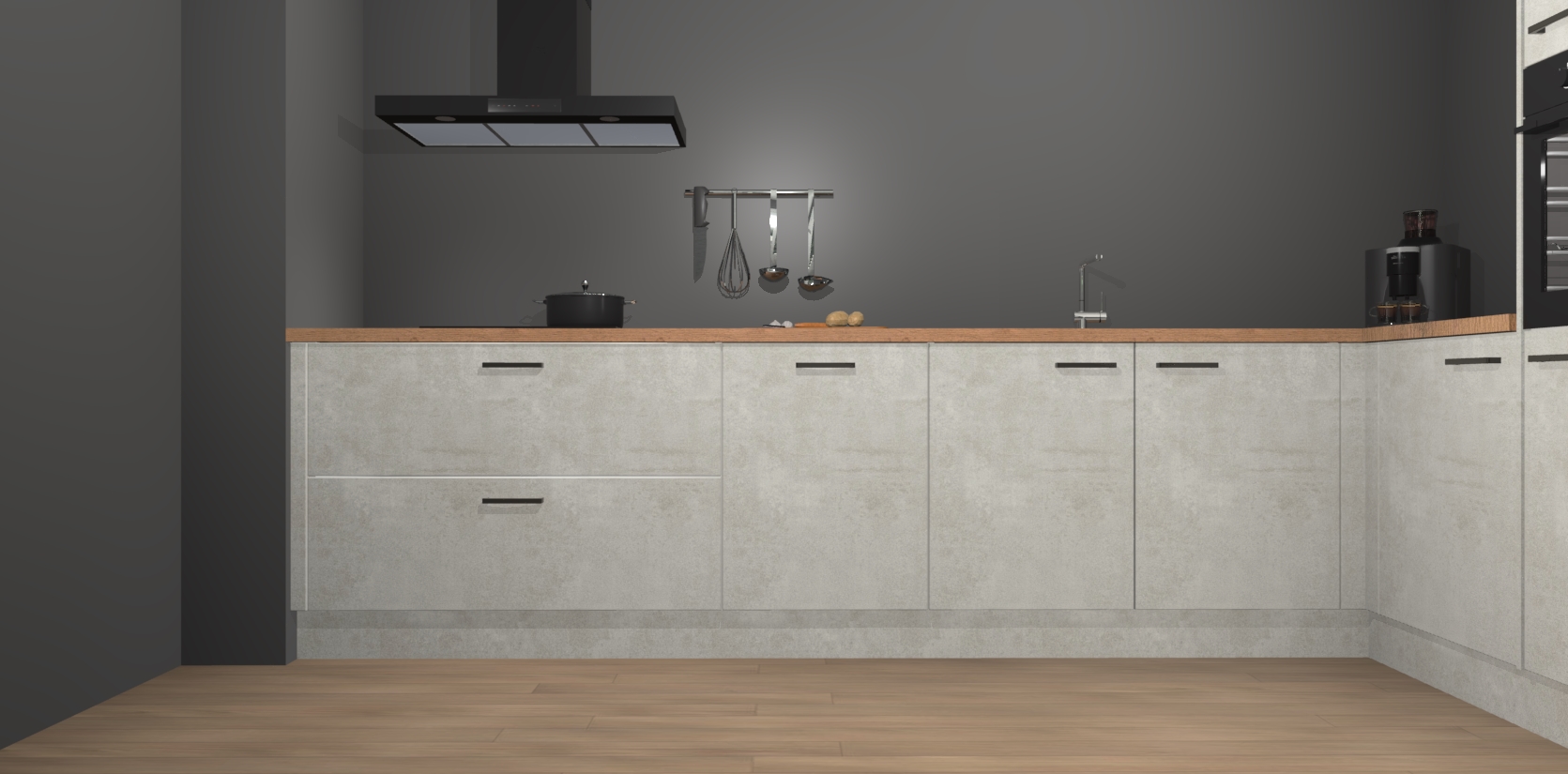 Welkom bij de Beton Opaal keuken Portland. Deze prachtige keuken zal de komende jaren het middelpunt van de belangstelling in uw huis zijn. Uitgerust met vijf inbouwapparaten komt u nooit kookgereedschap tekort. Bovendien geeft de warme houtlook elke ruimte een uitnodigende en tijdloze uitstraling.