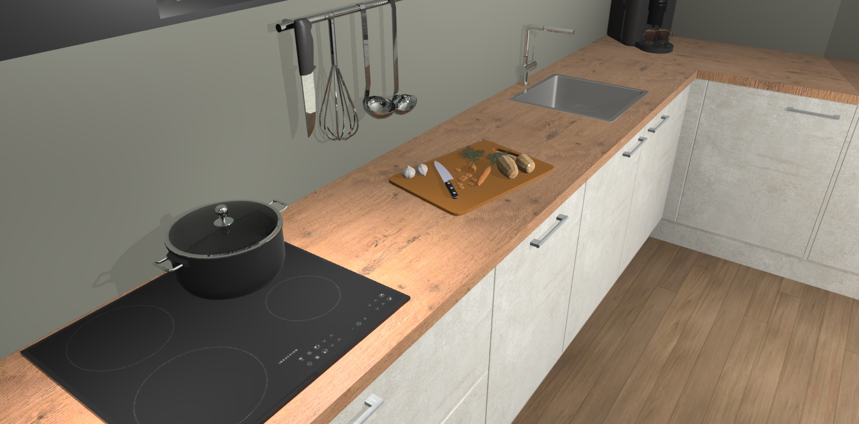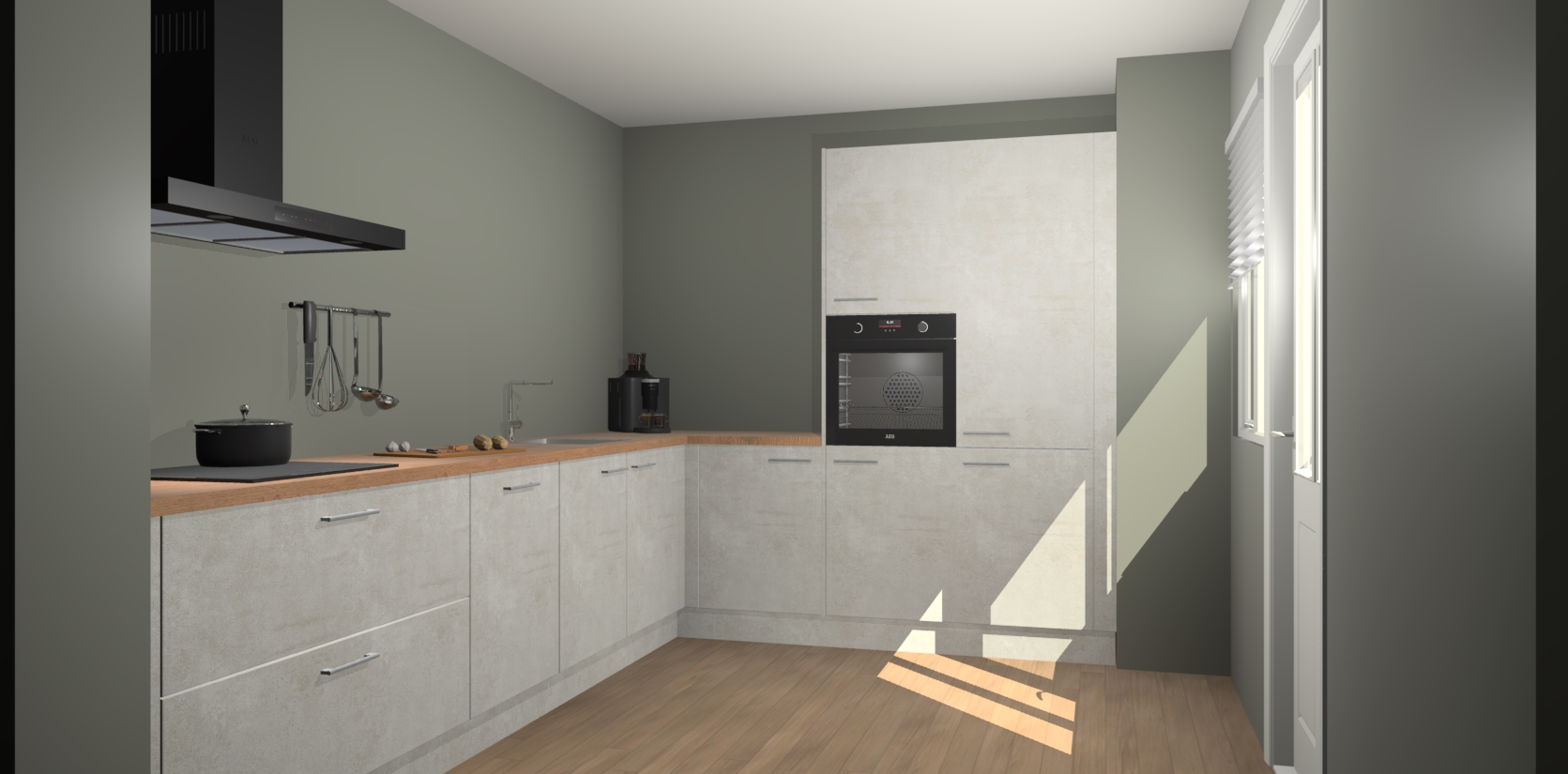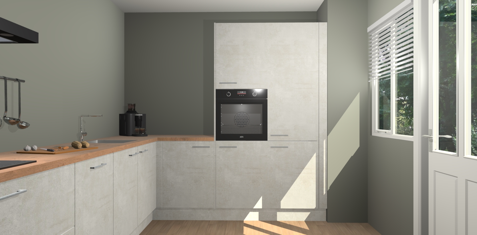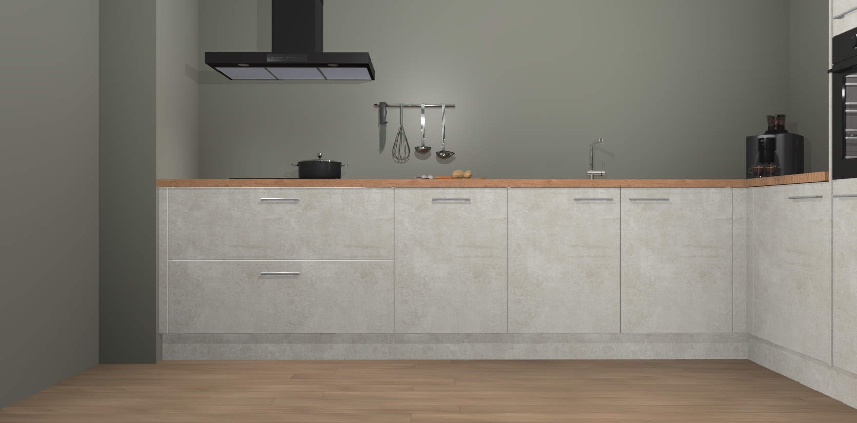 Welkom bij de Beton Opaal keuken Portland. Deze prachtige keuken zal de komende jaren het middelpunt van de belangstelling in uw huis zijn. Uitgerust met vijf inbouwapparaten komt u nooit kookgereedschap tekort. Bovendien geeft de warme houtlook elke ruimte een uitnodigende en tijdloze uitstraling.