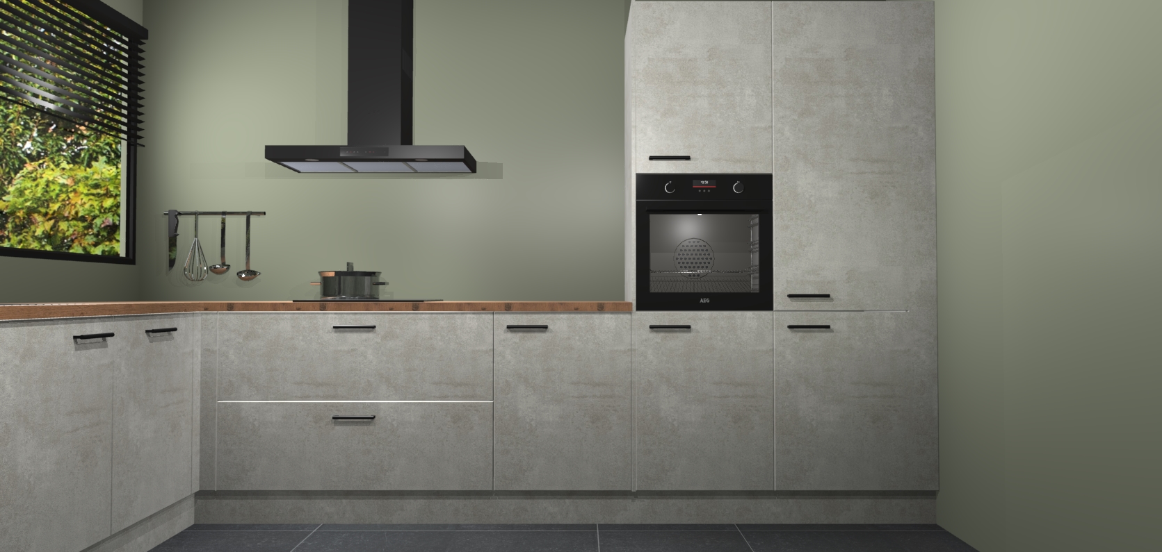 Met een modern, tijdloos design en ruime opslagruimte, zult u zich in no-time thuis voelen in uw nieuwe keuken. Uw leven wordt eenvoudiger met de soft-close deuren die voor het ultieme stille comfort zorgen - geen geluid dat u stoort terwijl u kookt. Ook is de keuken voorzien van 5 ingebouwde apparaten: een oven, inductie kookplaat, afzuigkap, vaatwasser en koelkast. Deze kunnen gemakkelijk na bestelling worden bijgewerkt naar AEG - waardoor uw luxe ervaring compleet is.