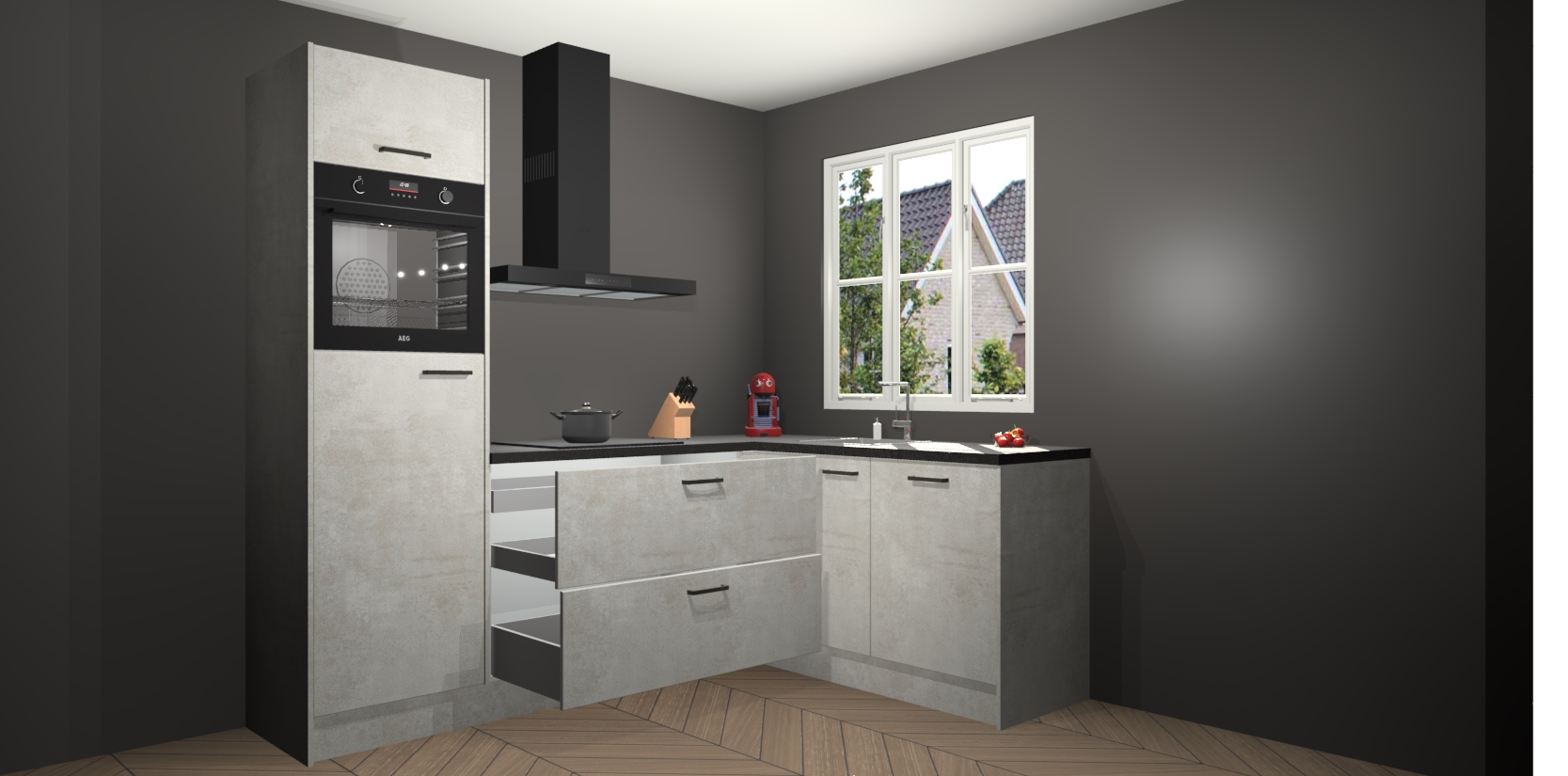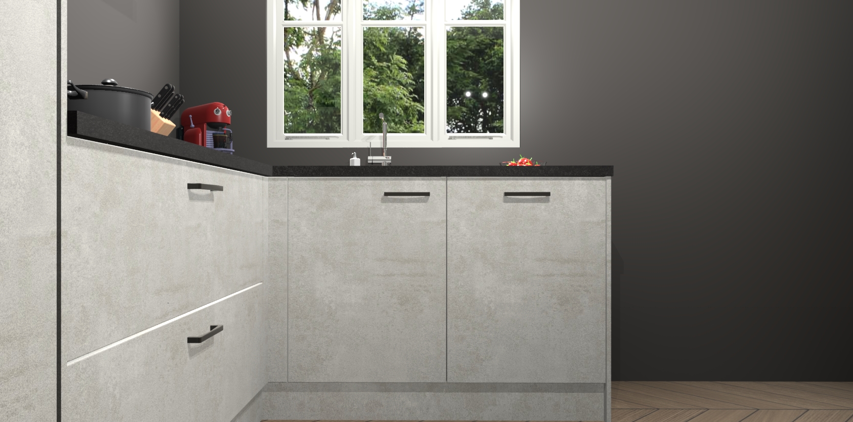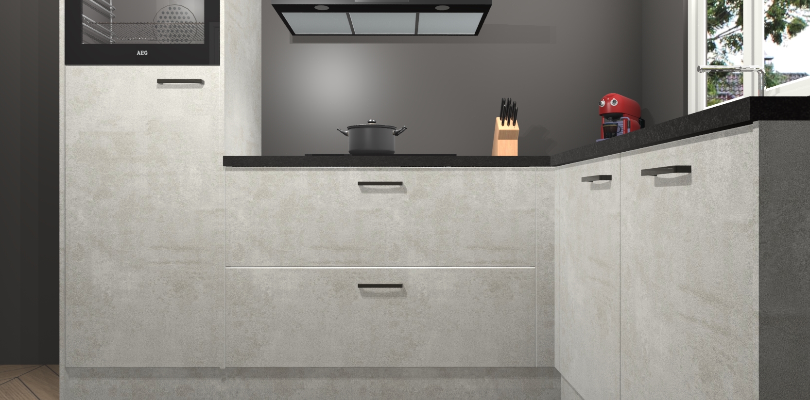 Dit model biedt u voldoende opbergruimte en vijf ingebouwde apparaten: een oven, inductiekookplaat, afzuigkap, vaatwasser en koelkast. Deze apparaten kunnen gemakkelijk worden geüpgrade naar AEG nadat u besteld heeft. De verschillende laden en kastjes bevatten softclose-deuren waardoor ze gezellig dichtvallen met een geruststellend helemaal geruisloos geluid. En dat is nog niet alles! We garanderen ook dat de prijs altijd laag blijft - dus haal nu uw Beton opaal keuken Victoria terwijl het kan.