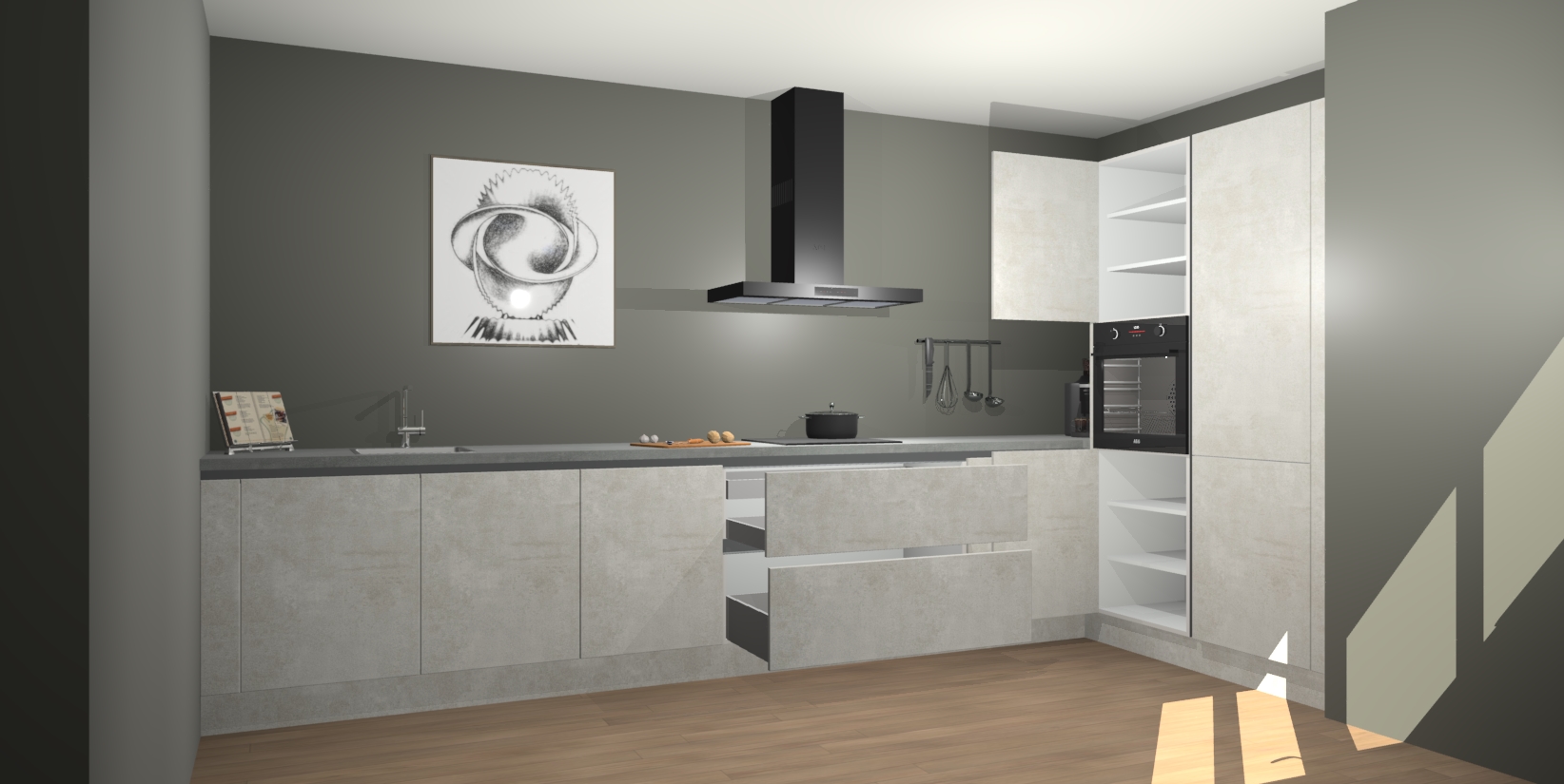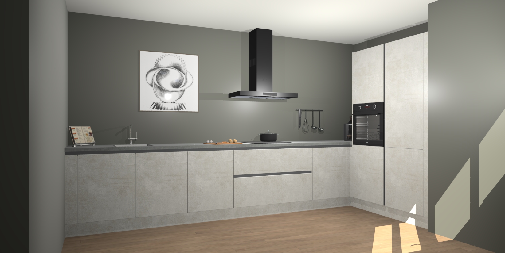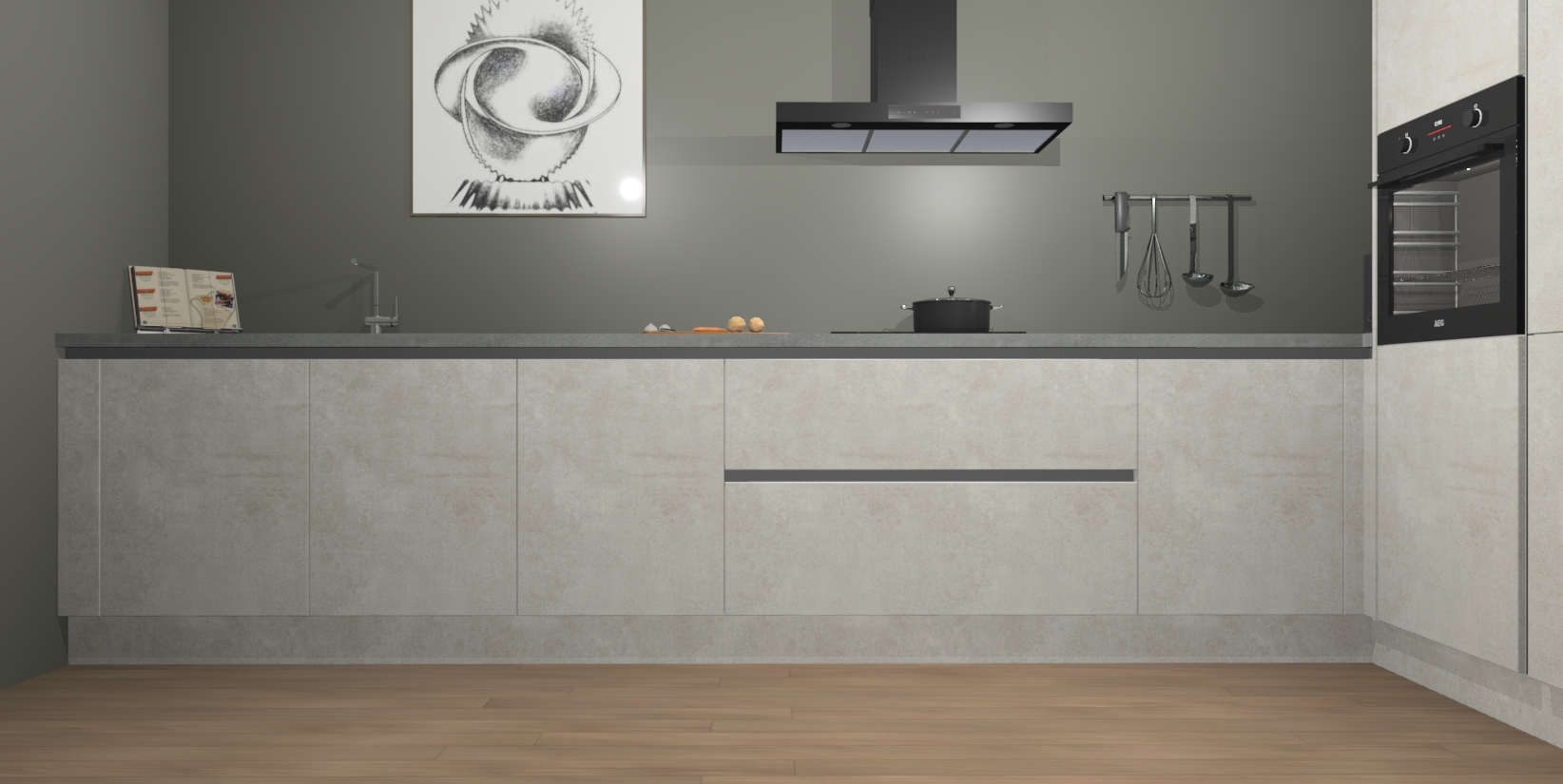 Welkom bij de Beton Opal greeploze keuken Khao Lak. Deze prachtige keuken zal de komende jaren het middelpunt van de belangstelling in uw huis zijn. Uitgerust met vijf inbouwapparaten komt u nooit kookgereedschap tekort. Bovendien geeft de warme houtlook elke ruimte een uitnodigende en tijdloze uitstraling.