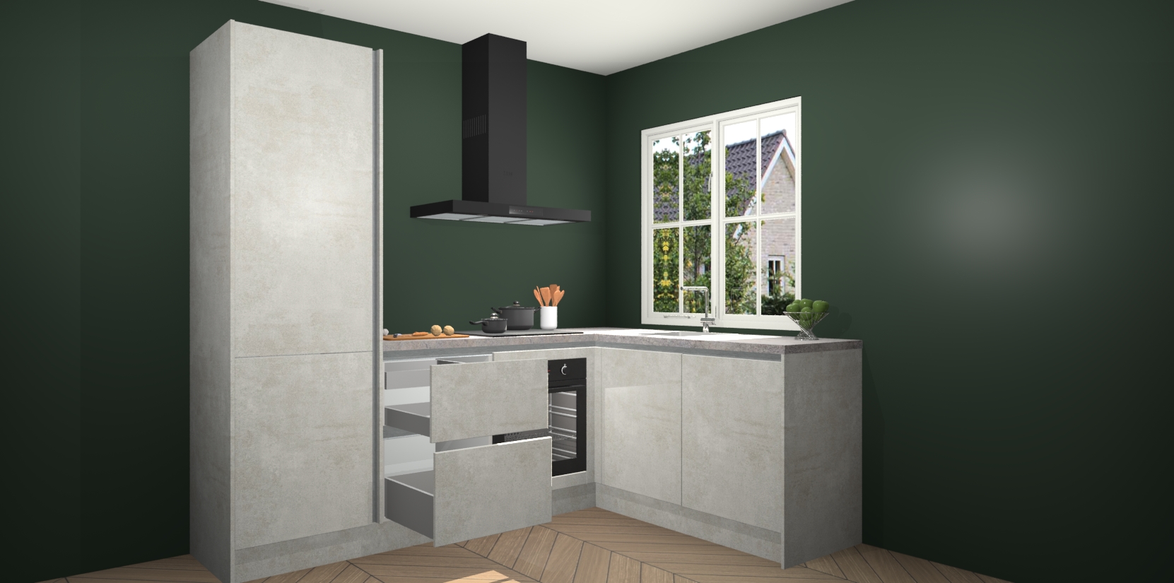 De Beton Opal greeploze keuken Linz is de perfecte keuze voor uw nieuwe moderne en tijdloze keuken. Ga voor moderne en tijdloze elegantie in uw keuken. De prachtige hoekkeuken biedt een verfrissende kijk op de manier waarop we ons vertrouwde keukenontwerp kunnen aanpassen in een nieuwe stijl.  Één blik om alles te zien: zo mooi dat het bijna magisch lijkt.