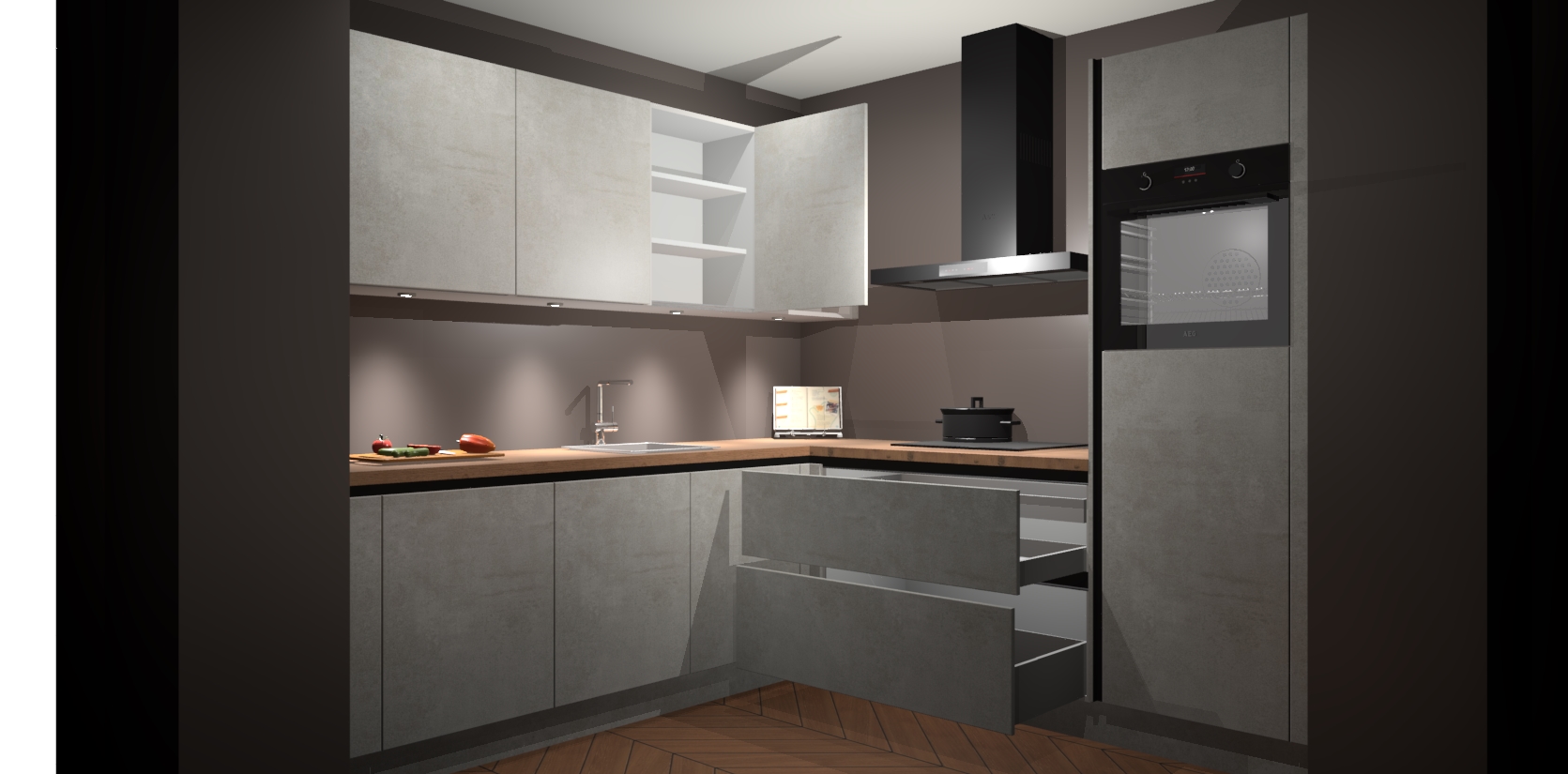 Met een modern, tijdloos design en ruime opslagruimte, zult u zich in no-time thuis voelen in uw nieuwe keuken. Uw leven wordt eenvoudiger met de soft-close deuren die voor het ultieme stille comfort zorgen - geen geluid dat u stoort terwijl u kookt. Ook is de keuken voorzien van 5 ingebouwde apparaten: een oven, inductie kookplaat, afzuigkap, vaatwasser en koelkast. Deze kunnen gemakkelijk na bestelling worden bijgewerkt naar AEG - waardoor uw luxe ervaring compleet is.