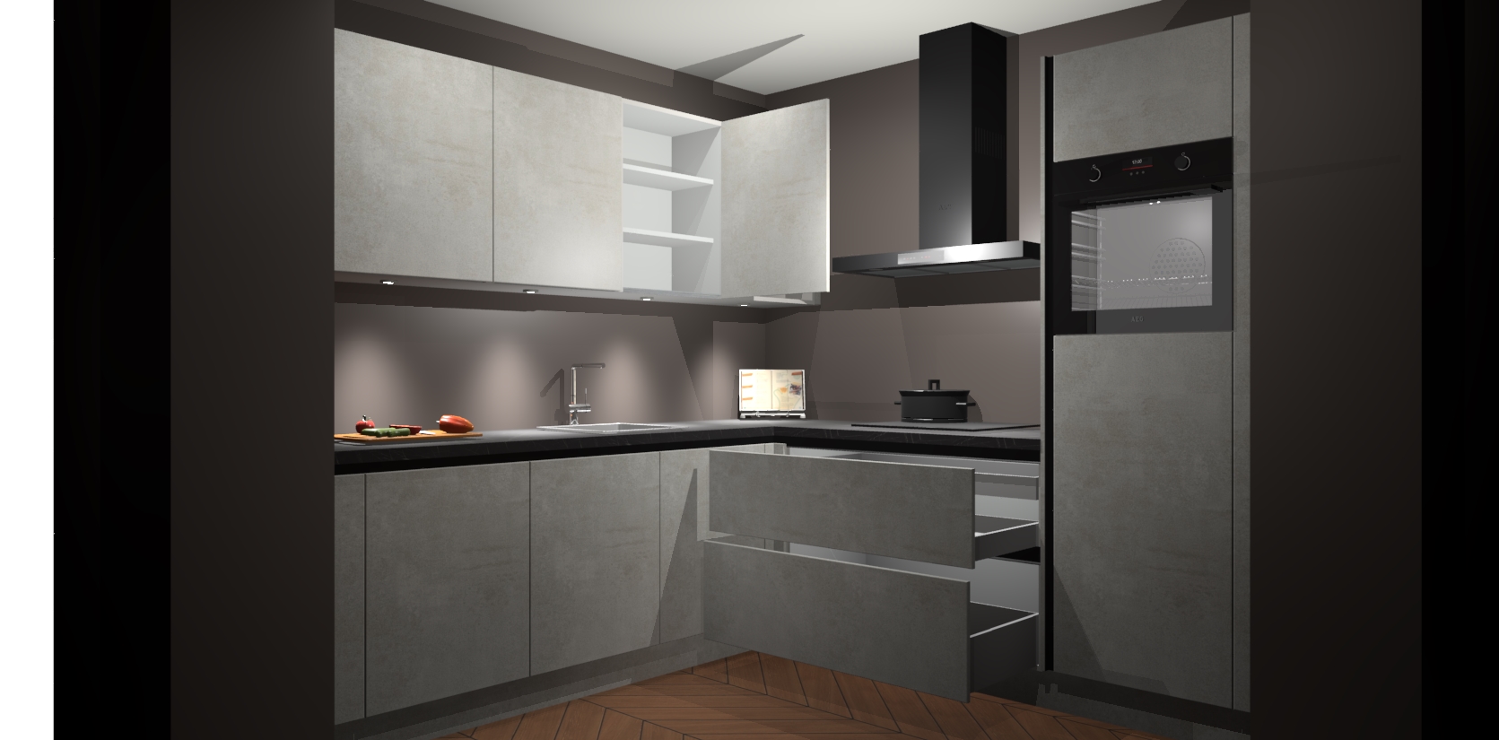 Met een modern, tijdloos design en ruime opslagruimte, zult u zich in no-time thuis voelen in uw nieuwe keuken. Uw leven wordt eenvoudiger met de soft-close deuren die voor het ultieme stille comfort zorgen - geen geluid dat u stoort terwijl u kookt. Ook is de keuken voorzien van 5 ingebouwde apparaten: een oven, inductie kookplaat, afzuigkap, vaatwasser en koelkast. Deze kunnen gemakkelijk na bestelling worden bijgewerkt naar AEG - waardoor uw luxe ervaring compleet is.