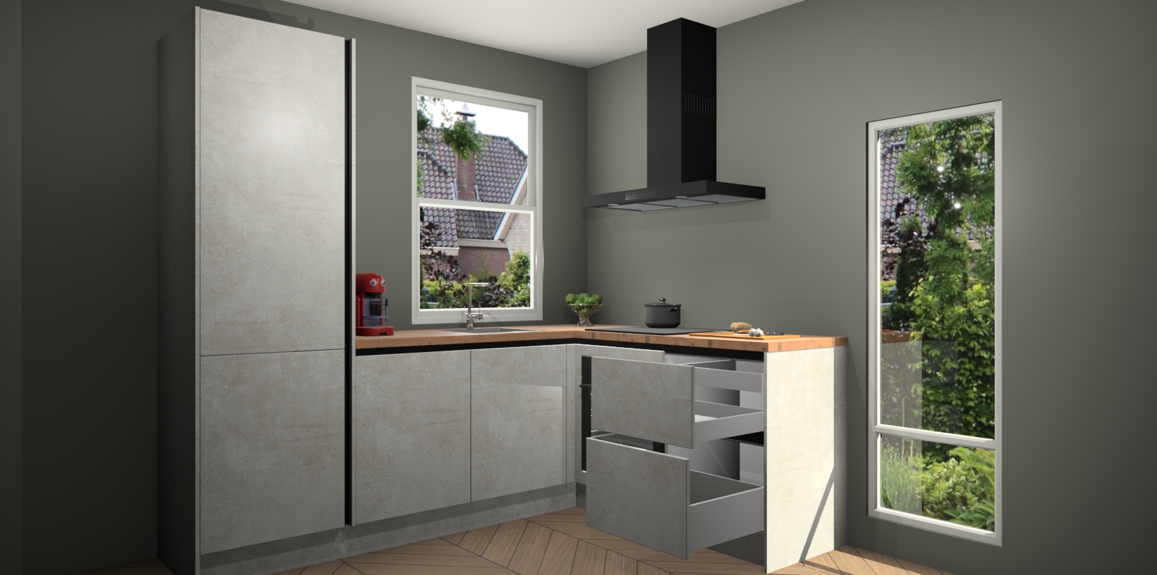 De Beton Opal greeploze keuken Phuket heeft alles wat u maar kunt wensen. Niet alleen zijn er softclose deuren, maar ook 5 ingebouwde apparaten: een oven, inductiekookplaat, afzuigkap, vaatwasser en koelkast - waarbij u later gemakkelijk naar het AEG merk, van inductiekookplaat naar kookplaat met geïntegreerde afzuiging of van oven naar combimagnetron kunt upgraden. Dat alles tegen een vast laag tarief! Bovendien geeft de Beton Opal greeploze keuken Phuket supersnelle levering van 7 weken. Echt iets voor u als u er niet op wilt wachten om het resultaat te zien in eigen keuken!