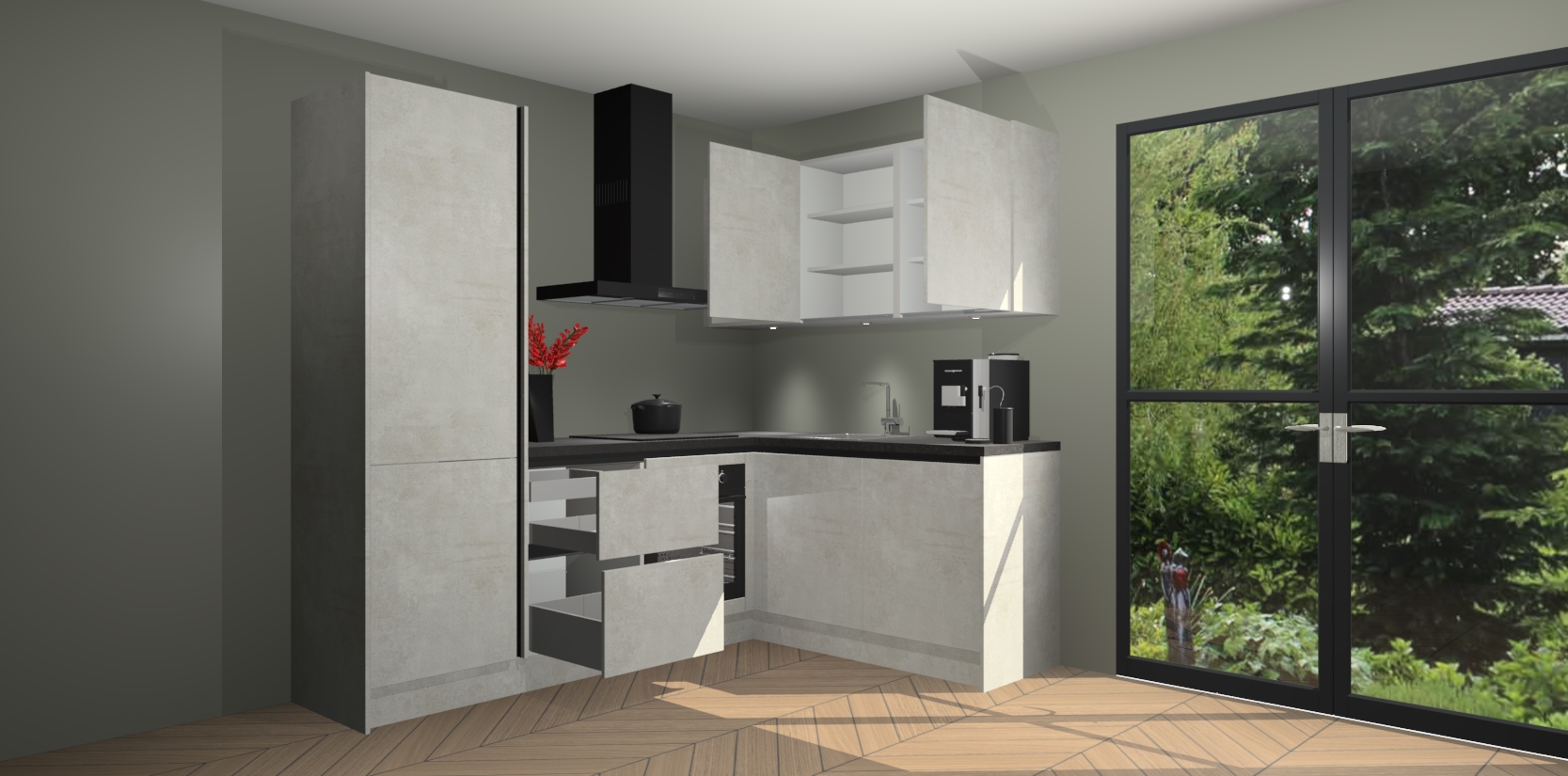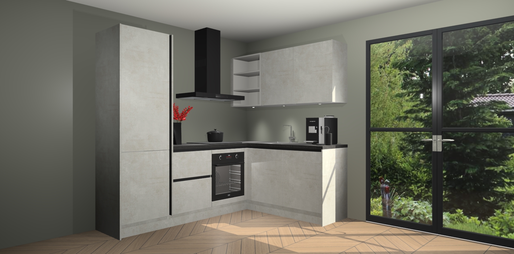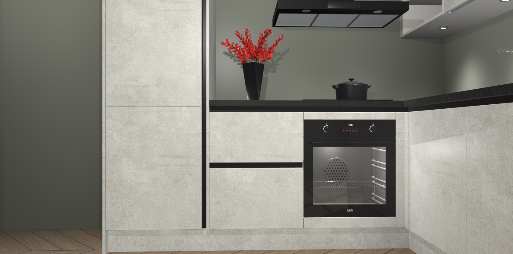 Wauw, dit is de Beton Opal greeploze keuken Pilsen! U kunt gerust zeggen dat u elegantie combineert met functionaliteit met deze keuken. Met een modern en chique ontwerp is de keuken precies wat u nodig heeft om uw ruimte te verfraaien. De binnenzijde van de kasten is in dezelfde donkere kleur als de buitenzijde voor een uniforme look, compleet met softclose-kasten die stil sluiten.