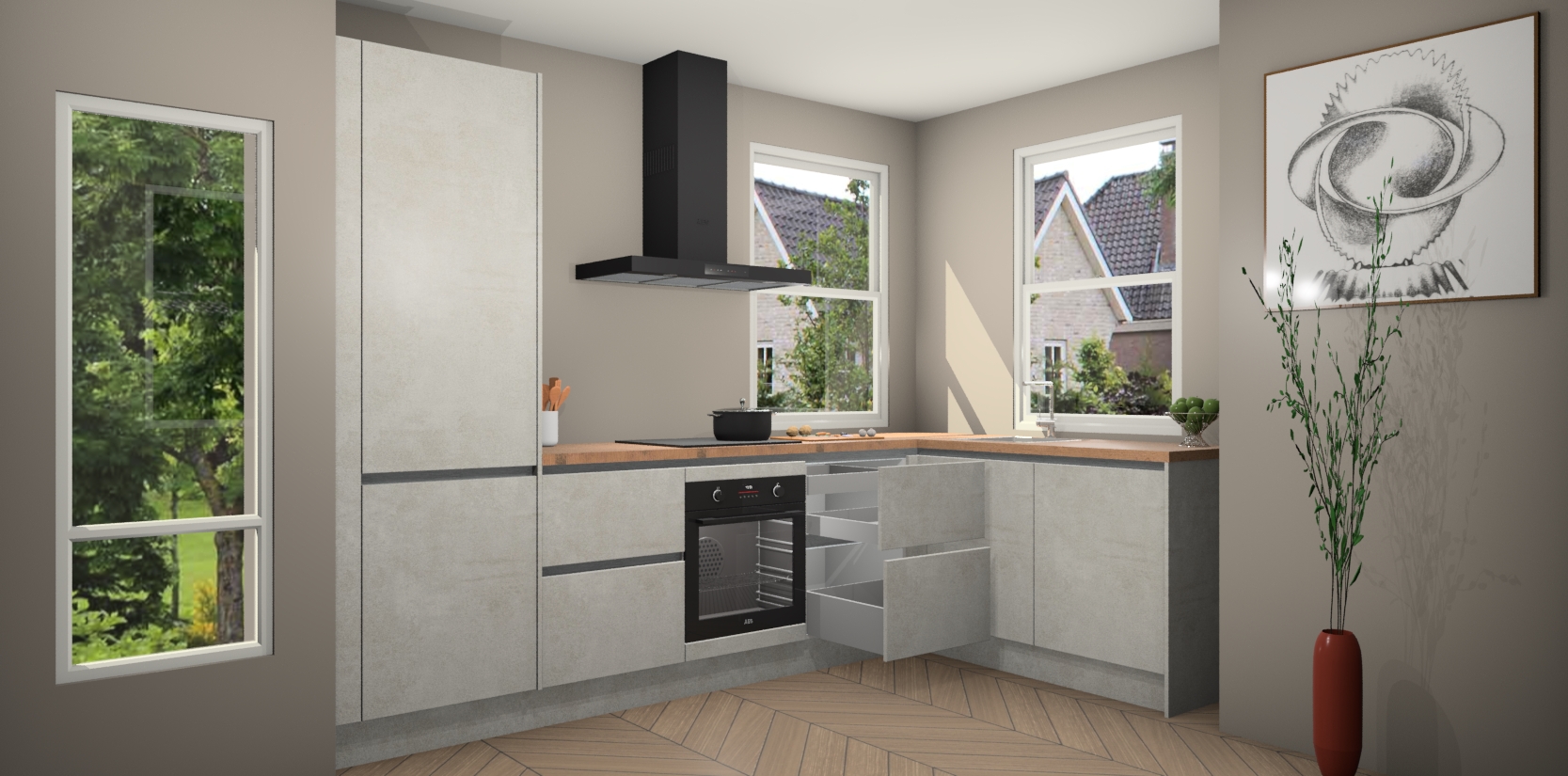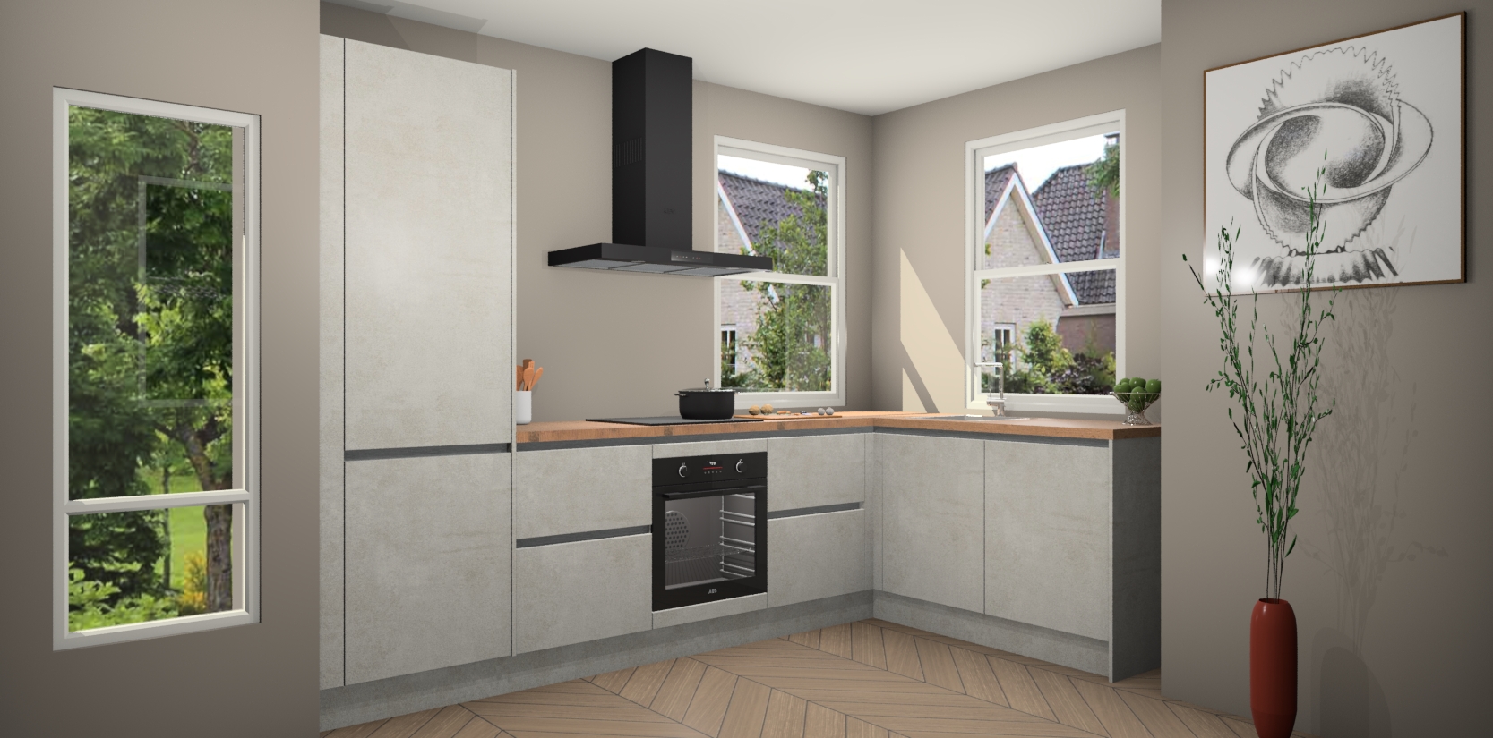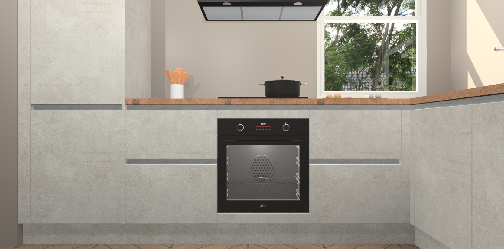 Wat maakt deze keuken zo bijzonder? Ten eerste geeft het houten werkblad uw ruimte een onmiskenbaar klassieke uitstraling. De natuurlijke afwerking roept warmte en elegantie op die nooit uit de mode zullen raken. Bovendien is het gemakkelijk schoon te houden en te onderhouden, zodat je er jarenlang plezier van kunt hebben. Als u op zoek bent naar extra gemak in uw keuken, dan heeft u bij het plaatsen van een bestelling bij ons ook de optie om uw toestellen te upgraden naar AEG-modellen - zo haalt u moderne innovatie van topmerken in apparatentechnologie rechtstreeks in huis.
