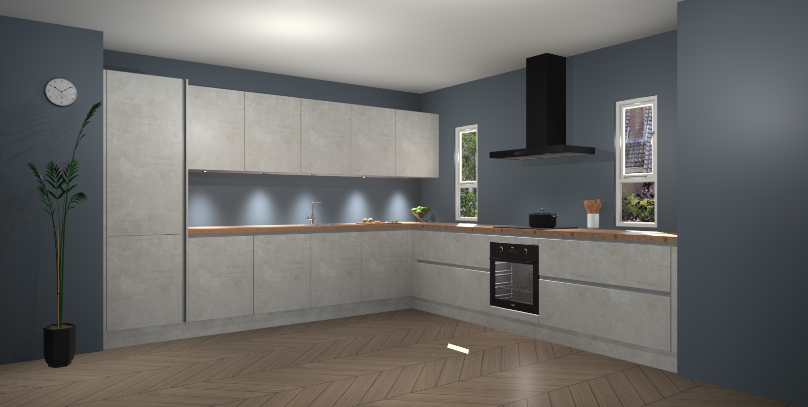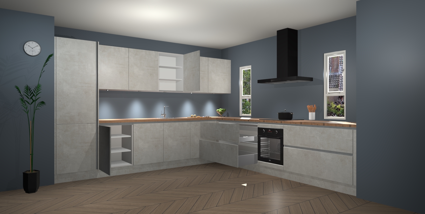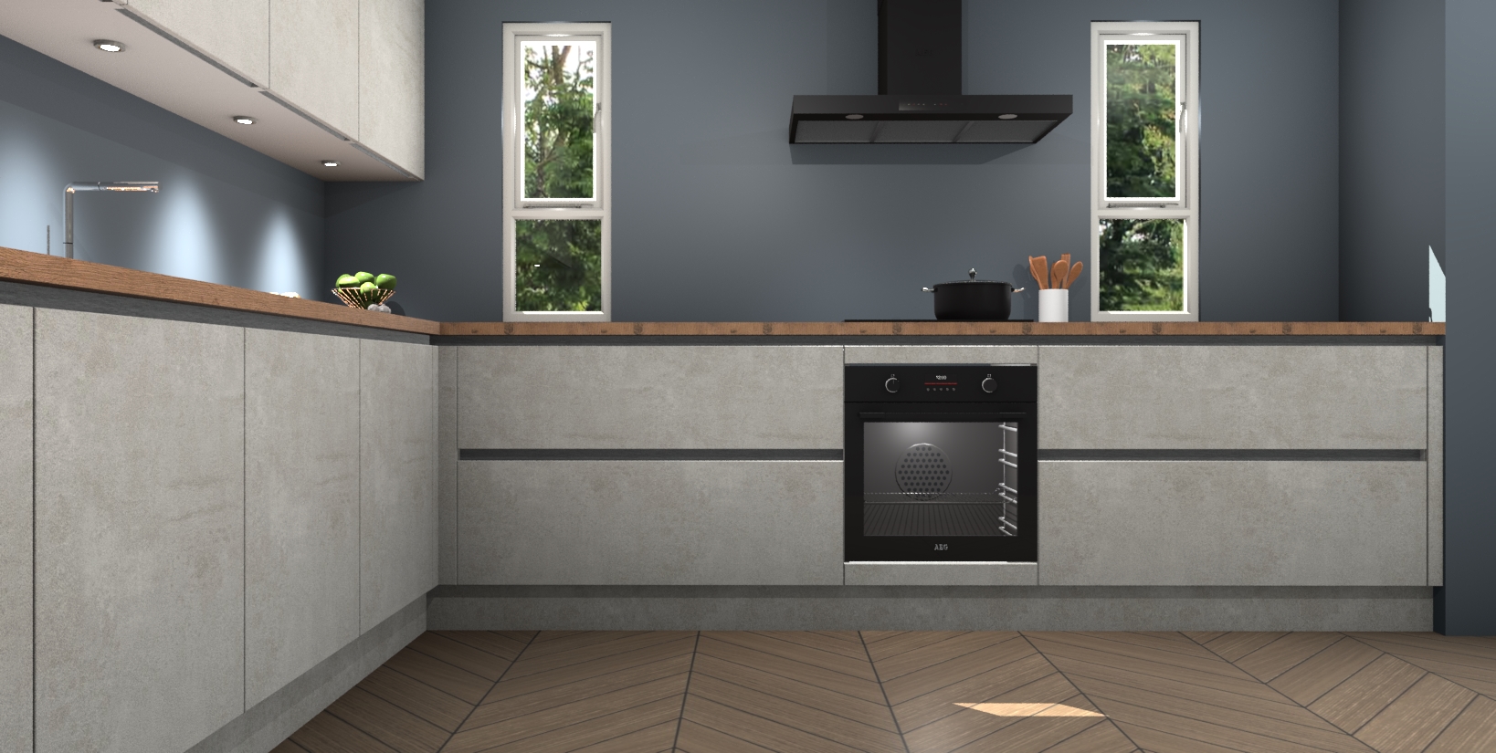 De beton opal greeploze keuken is een ideale hoekkeuken en heeft alle functies en apparatuur die u maar nodig kunt hebben. Bij de bestelling krijgt u een oven, inductiekookplaat, afzuigkap, vaatwasser en koelkast - deze kunnen desgewenst eenvoudig worden uitgebreid naar AEG na bestellen. Elke kast wordt ook voor gemonteerd geleverd met soft close deuren die jarenlang gebruik beloven. Stelt u zich voor dat u geen gedoe heeft met vervelende montage - vanaf het moment dat u uw bestelling plaats, duurt het slechts 7 weken voor het bij u thuis geleverd wordt.
