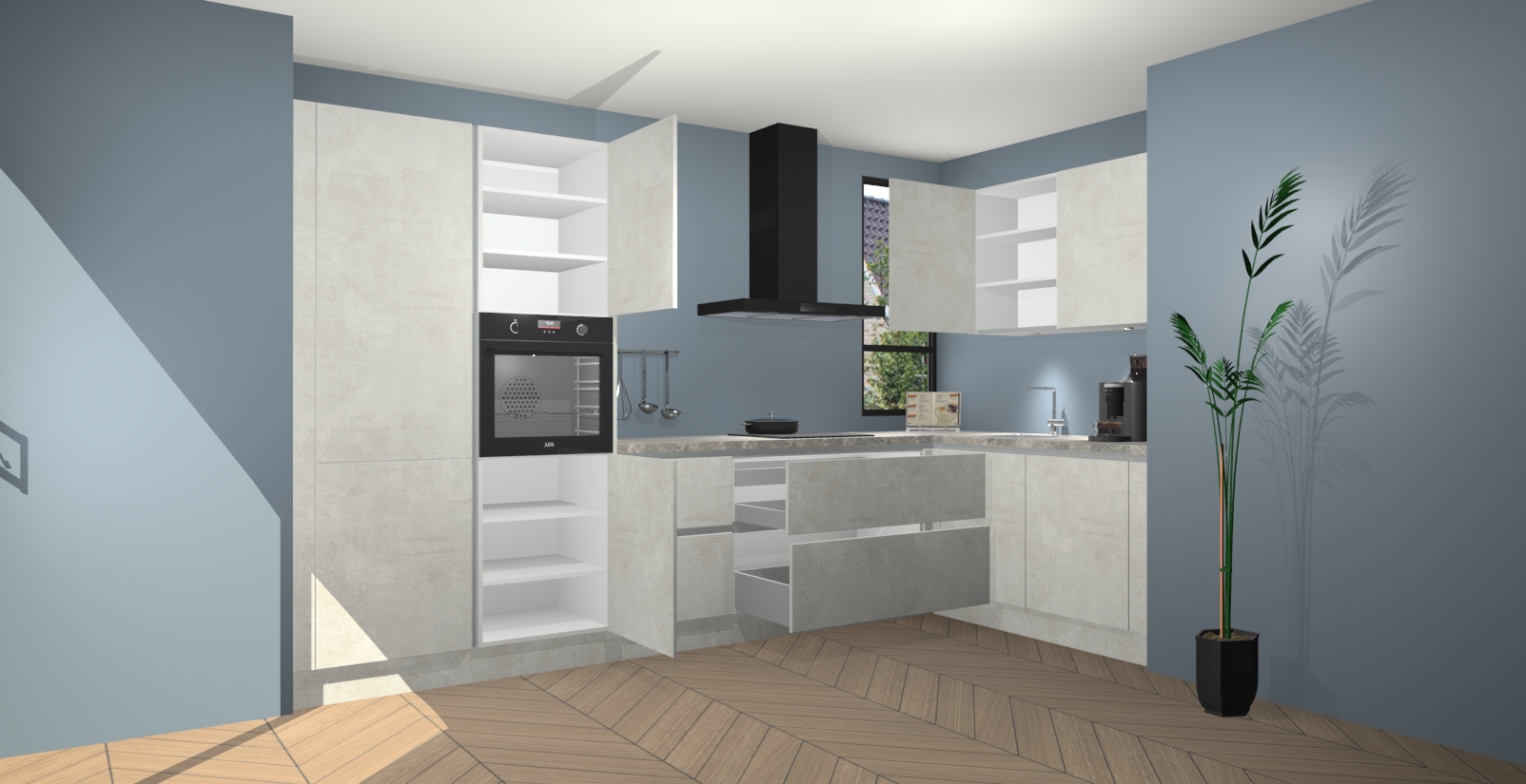 Welkom in uw nieuwe moderne keuken! Laat ons u voorstellen aan de Beton Opal greeploze keuken Vlaanderen . Deze prachtige hoekkeuken straalt exclusiviteit en luxe uit als geen ander. Het strakke design, de tijdloze kleuren en het greeploze model maken van deze keuken een moderne klassieker. En met voldoende opbergruimte heeft deze keuken echt voor ieder wat wils.