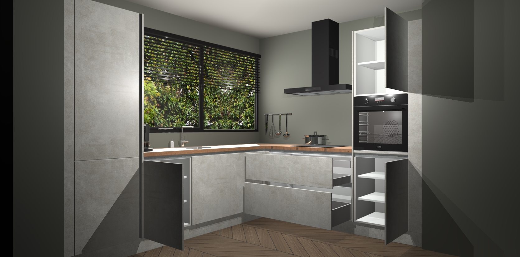 Met een modern, tijdloos design en ruime opslagruimte, zult u zich in no-time thuis voelen in uw nieuwe keuken. Uw leven wordt eenvoudiger met de soft-close deuren die voor het ultieme stille comfort zorgen - geen geluid dat u stoort terwijl u kookt. Ook is de keuken voorzien van 5 ingebouwde apparaten: een oven, inductie kookplaat, afzuigkap, vaatwasser en koelkast. Deze kunnen gemakkelijk na bestelling worden bijgewerkt naar AEG - waardoor uw luxe ervaring compleet is.