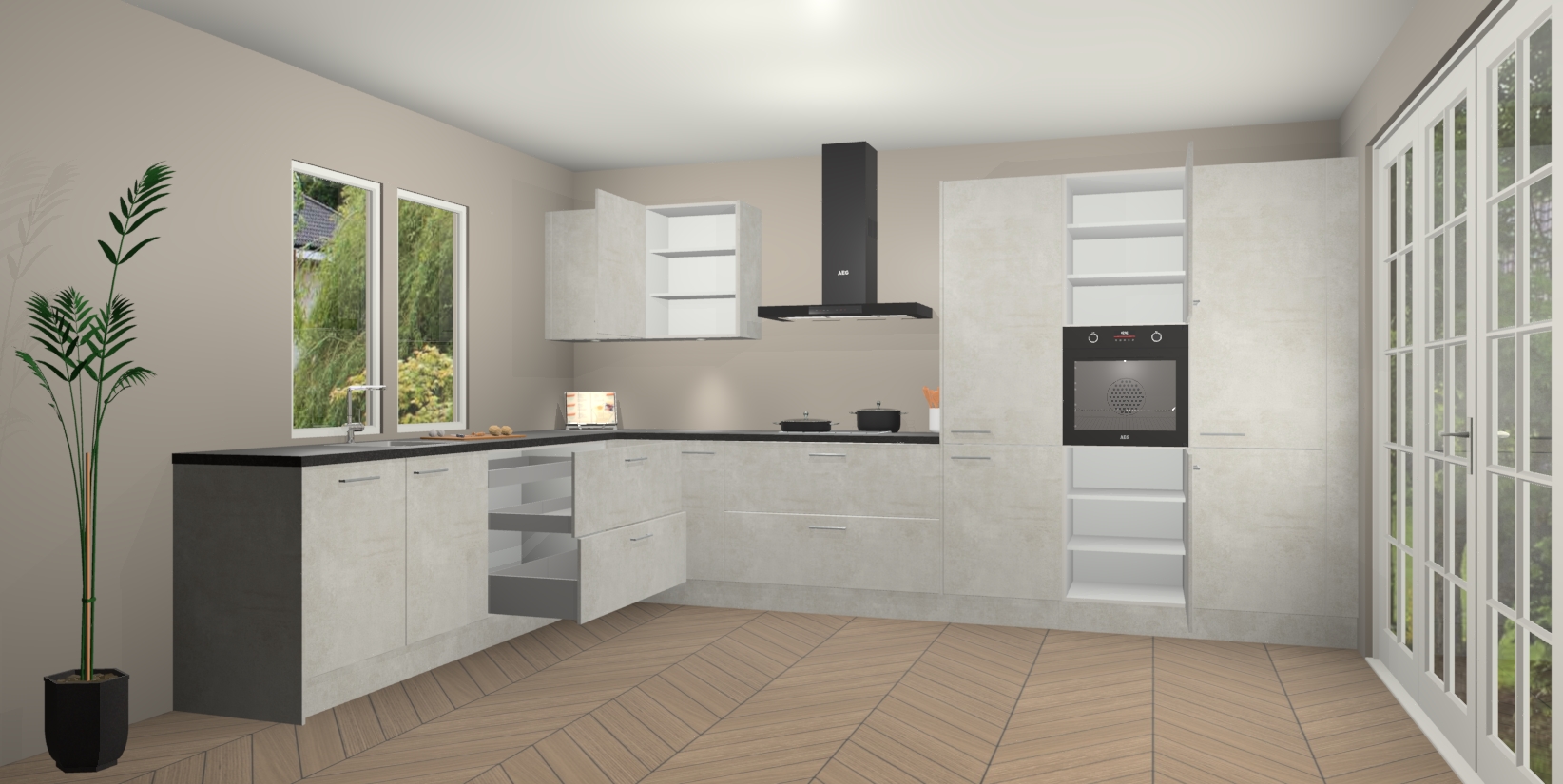Heeft u nog apparatuur nodig? Geen probleem: de Beton Opal keuken Debrecen bevat vijf ingebouwde apparaten - een oven, inductiekookplaat, afzuigkap, vaatwasser en koelkast - die gemakkelijk kunnen worden bijgewerkt naar AEG na bestelling. En als dat nog niet genoeg is; onze kasten worden pre-geassembleerd geleverd en zijn verkrijgbaar tegen een vastgeroeste lage prijs! U hoeft nooit meer te zoeken naar goede kwaliteit en service want onze producten hebben echt Duitse kwaliteit.