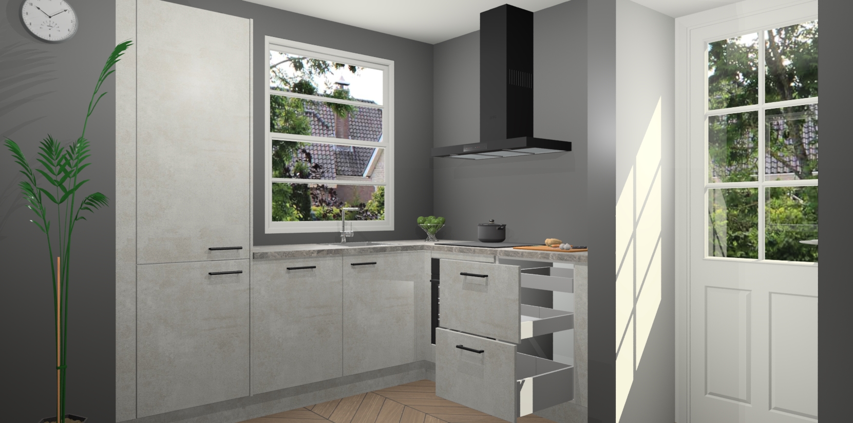 Wilt u een echte aanwinst voor uw keuken, maar bent u op zoek naar iets specialers dan de standaardkeukens? Kies dan voor de Beton Opal keuken Harbin! Dit prachtige hoekkeukenontwerp geeft u alle ruimte om optimaal te genieten van heerlijk koken. Het uitmuntende afwerkingsniveau, de fraaie houtstructuur en de sfeervolle zwarte grepen maken van de Beton Opal keuken Harbin de perfecte keuze voor zowel enthousiaste thuiskoks als design-minded interieurliefhebbers.