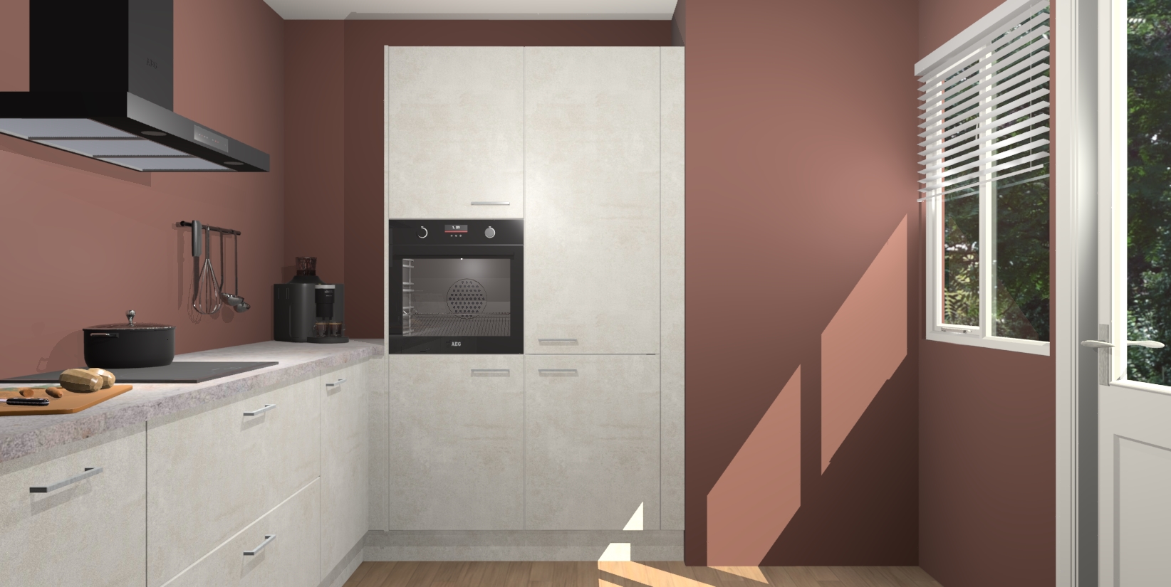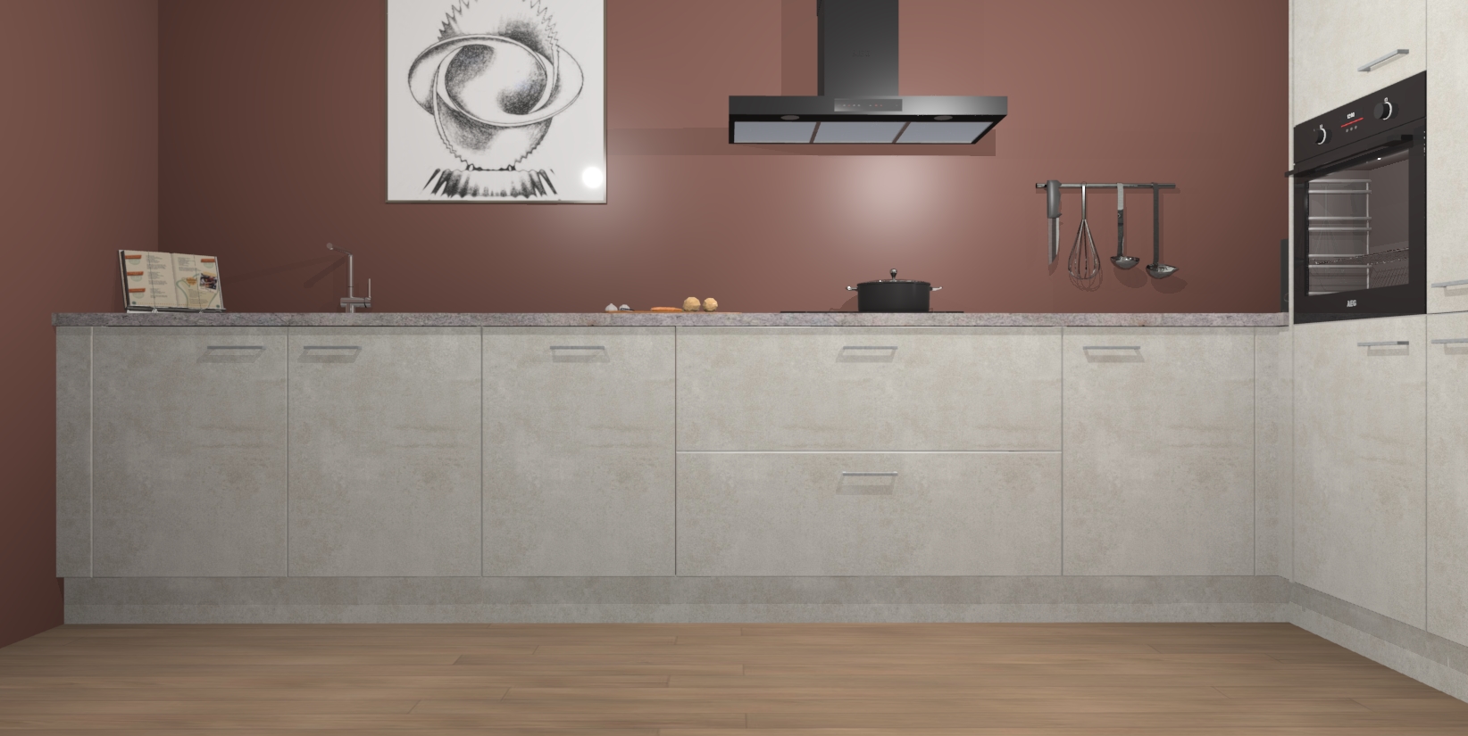 Welkom bij de Beton Opal keuken Khao Lak. Deze prachtige keuken zal de komende jaren het middelpunt van de belangstelling in uw huis zijn. Uitgerust met vijf inbouwapparaten komt u nooit kookgereedschap tekort. Bovendien geeft de warme houtlook elke ruimte een uitnodigende en tijdloze uitstraling.