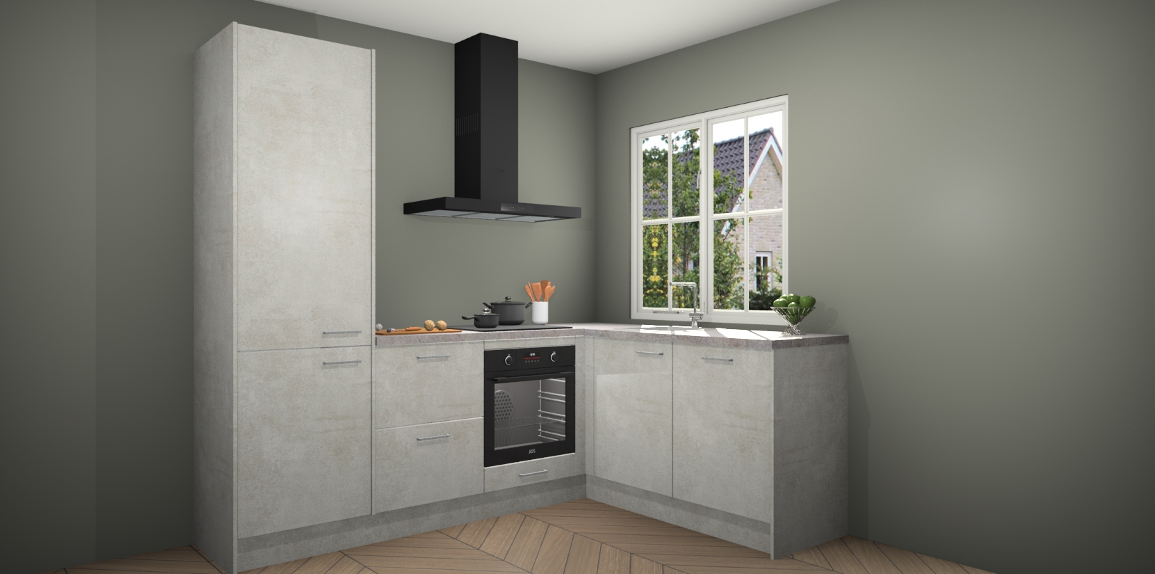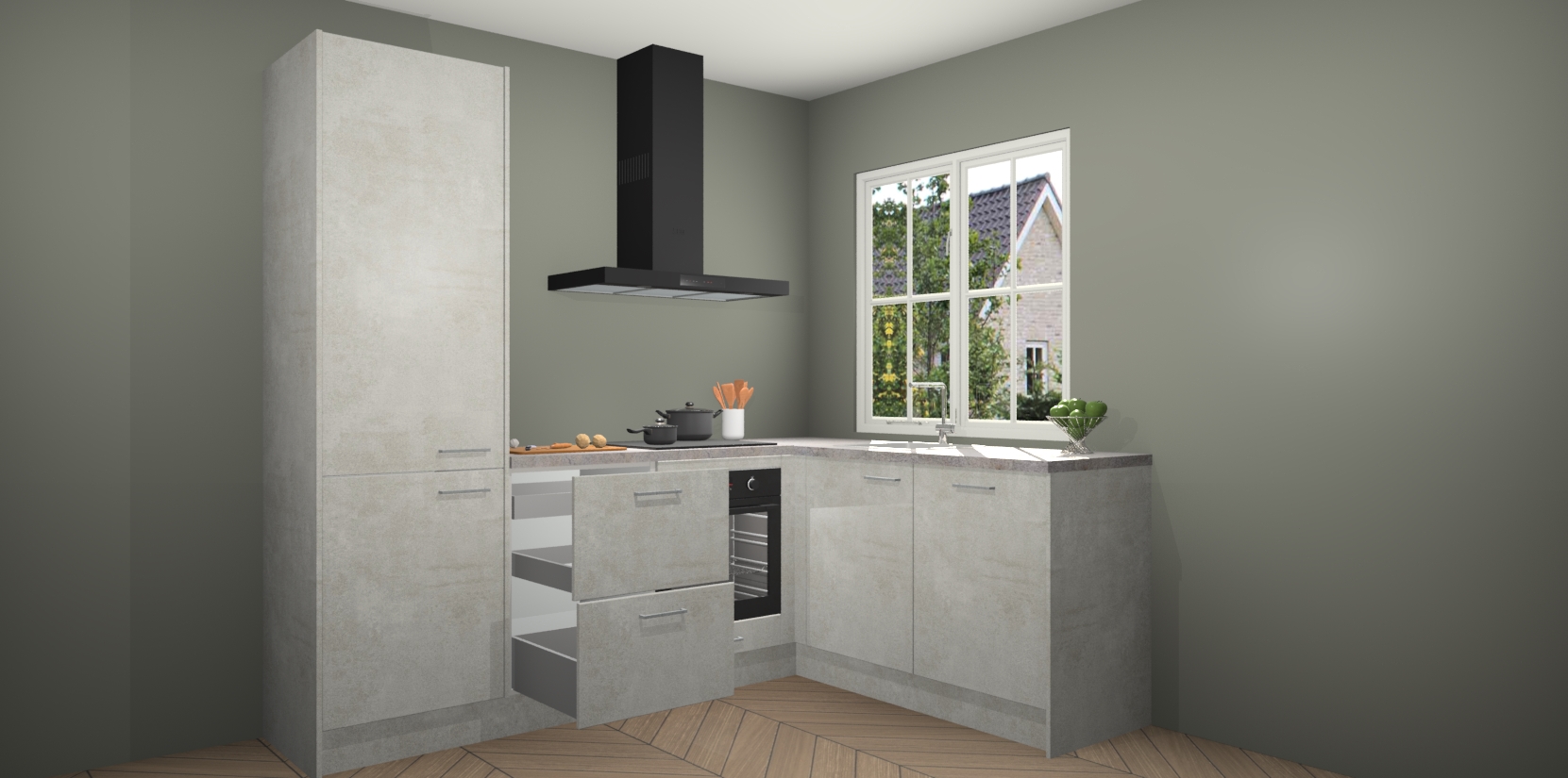 De Beton Opal keuken Linz is de perfecte keuze voor uw nieuwe moderne en tijdloze keuken. Ga voor moderne en tijdloze elegantie in uw keuken. De prachtige hoekkeuken biedt een verfrissende kijk op de manier waarop we ons vertrouwde keukenontwerp kunnen aanpassen in een nieuwe stijl. Één blik om alles te zien: zo mooi dat het bijna magisch lijkt.
