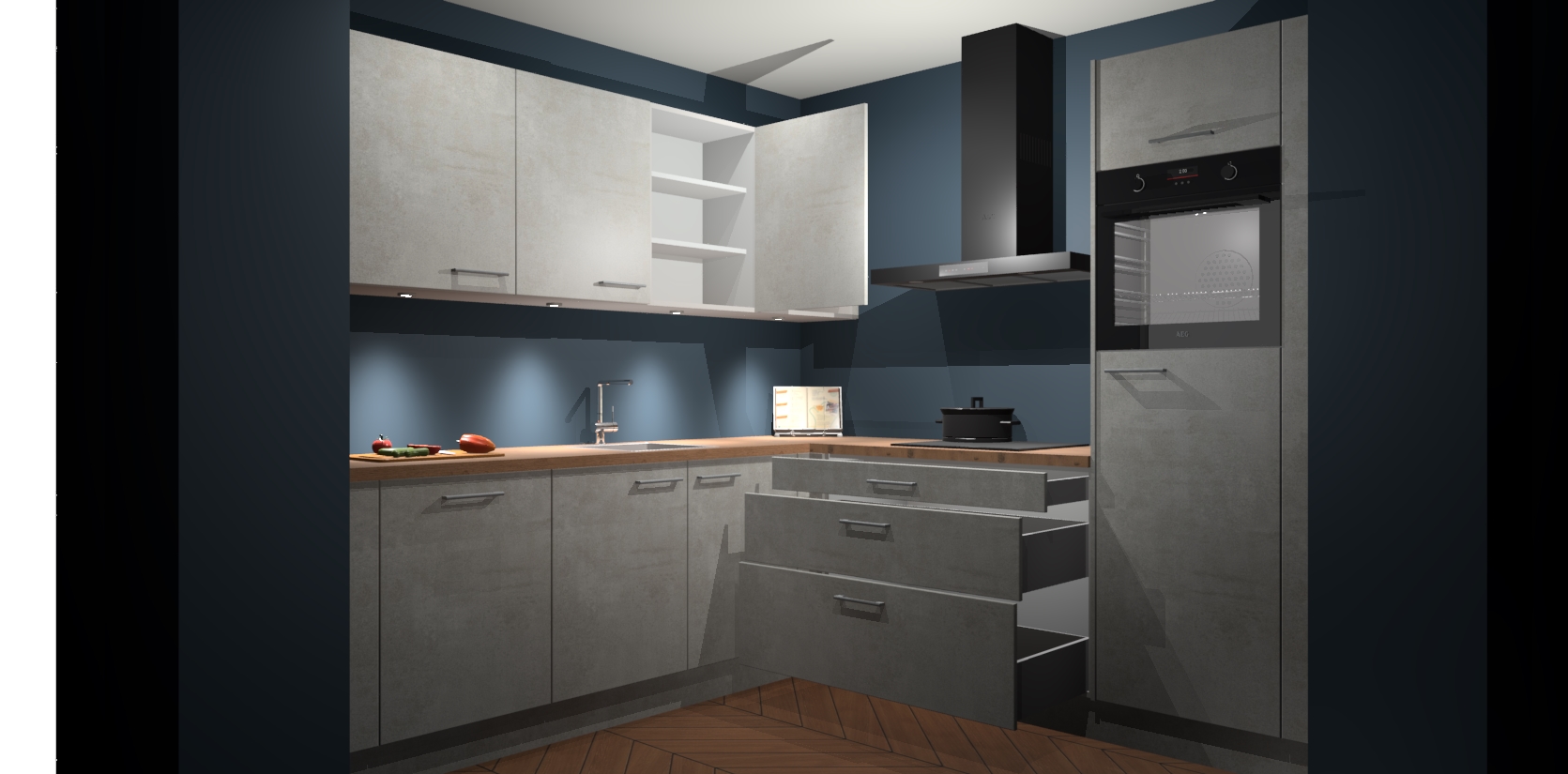 Met een modern, tijdloos design en ruime opslagruimte, zult u zich in no-time thuis voelen in uw nieuwe keuken. Uw leven wordt eenvoudiger met de soft-close deuren die voor het ultieme stille comfort zorgen - geen geluid dat u stoort terwijl u kookt. Ook is de keuken voorzien van 5 ingebouwde apparaten: een oven, inductie kookplaat, afzuigkap, vaatwasser en koelkast. Deze kunnen gemakkelijk na bestelling worden bijgewerkt naar AEG - waardoor uw luxe ervaring compleet is.