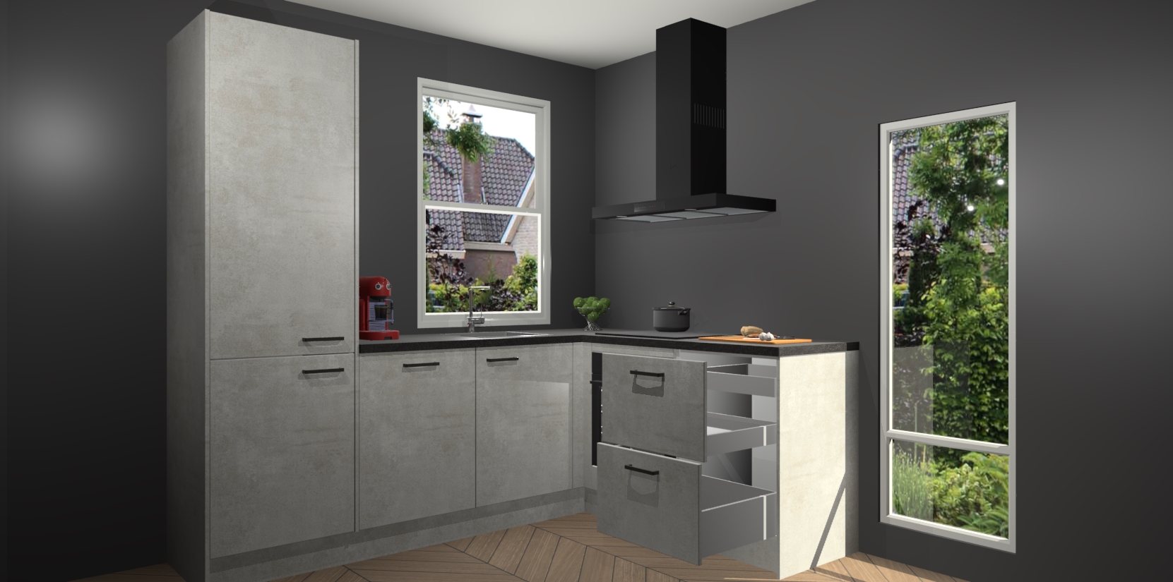 De Beton Opal keuken Phuket heeft alles wat u maar kunt wensen. Niet alleen zijn er softclose deuren, maar ook 5 ingebouwde apparaten: een oven, inductiekookplaat, afzuigkap, vaatwasser en koelkast - waarbij u later gemakkelijk naar het AEG merk, van inductiekookplaat naar kookplaat met geïntegreerde afzuiging of van oven naar combimagnetron kunt upgraden. Dat alles tegen een vast laag tarief! Bovendien geeft de Beton Opal keuken Phuket supersnelle levering van 7 weken. Echt iets voor u als u er niet op wilt wachten om het resultaat te zien in eigen keuken!