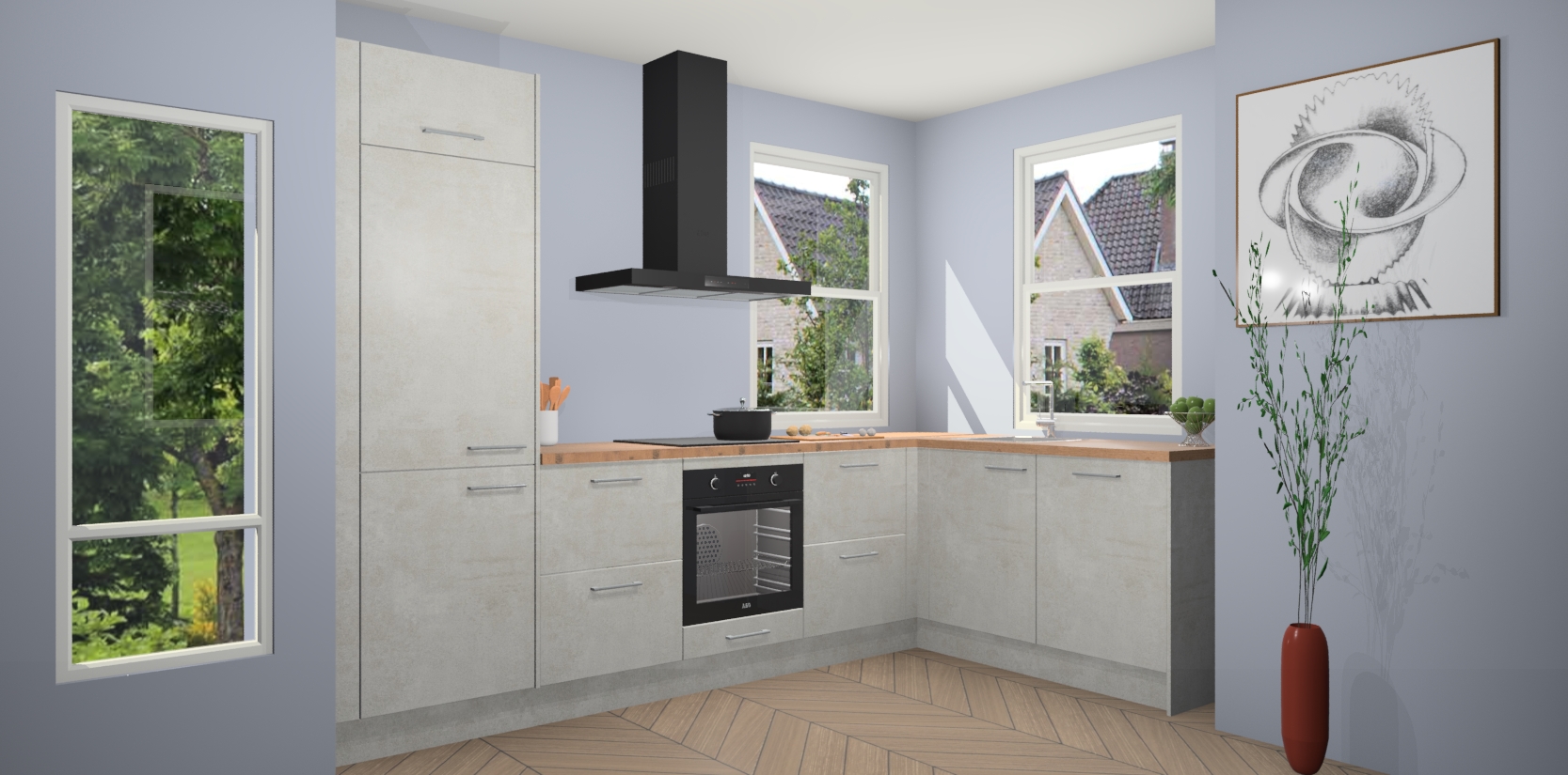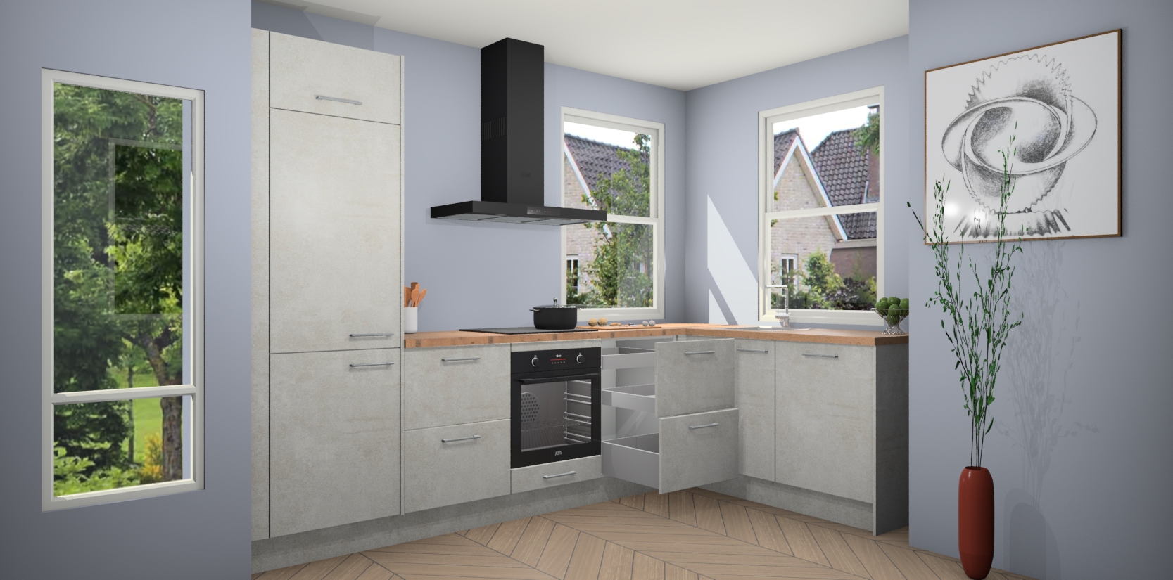 Wat maakt deze keuken zo bijzonder? Ten eerste geeft het houten werkblad uw ruimte een onmiskenbaar klassieke uitstraling. De natuurlijke afwerking roept warmte en elegantie op die nooit uit de mode zullen raken. Bovendien is het gemakkelijk schoon te houden en te onderhouden, zodat je er jarenlang plezier van kunt hebben. Als u op zoek bent naar extra gemak in uw keuken, dan heeft u bij het plaatsen van een bestelling bij ons ook de optie om uw toestellen te upgraden naar AEG-modellen - zo haalt u moderne innovatie van topmerken in apparatentechnologie rechtstreeks in huis.