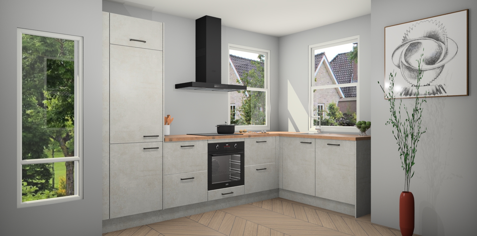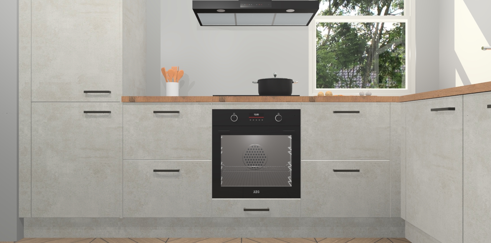 Wat maakt deze keuken zo bijzonder? Ten eerste geeft het houten werkblad uw ruimte een onmiskenbaar klassieke uitstraling. De natuurlijke afwerking roept warmte en elegantie op die nooit uit de mode zullen raken. Bovendien is het gemakkelijk schoon te houden en te onderhouden, zodat je er jarenlang plezier van kunt hebben. Als u op zoek bent naar extra gemak in uw keuken, dan heeft u bij het plaatsen van een bestelling bij ons ook de optie om uw toestellen te upgraden naar AEG-modellen - zo haalt u moderne innovatie van topmerken in apparatentechnologie rechtstreeks in huis.