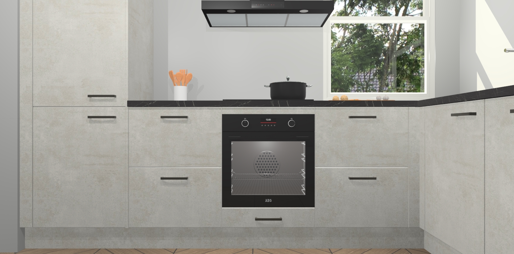 Wat maakt deze keuken zo bijzonder? Ten eerste geeft het houten werkblad uw ruimte een onmiskenbaar klassieke uitstraling. De natuurlijke afwerking roept warmte en elegantie op die nooit uit de mode zullen raken. Bovendien is het gemakkelijk schoon te houden en te onderhouden, zodat je er jarenlang plezier van kunt hebben. Als u op zoek bent naar extra gemak in uw keuken, dan heeft u bij het plaatsen van een bestelling bij ons ook de optie om uw toestellen te upgraden naar AEG-modellen - zo haalt u moderne innovatie van topmerken in apparatentechnologie rechtstreeks in huis.