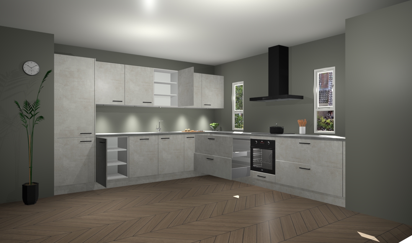 De beton opal keuken is een ideale hoekkeuken en heeft alle functies en apparatuur die u maar nodig kunt hebben. Bij de bestelling krijgt u een oven, inductiekookplaat, afzuigkap, vaatwasser en koelkast - deze kunnen desgewenst eenvoudig worden uitgebreid naar AEG na bestellen. Elke kast wordt ook voor gemonteerd geleverd met soft close deuren die jarenlang gebruik beloven. Stelt u zich voor dat u geen gedoe heeft met vervelende montage - vanaf het moment dat u uw bestelling plaats, duurt het slechts 7 weken voor het bij u thuis geleverd wordt.